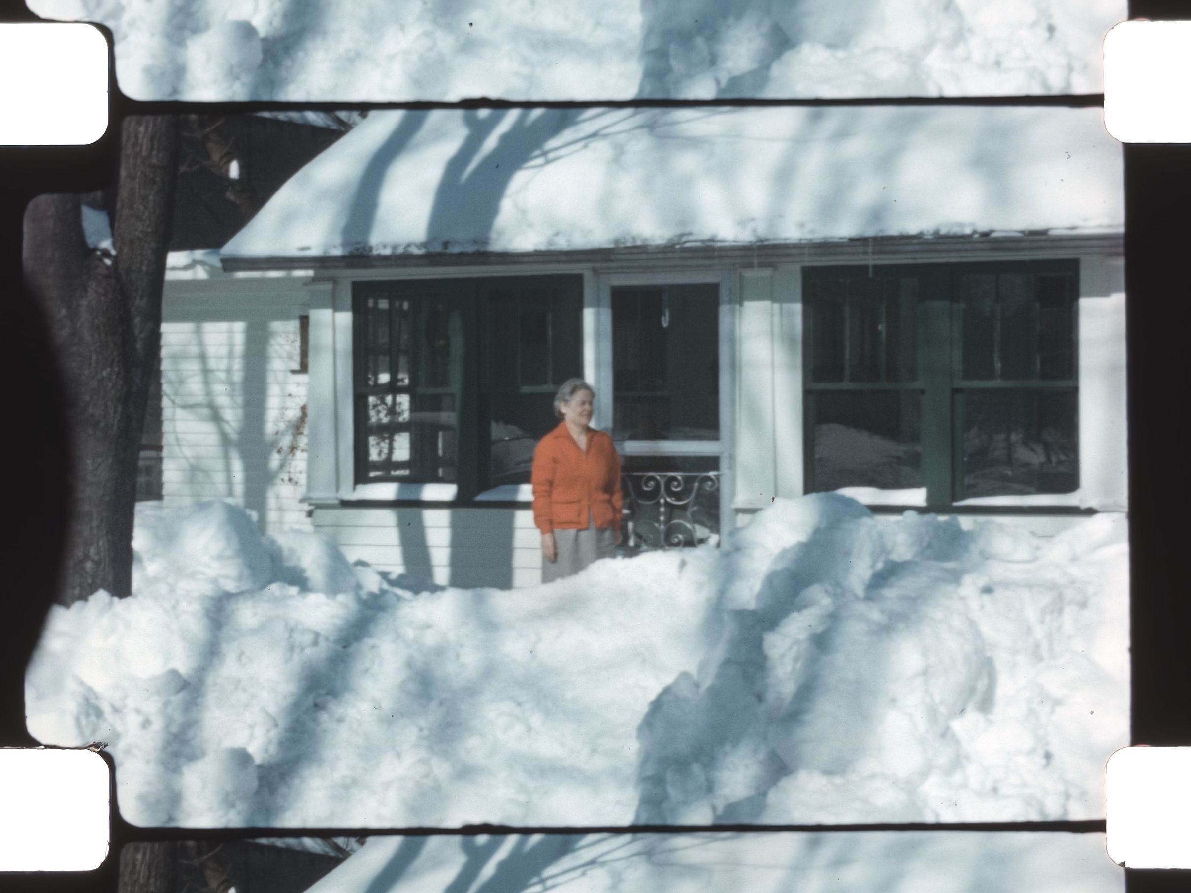 woman stands outside a home with snow piled around