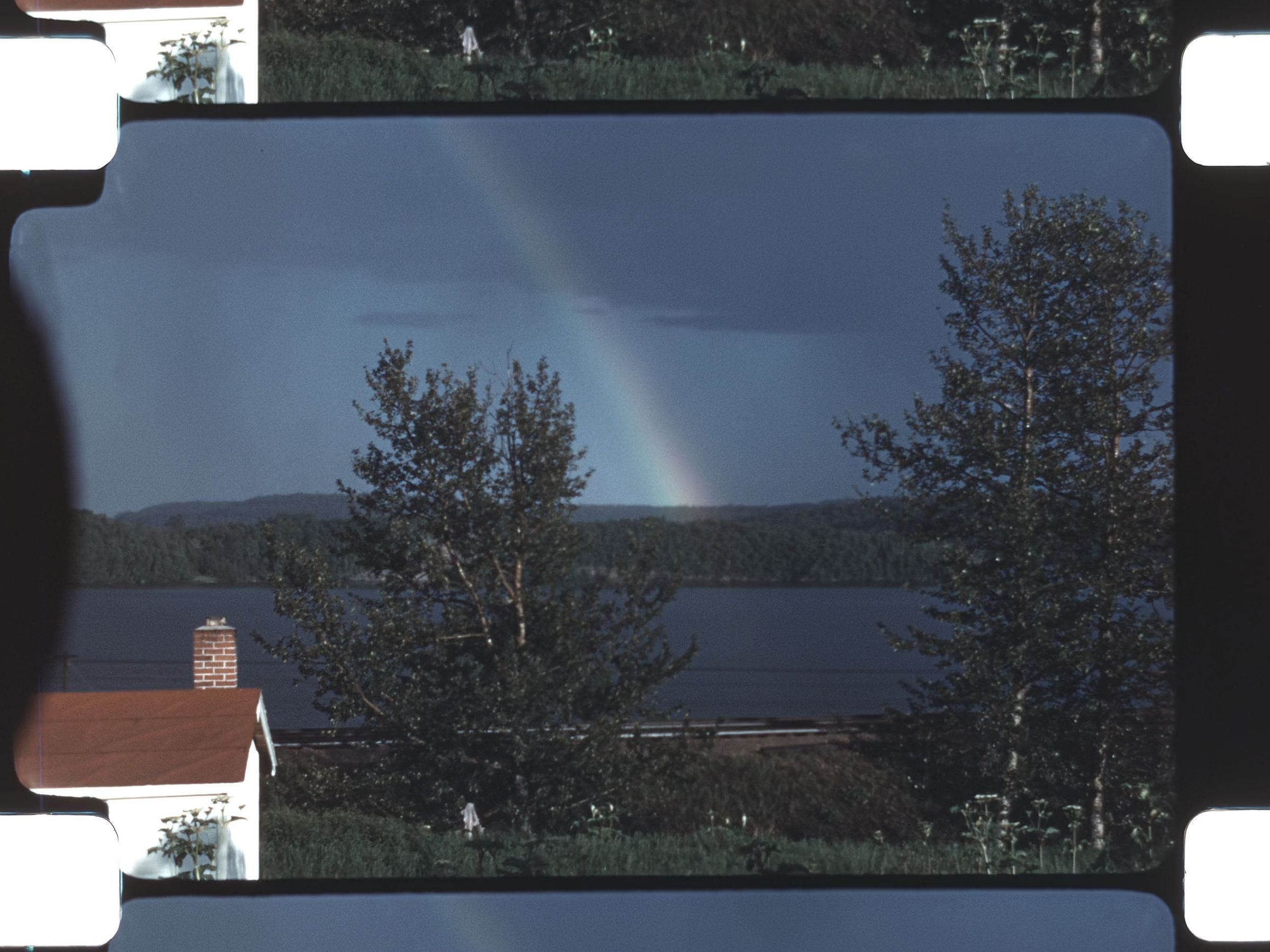 a rainbow in the distance of a little town
