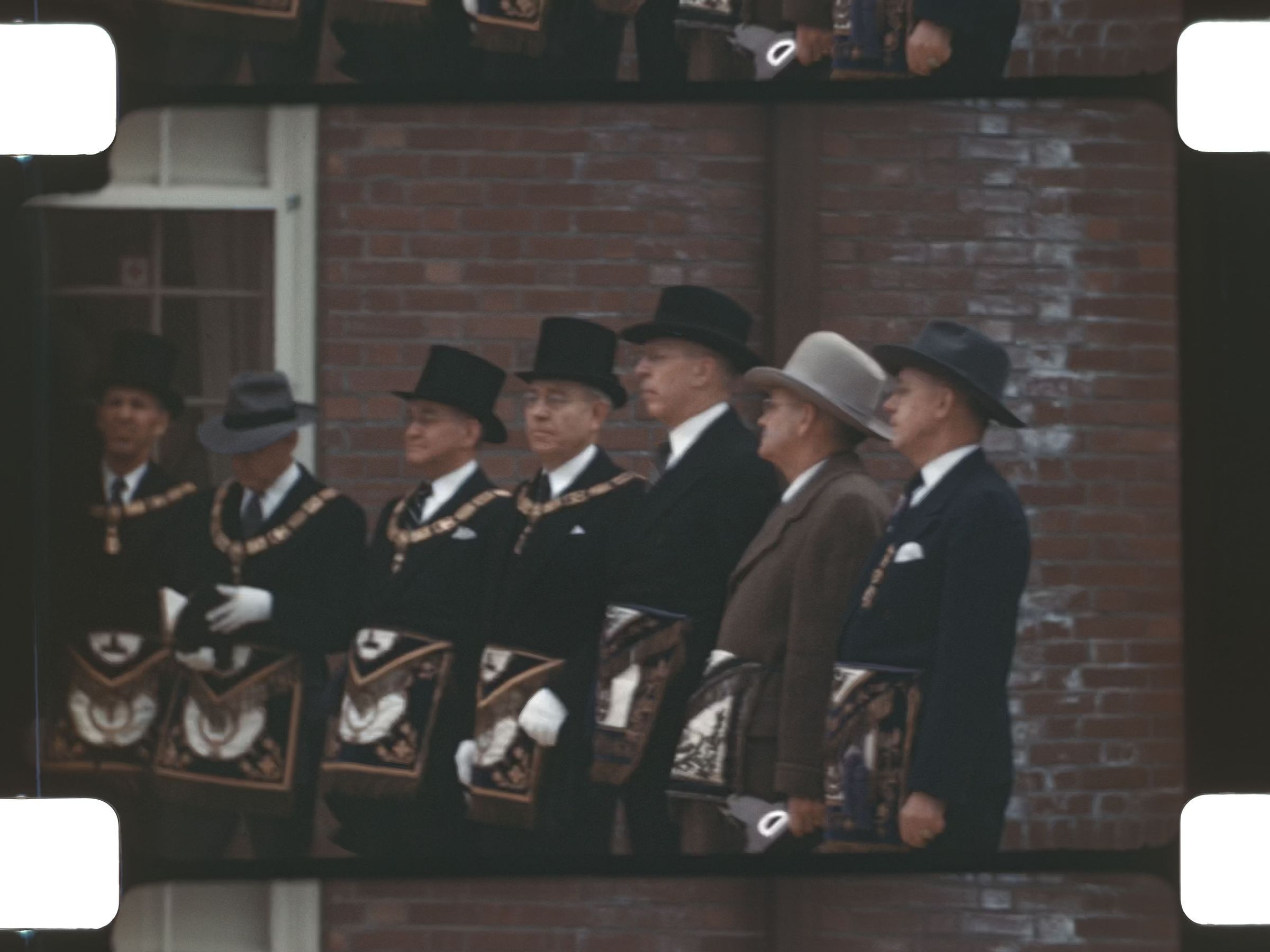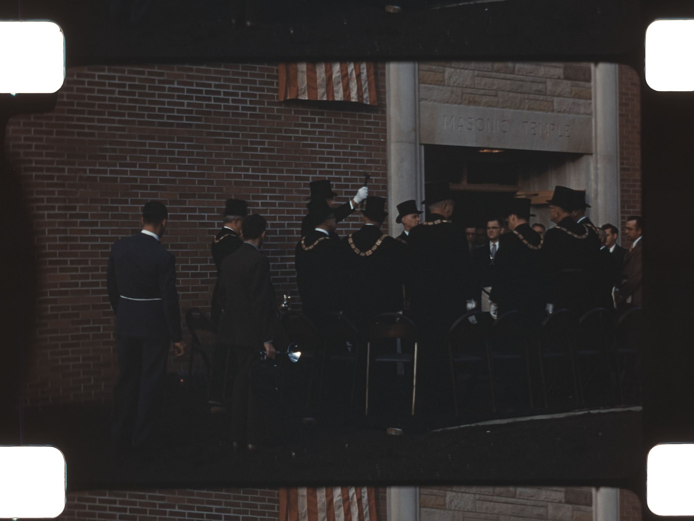 men in ceremonial attire outside a Masonic Temple