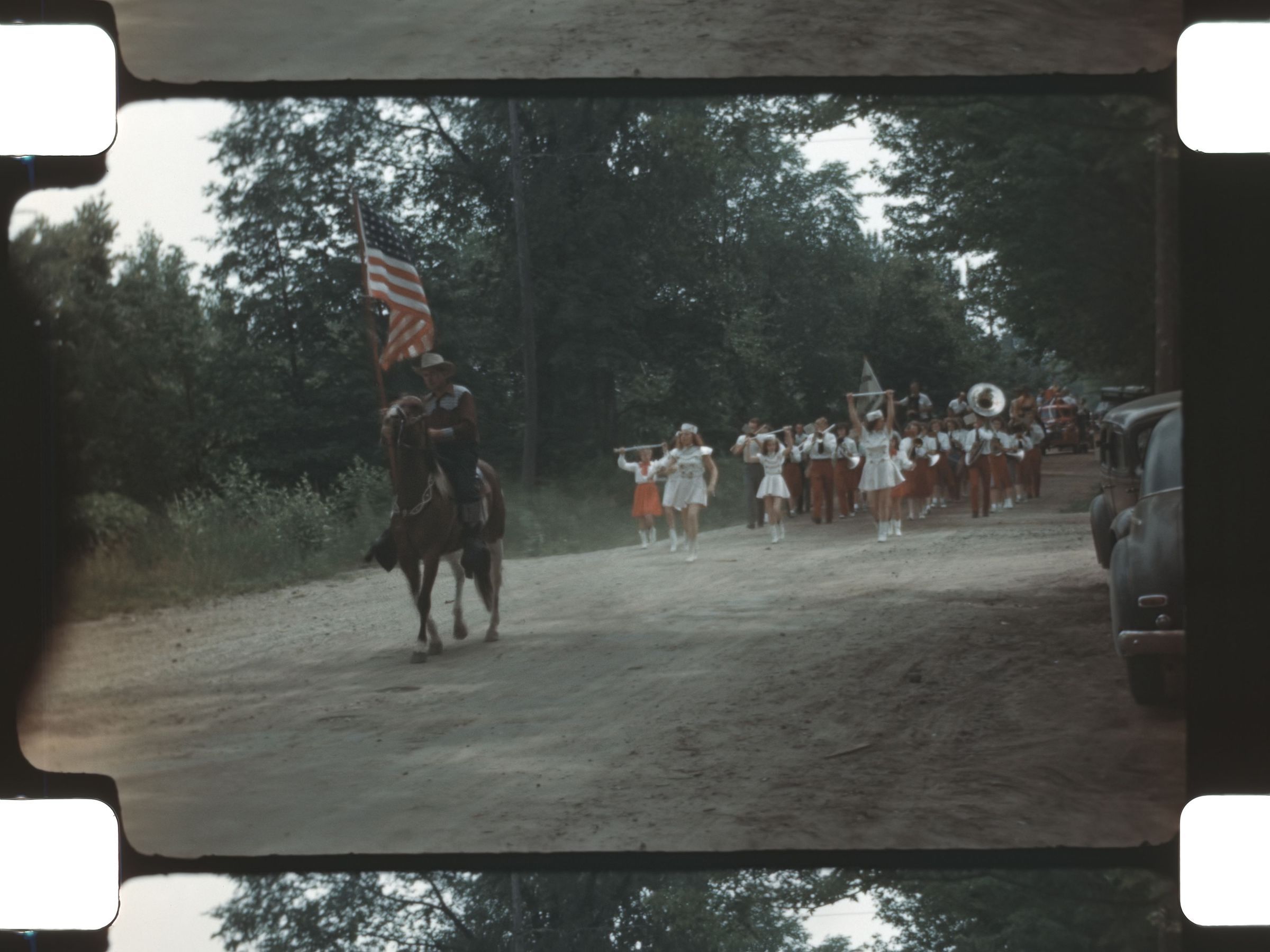 parade with a marching band and people riding horses