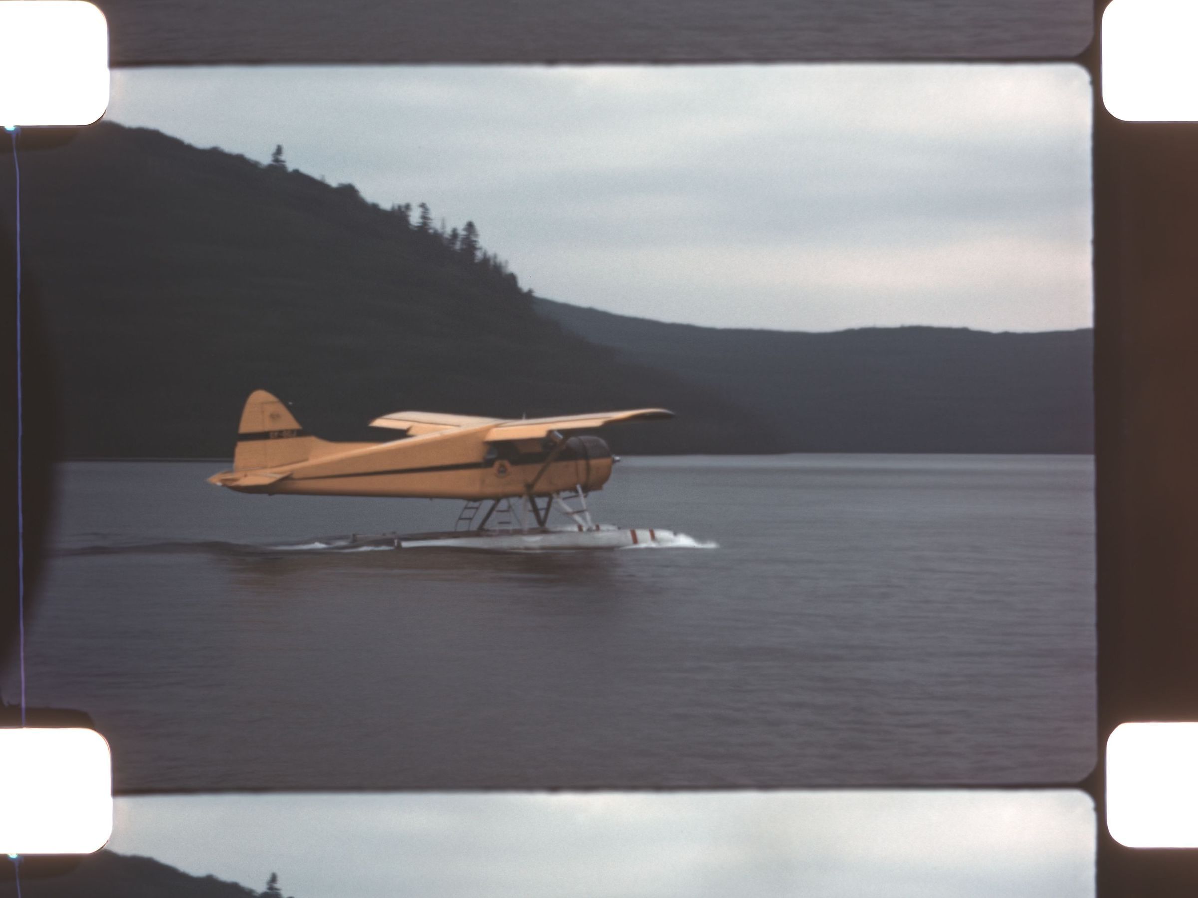 plane taking off from mountain lake
