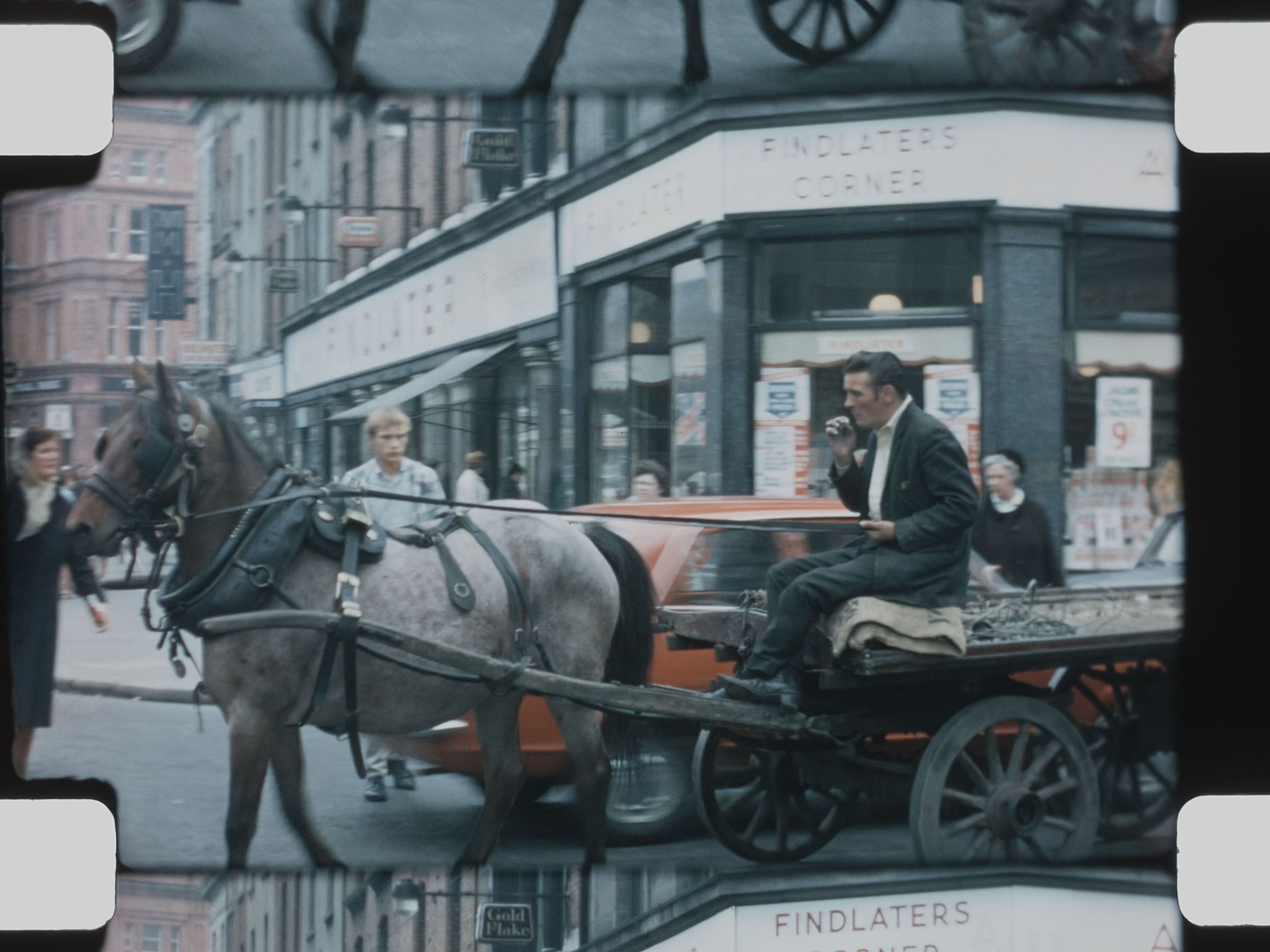 a horse drawn wagon on a busy city street