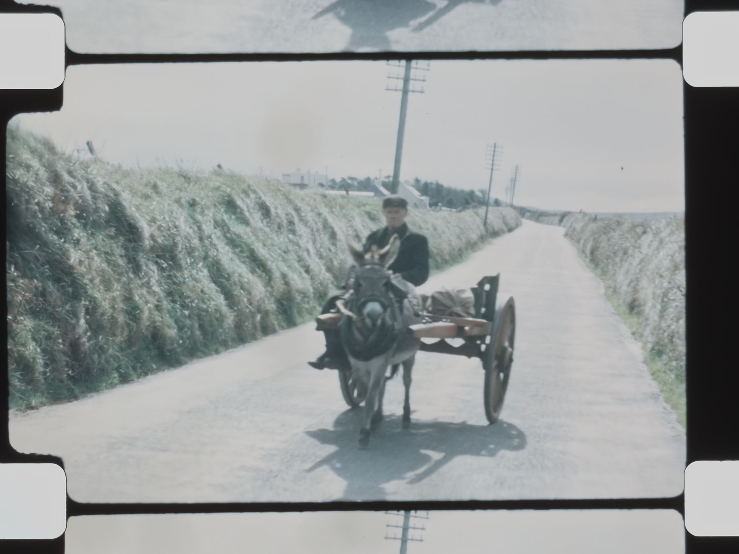 a donkey pulls a cart on a country road