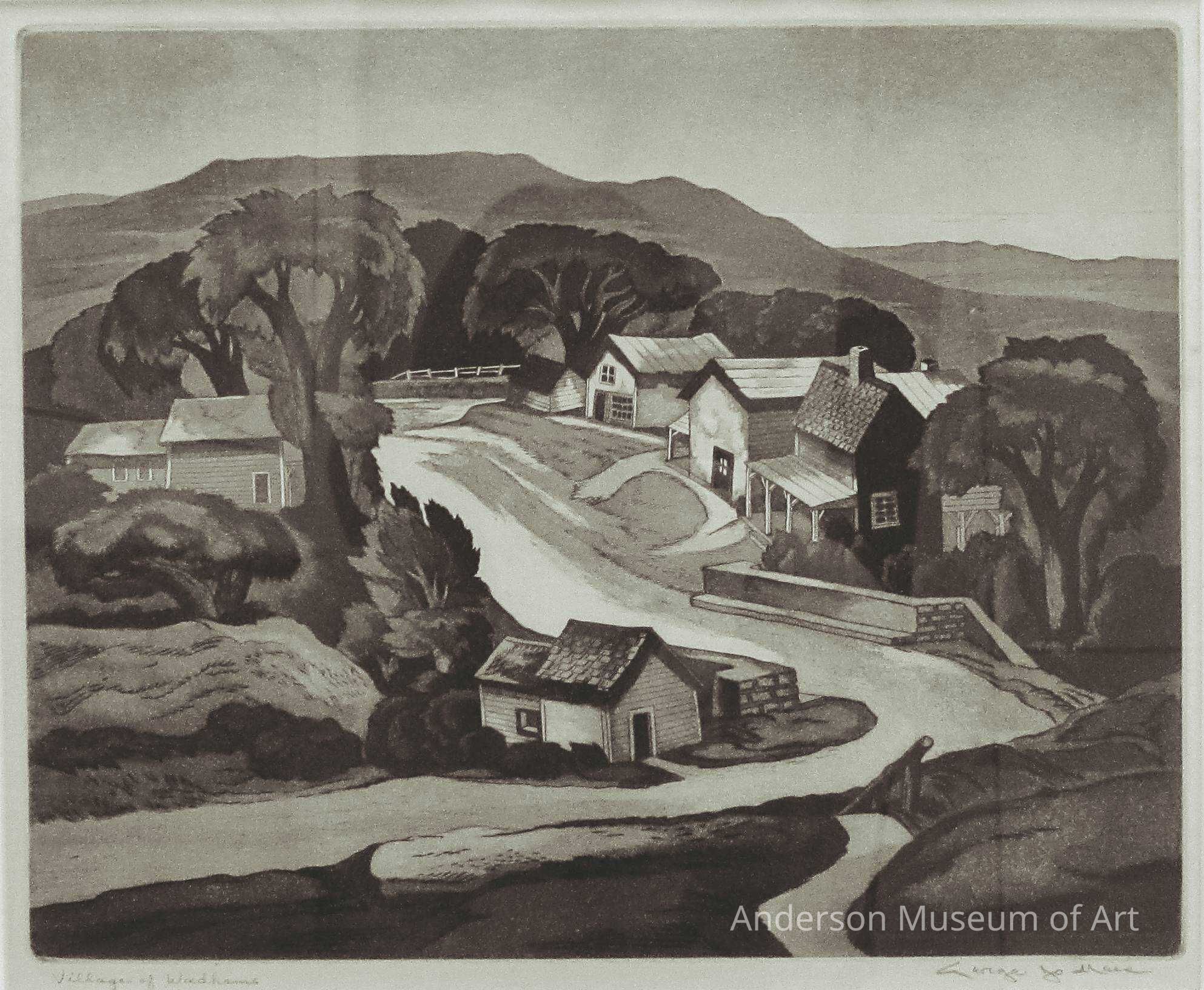 Etching and aquatint in black ink on white textured paper; signed "George Jo Mess" in pencil below the image to the right. The title is written in pencil in the lower left corner "Village of Wadhams." The image depicts a grouping of buildings (five) that vary in style and trees with a road in the foreground curving through the center of the grouping towards the left. A footpath with hand railing is in the immediate foreground. Mountains and possible lake or ocean (to the right) in the background with sky.Collection