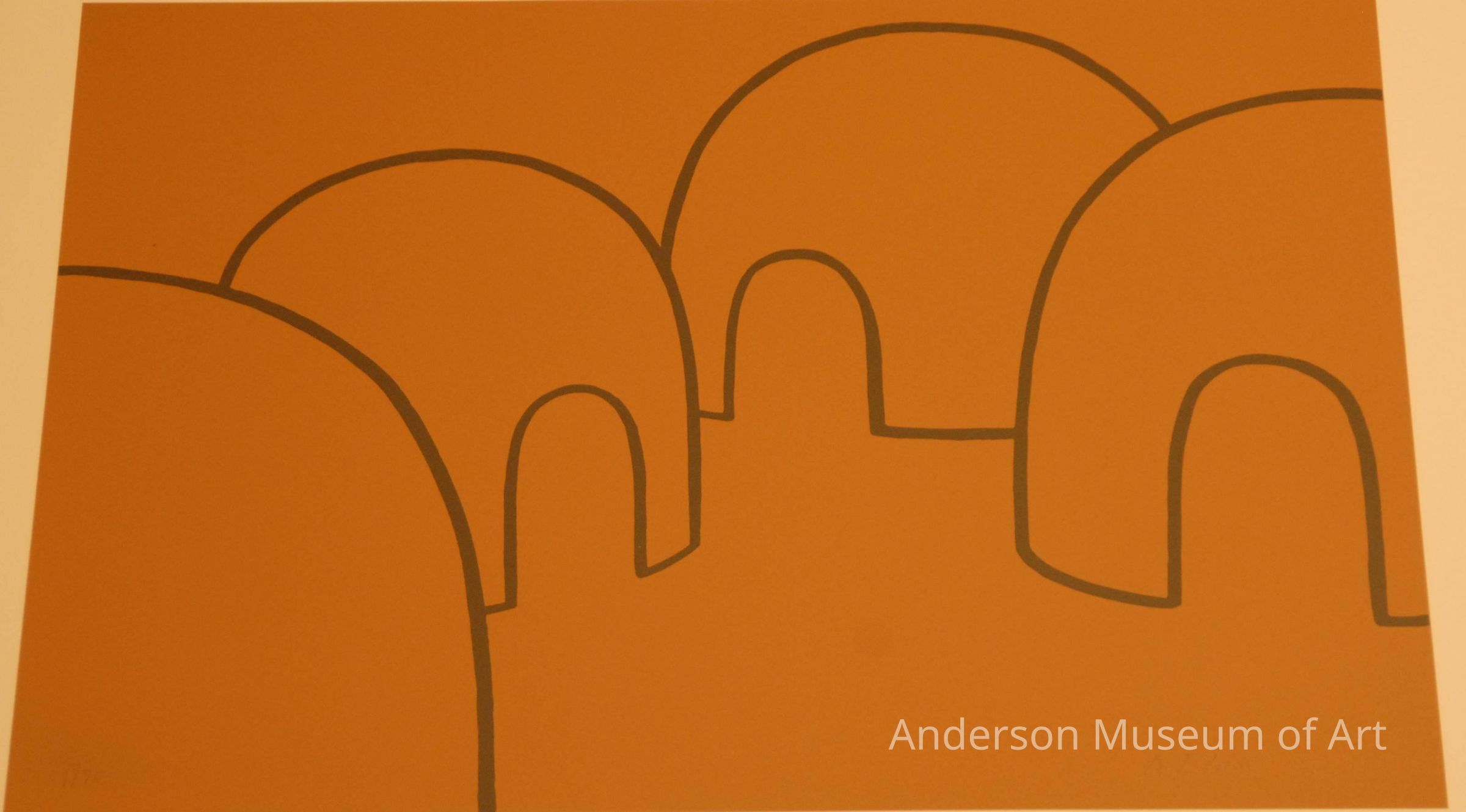 Four domed shapes with arched openings. The domes overlap one another with only the top showing on the bottom left dome. Everything is orange with the outlines of the domes made of black lines. Print 1/70.Collection