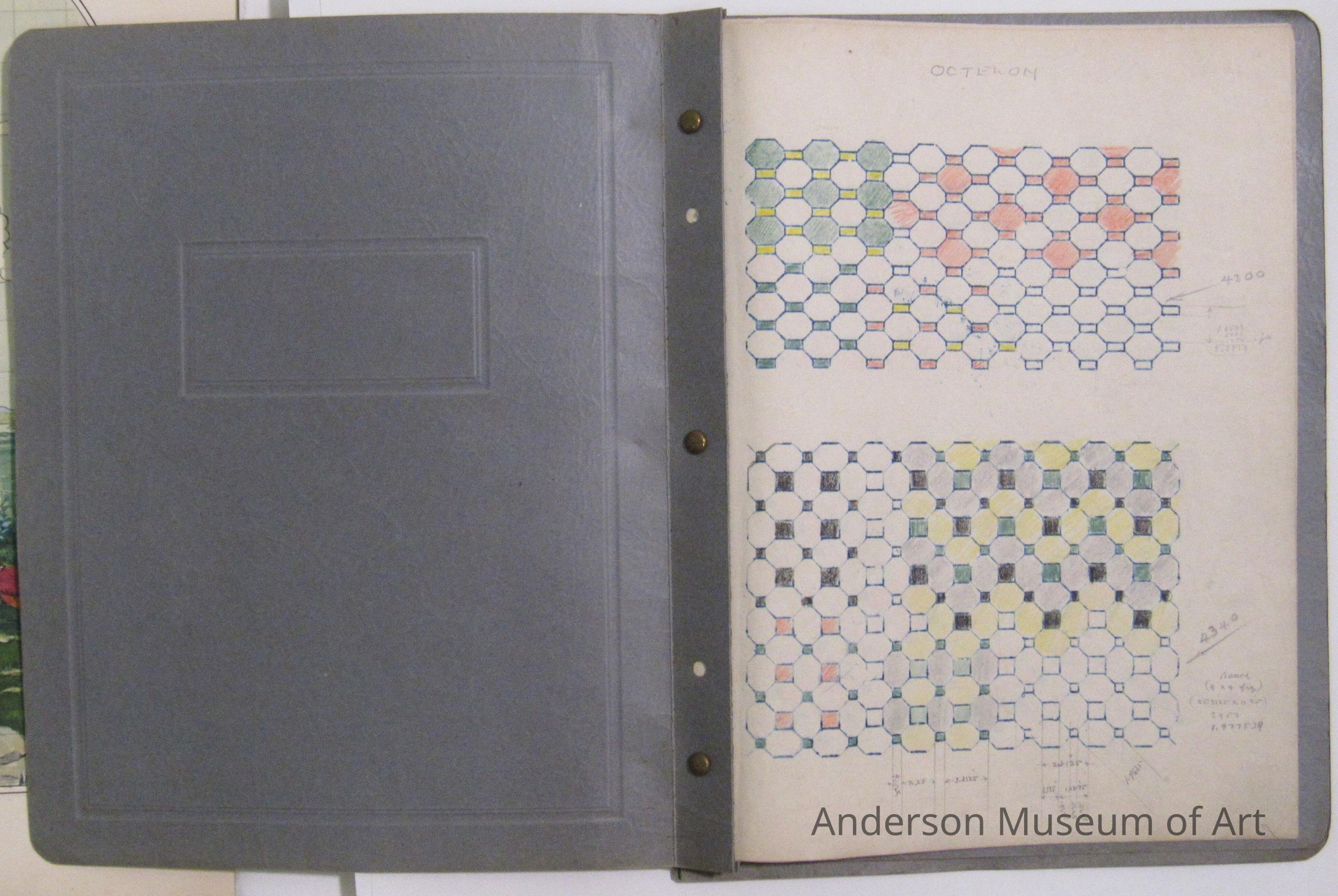 Grey notebook filled with tile designs and patterns. Some designs are annotated with dimensions, etc. The first page has two areas. The top has nine green filled tiles and pink filled tiles to the right. Top reads "OCTELON". Bottom has purple and yellow design with black and green centers.Acquisition
