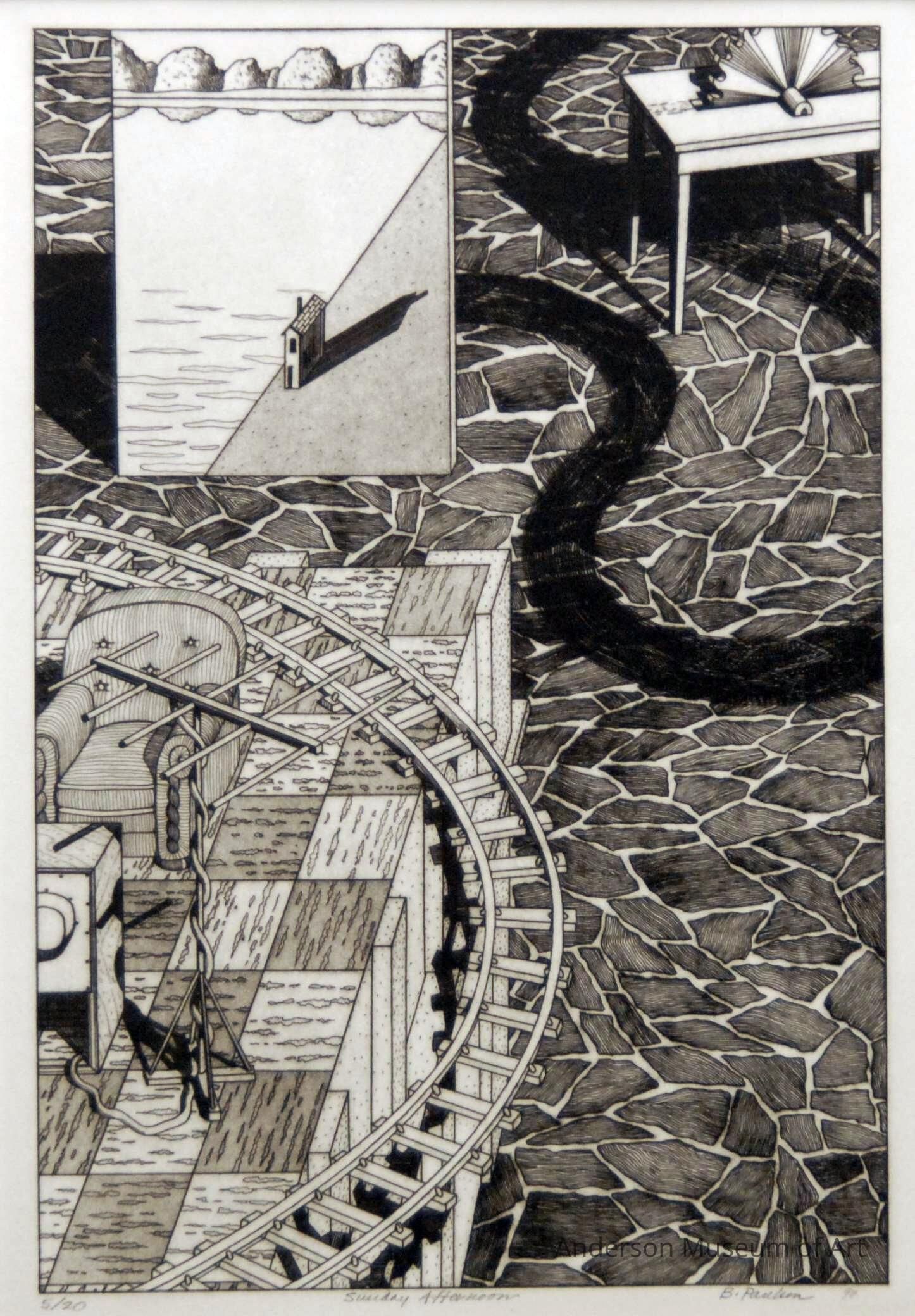 The bottom left is a checkerboard on some blocks. On top of the board are a train track, an antenna hooked to a tv, and a chair. Behind this is a rectangular image of a really skinny house next to a lake. There is a black winding shape in the upper right corner that winds under a table saw. The ground is made of stones. Print 5/20.Collection