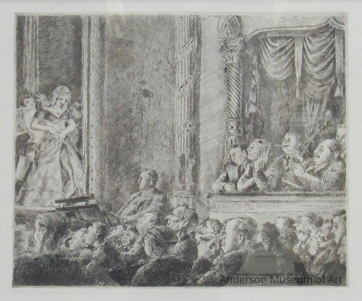 A scene on the inside of a theatre--an audience composed of men sitting in the front rows (along the bottom of the print) a box seat section on the right side with five male figures. The left side is the stage area with several female figures on in. The main female figure has a theatrical costume on, long light hair, hands holding front of skirt. The figure behind her seems to be going off stage. Warm black ink and slightly off-white color. Print 5/100.Acquisition