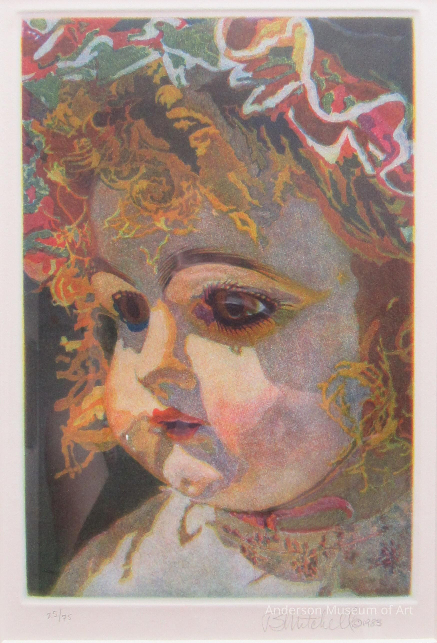 This print is of a girl or a doll's head. She is facing the left. She has blonde, curly hair with a wreath of flowers. Around her neck is cutwork lace. There is light coming in from the lower left creating shadows along the right. Print 25/75.