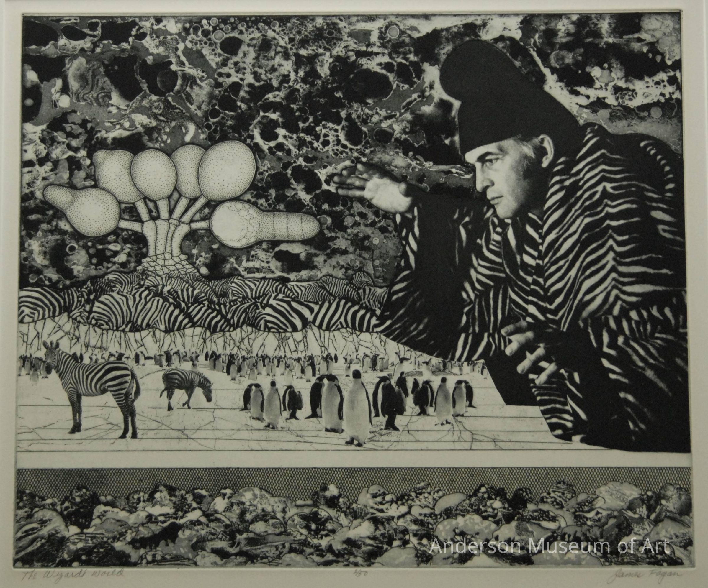 Etching in black on white paper. Image depicts a large figure of a man in a zebra skin robe and a black hat with outstretched hands which dominate the right side of the composition. The wizard is looking over a group of penguins which stand on a cracker surface 1/3 up in the comp. To the left of the penguins are two zebras. Above the penguins the backs of zebras in a herd are visible, with a large plant like form above and behind them. In the background is an aqua tinted atmosphere of very textured quality. Below the plane with the penguins upon it, appears a criss-crossed pattern (like a chain link fence) and below this appear several textured "rock" forms. The print is titled in pencil, "The Wizard's World" below to the left of the image and is numbered 2/50. Signed James Fargan.Collection