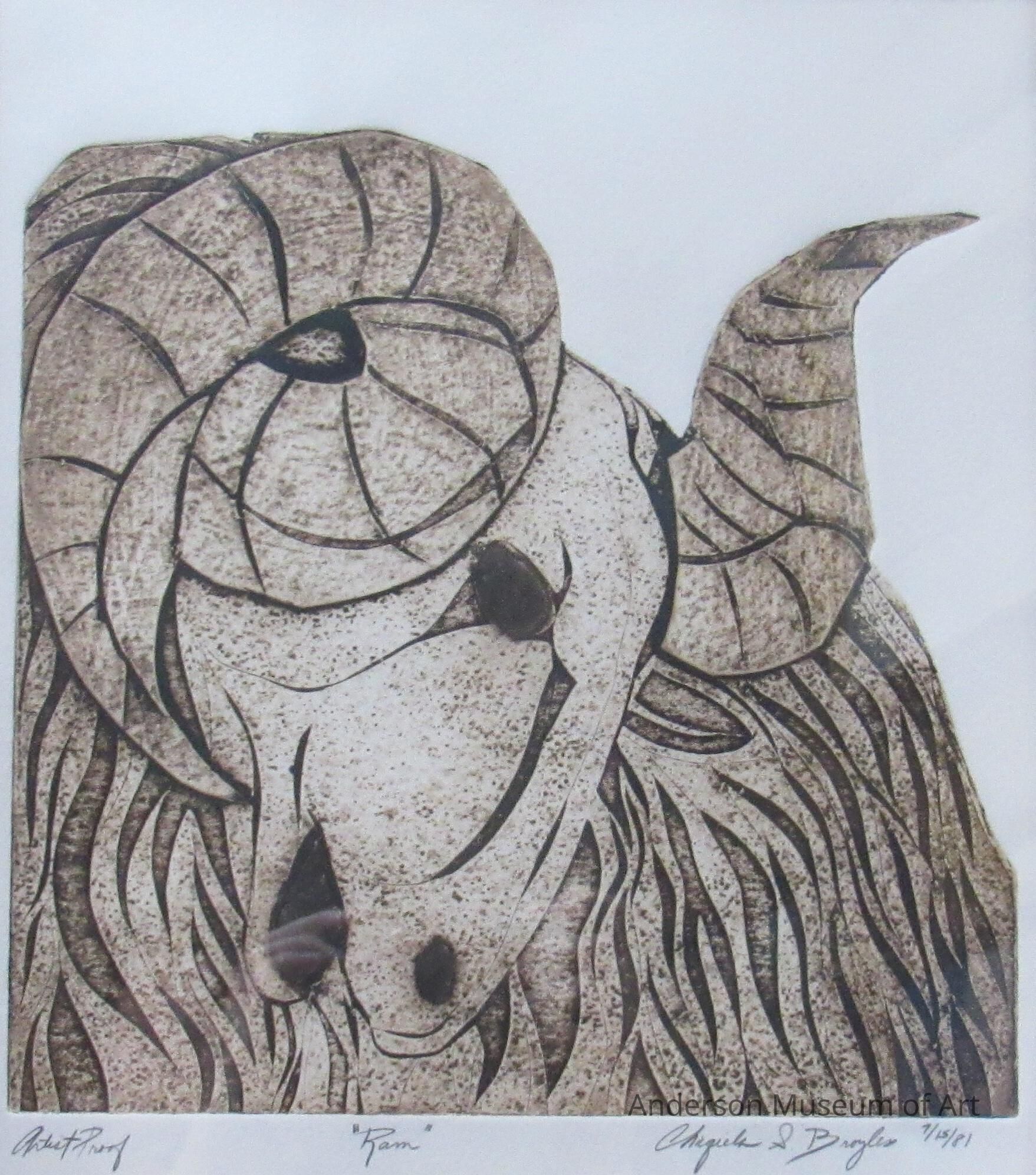 Artist's proof. Head of a ram--side view in brown ink. The top half and right side are completely white. Ram is looking downward with his right horn curled and the left horn pointing upward. Artist proof signed and dated in the lower right corner, "Chicquiela S. Broyles 7/15/81".