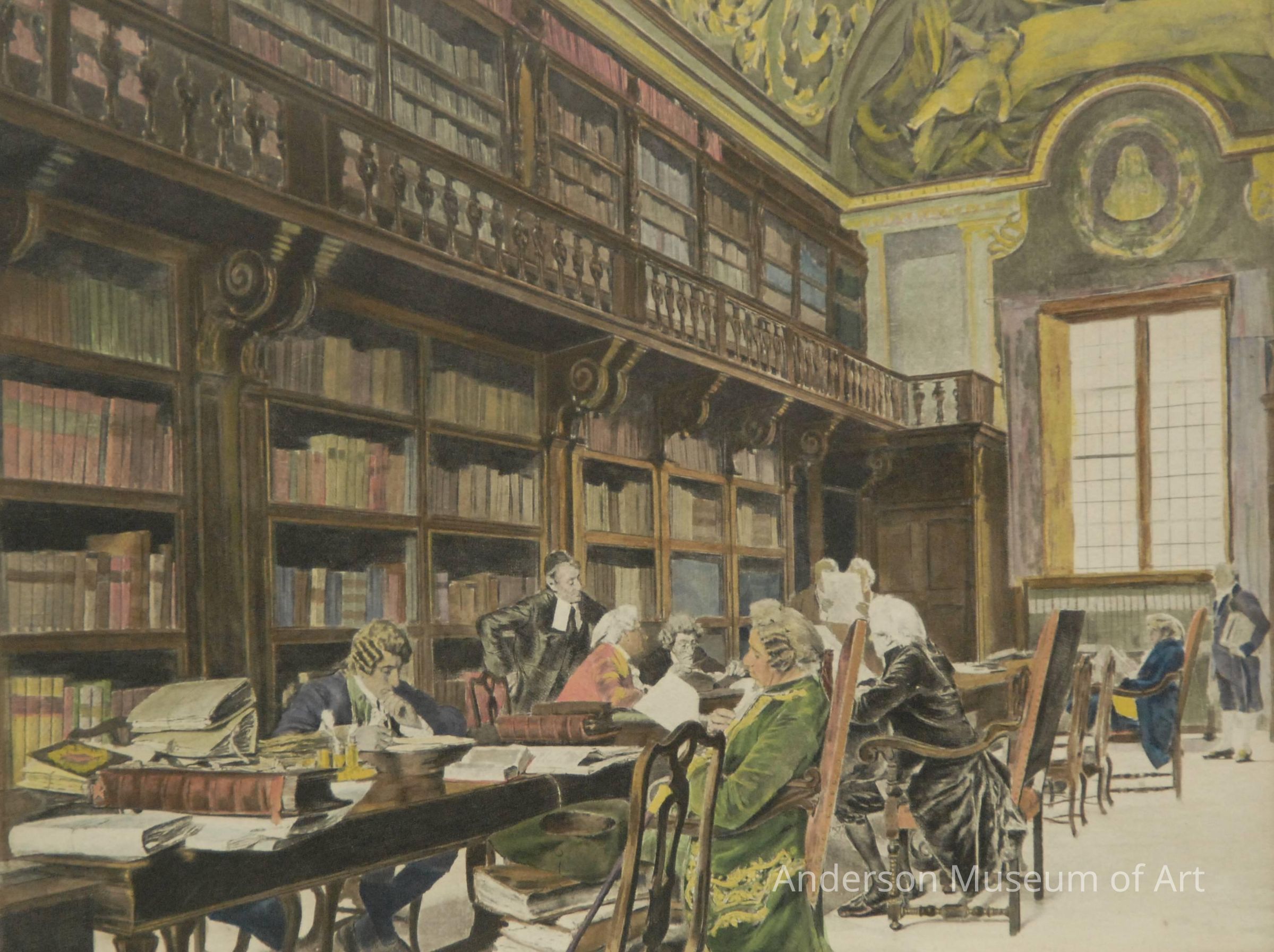 A library with colonial men sitting at a table, reading and/or researching individually. Along the left side at an angle is a wall of books with a second level. At the right is a large window looking over the table. There are ten men around the table. This is a hand colored engraving with a range of different colors visible. Signed in the lower right corner, "Elice Empie / 24". Text at top center reads "Copyrighted 1894 by J.B."