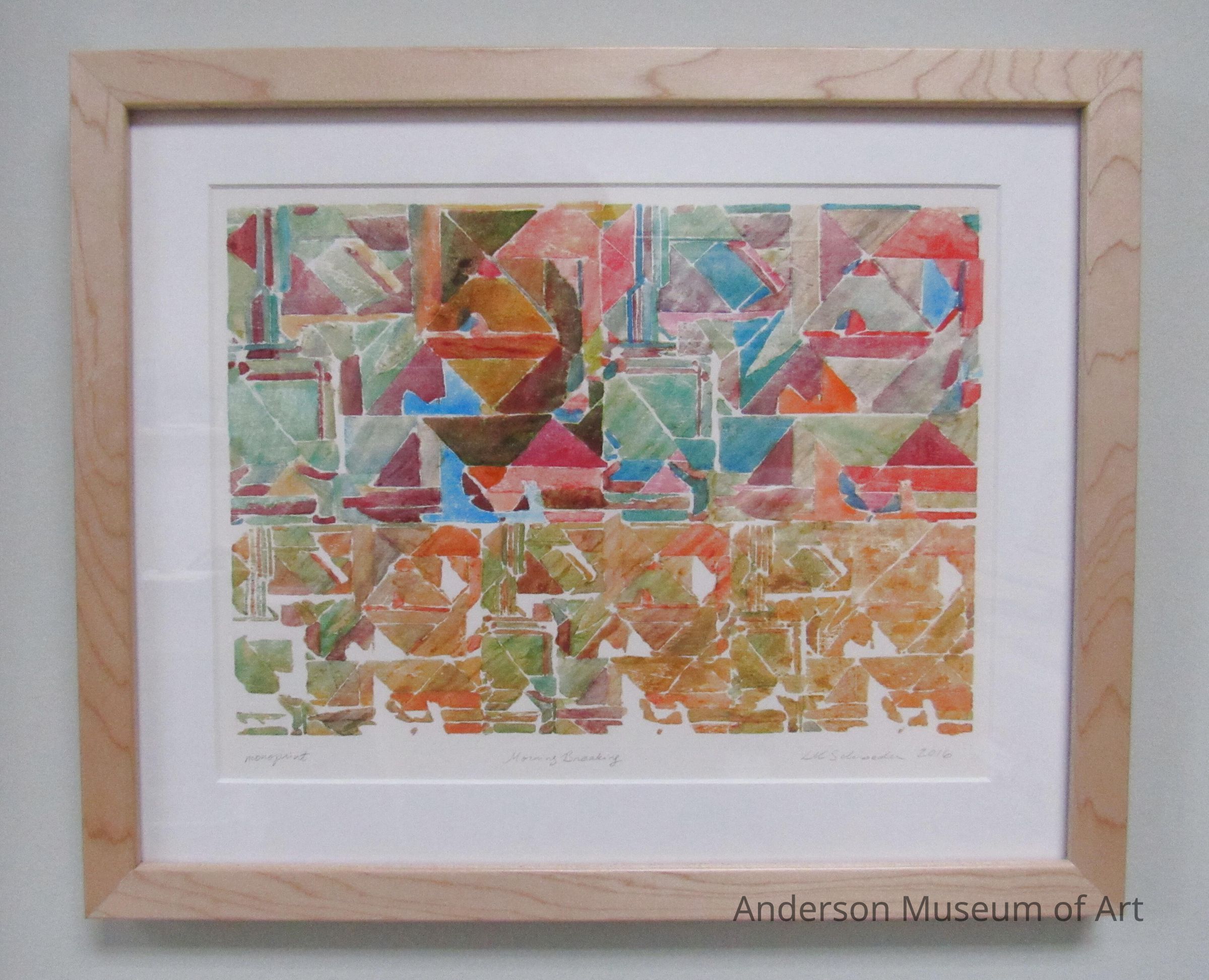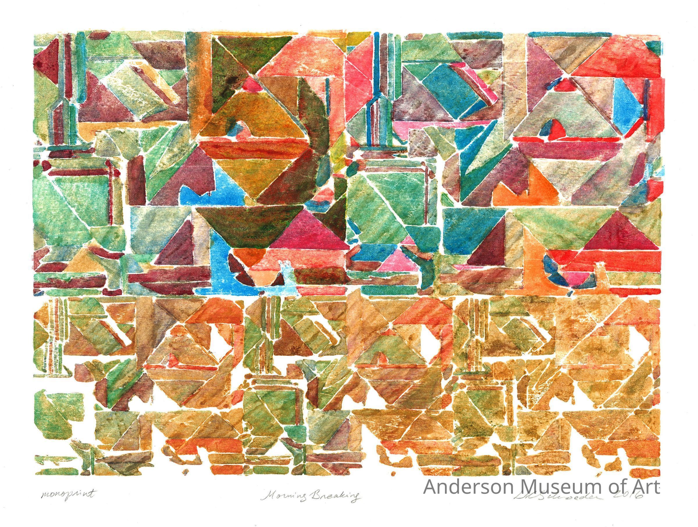 White-line woodcut/monoprint. Colorful, abstract seascape. The image is made up of shapes placed together like a puzzle with various white lines separating the shapes. These shapes include triangles, rectangles, trapezoids, etc. The bottom half of the image is colored in oranges, browns, and greens. This area represents the water with the morning sun reflecting its light. Above the horizon line are various sail boat shapes with the majority having a maroon color sail. The rest of the shapes in this top half are colored in blues, teals, reds, oranges, and greens. Signed LK Schroeder 2016" in pencil in the lower right corner.Collection