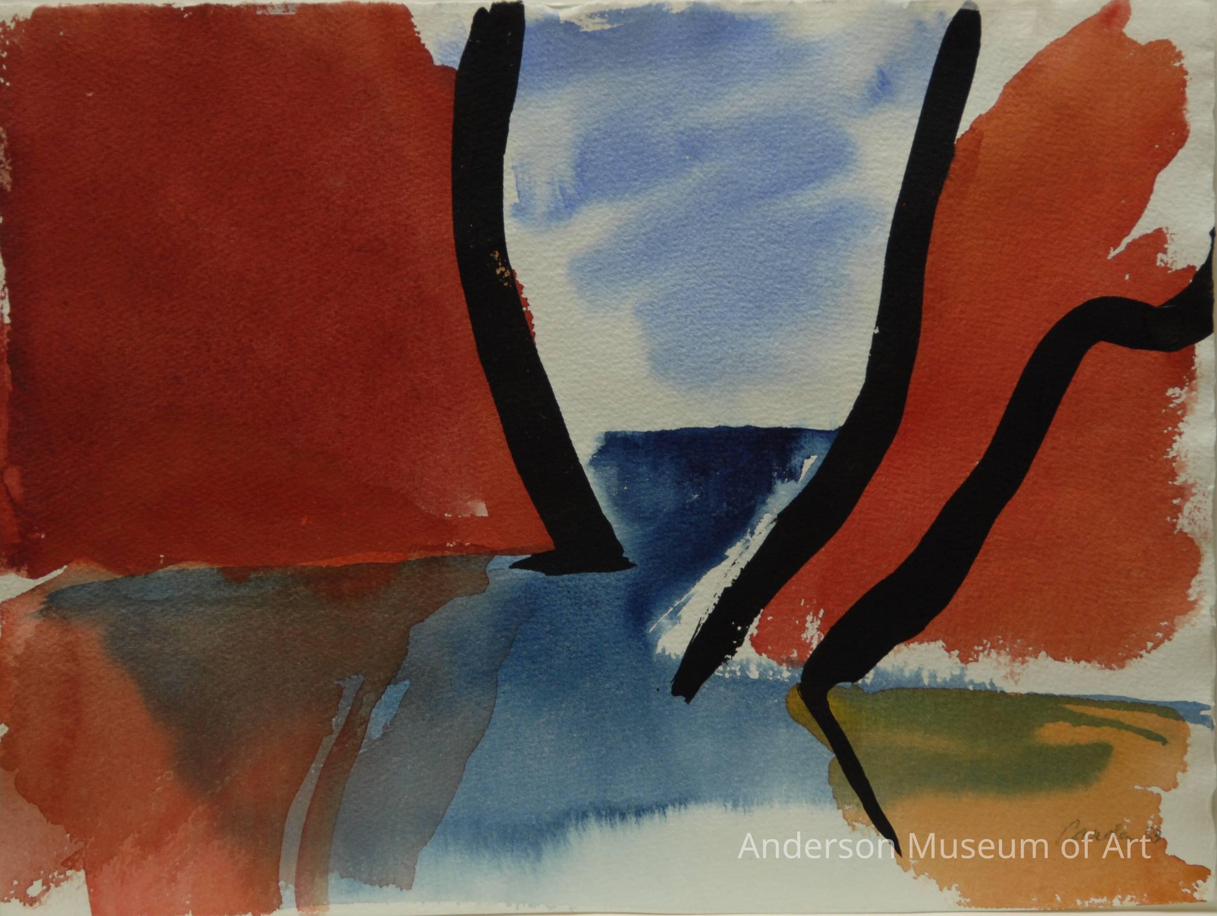 A Matisse-like landscape. An abstract landscape of what could be water between two red shores of land. Broad black brushstrokes create the vertical boundaries between the shoreline, sky, and water. There is a tinge of reflection in the water near the foreground created by diluted and bleeding watercolor.Type of Painting