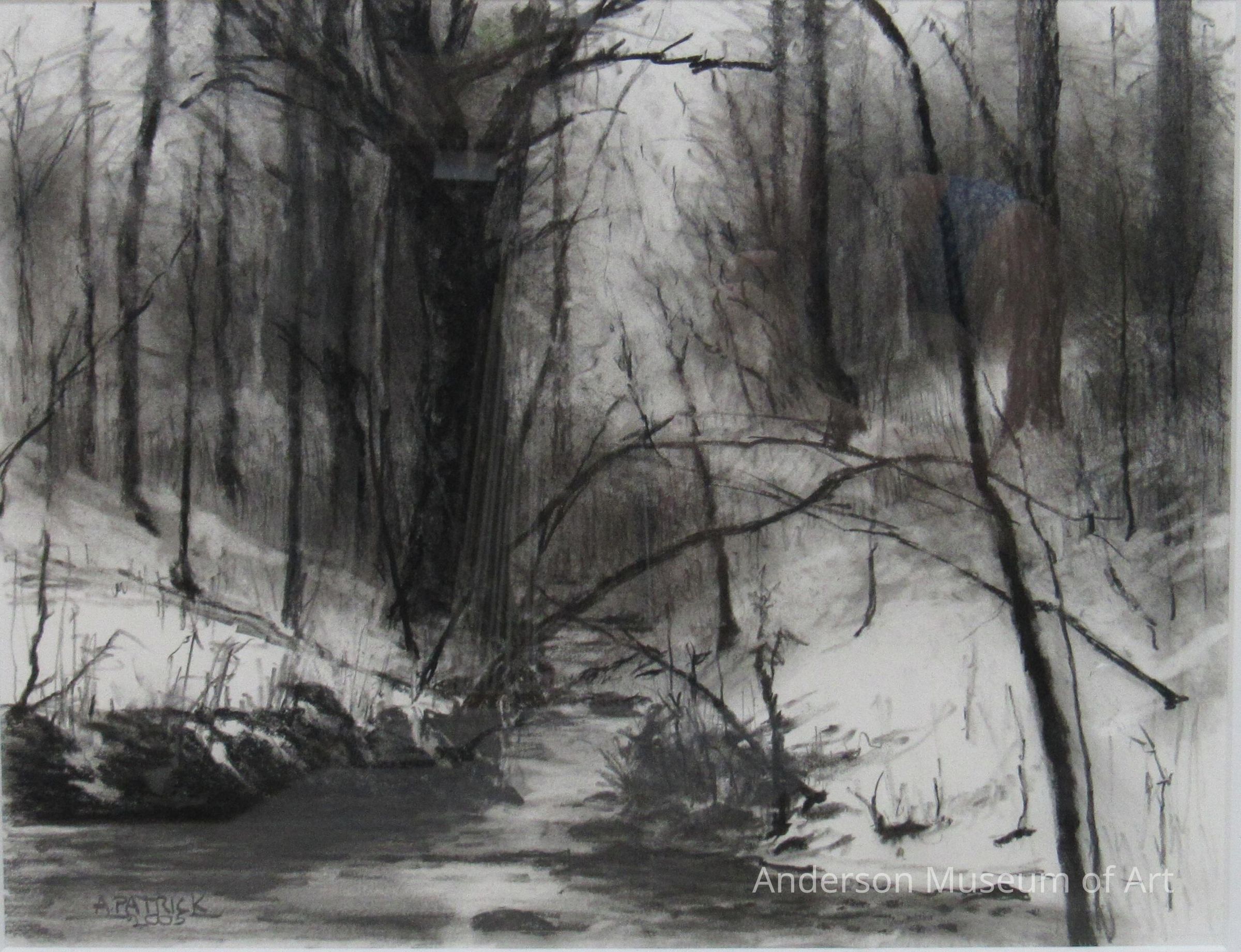 Charcoal drawing of a snowy winter scene in a forest. The forest is filled with thin, bare trees. In the center, there is a thicker tree. A creek winds up the center. The image is made up of thin charcoal marks.