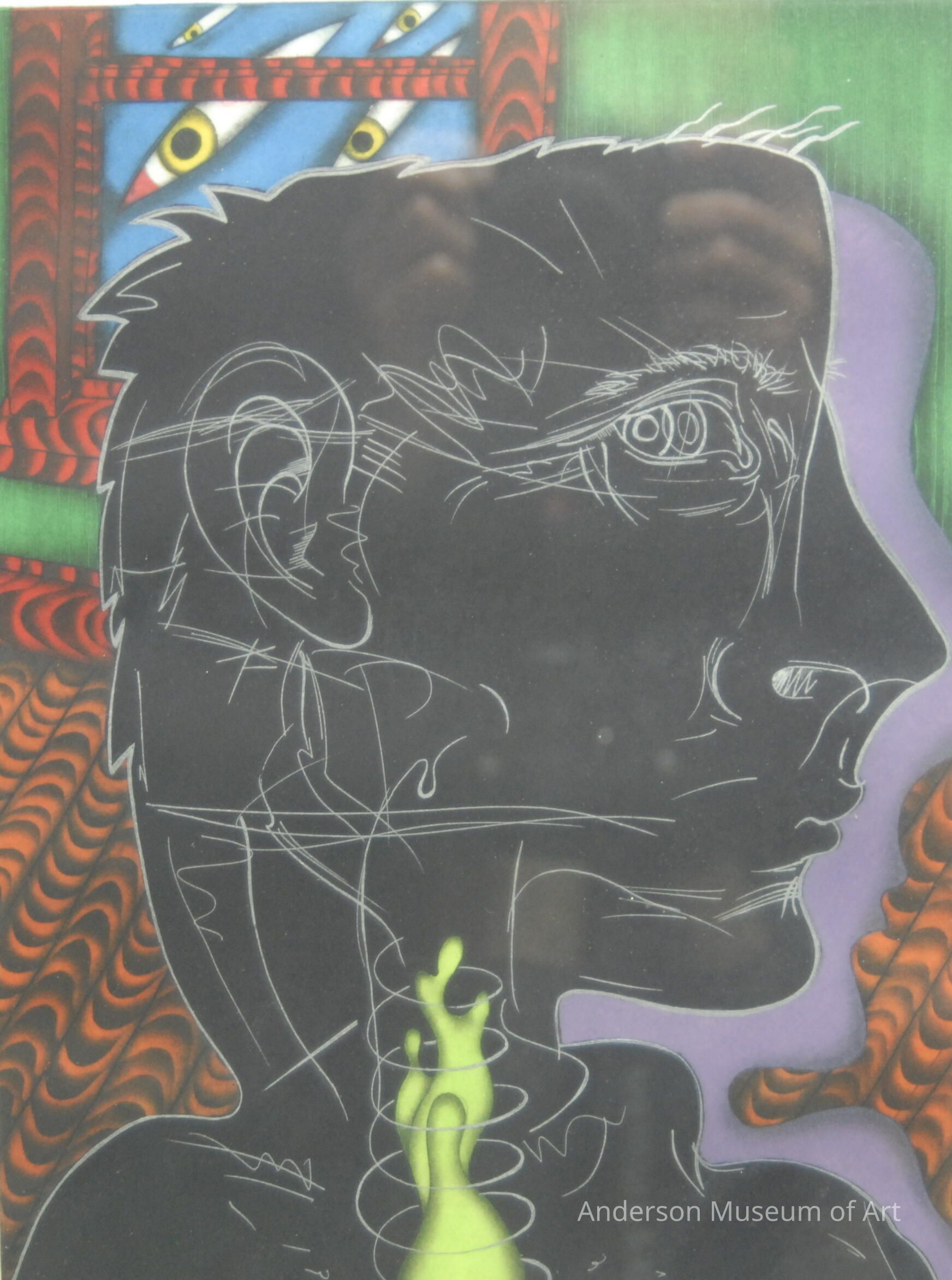 The central image of a black masculine head seen in profile. The Head is outlined in silver ink--deliberate image distortion is apparent. Rising from the lower center of the picture plane is a glob of fluorescent green paint surrounded by swirling silver circles. The background imagery is composed of what appears to be a lavender shadow of a head in the foreground. Behind the shadow appears to be a room interior consisting of a floor, wall, and window. The window is red and black. Outside the window is a sky-blue color field with eyes. Beneath the picture is written in pencil "Fear and Loathing, 1/14, c1985, J. Bujnowski." The paper appears to be cotton fiber and bears the watermark "BFK Rives" in the lower left corner.Collection