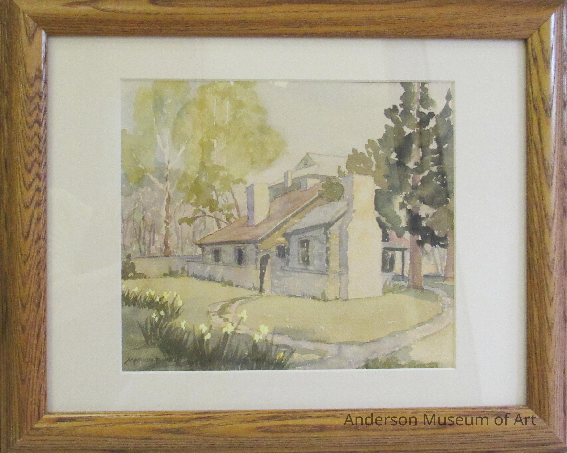 Watercolor of a cottage surrounded by trees and yard. The cottage appears to be made out of a white stone. There is a chimney to the right as well as an arched doorway. The roof is red. There are two large, dark green, trees on the right and lighter leafed trees, possibly birch, on the left. There are yellow daffodils on the bottom left corner. There is a circular path that leads to the back door, which is what the viewer sees, and to the front porch. Signed MARION BOYD in the BLC in brown paint.Type of Painting