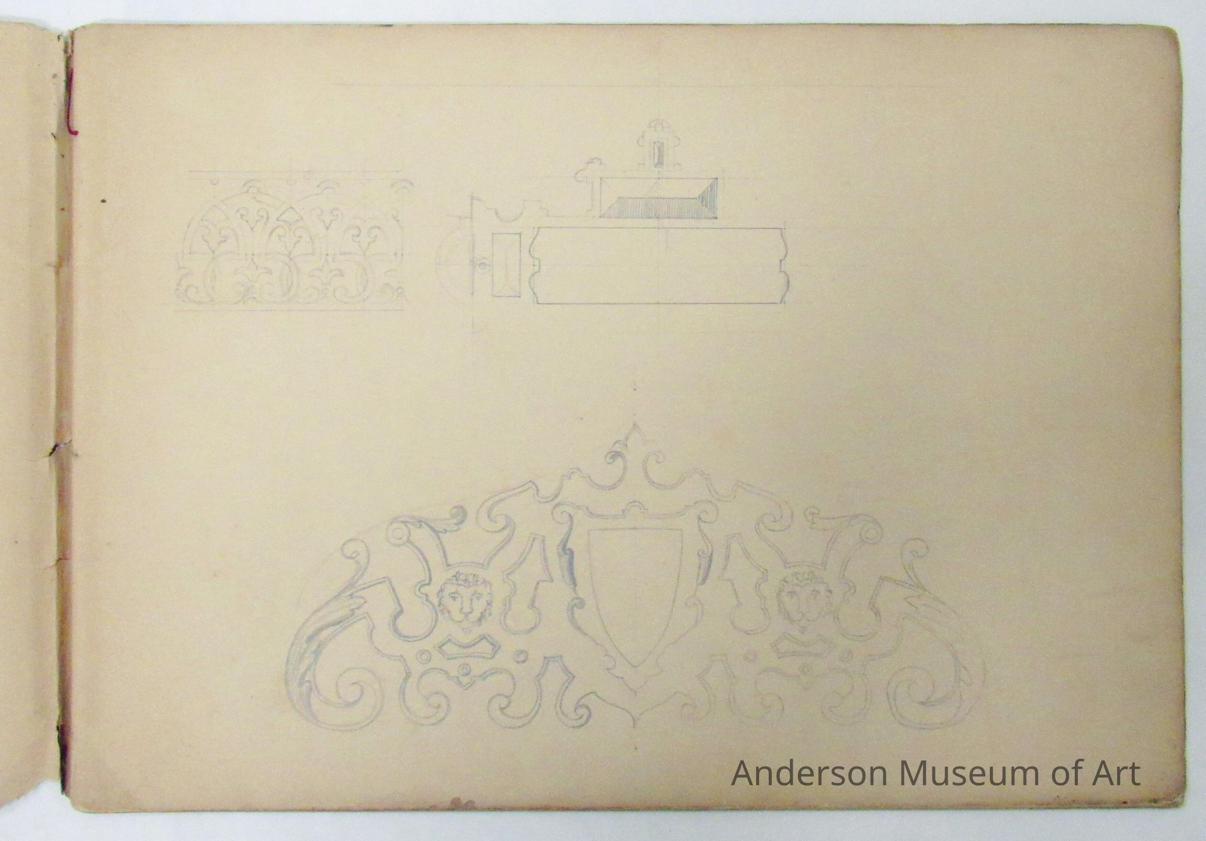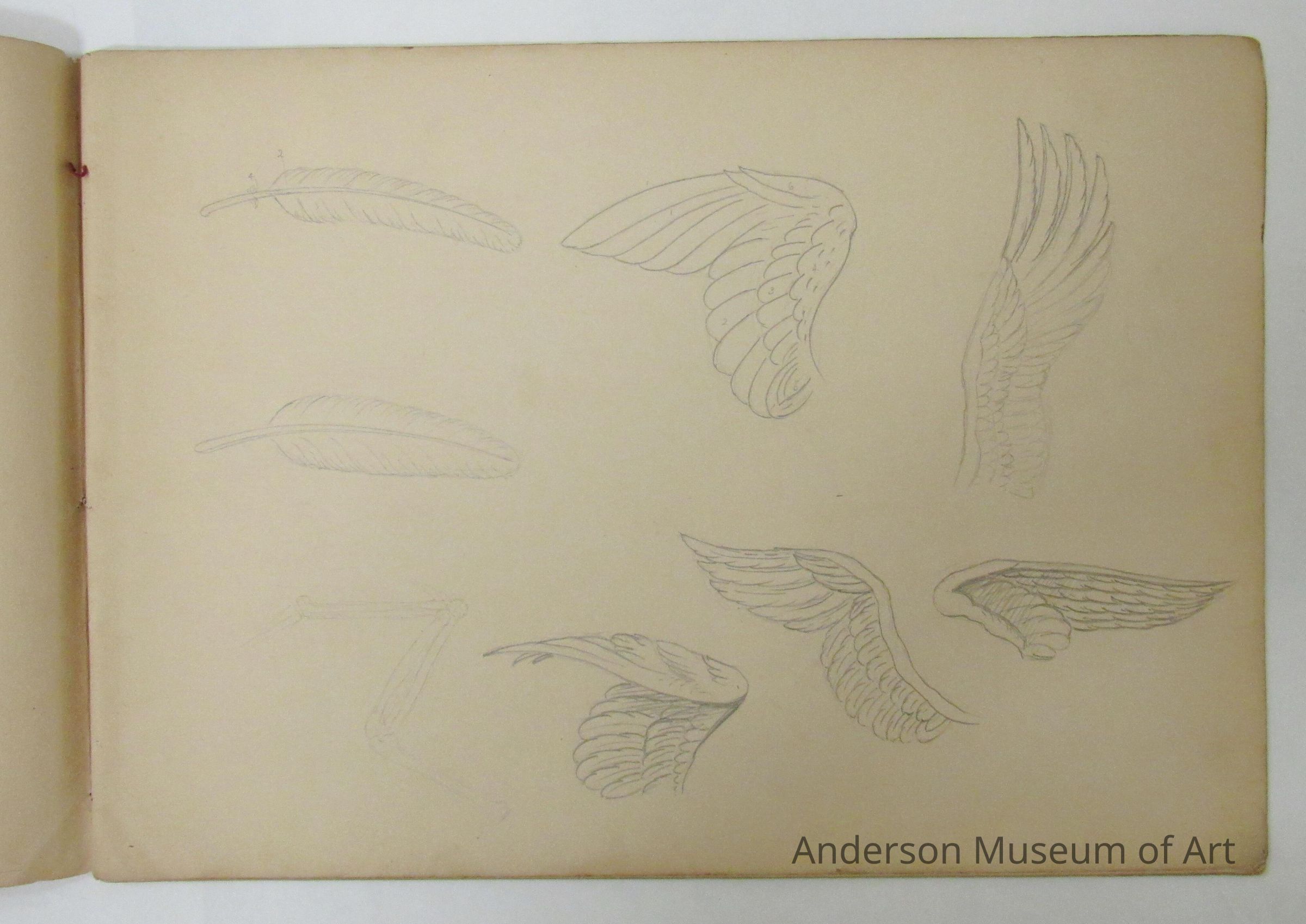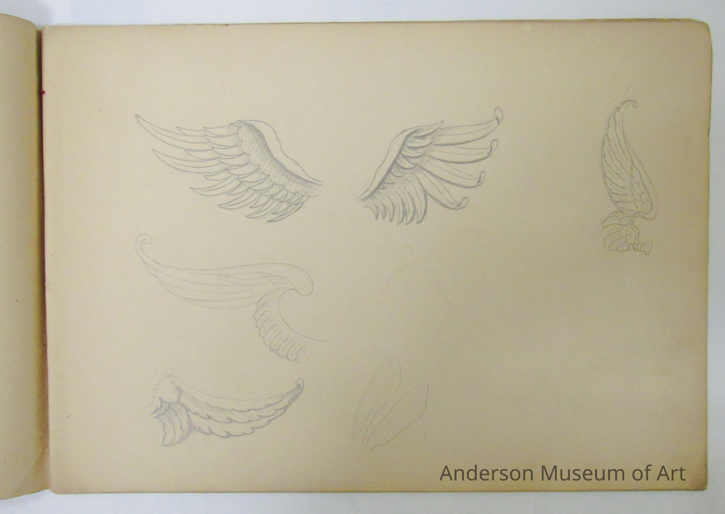 Notebook of drawings on five pages including sketches of angel wings, feathers, decorative designs, and one for a crest.Acquisition