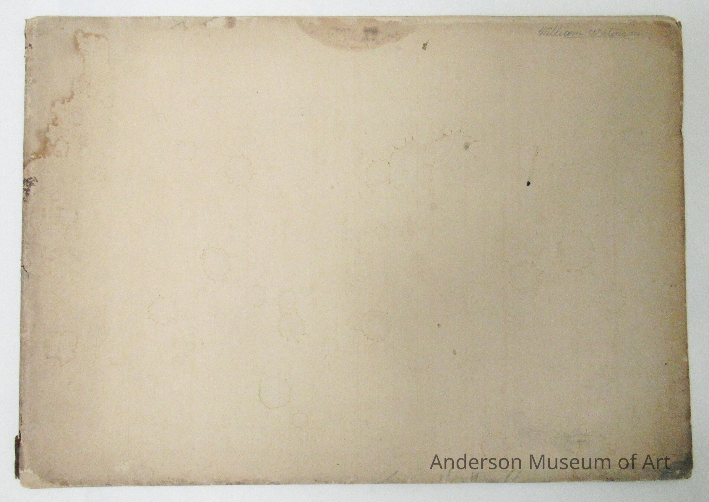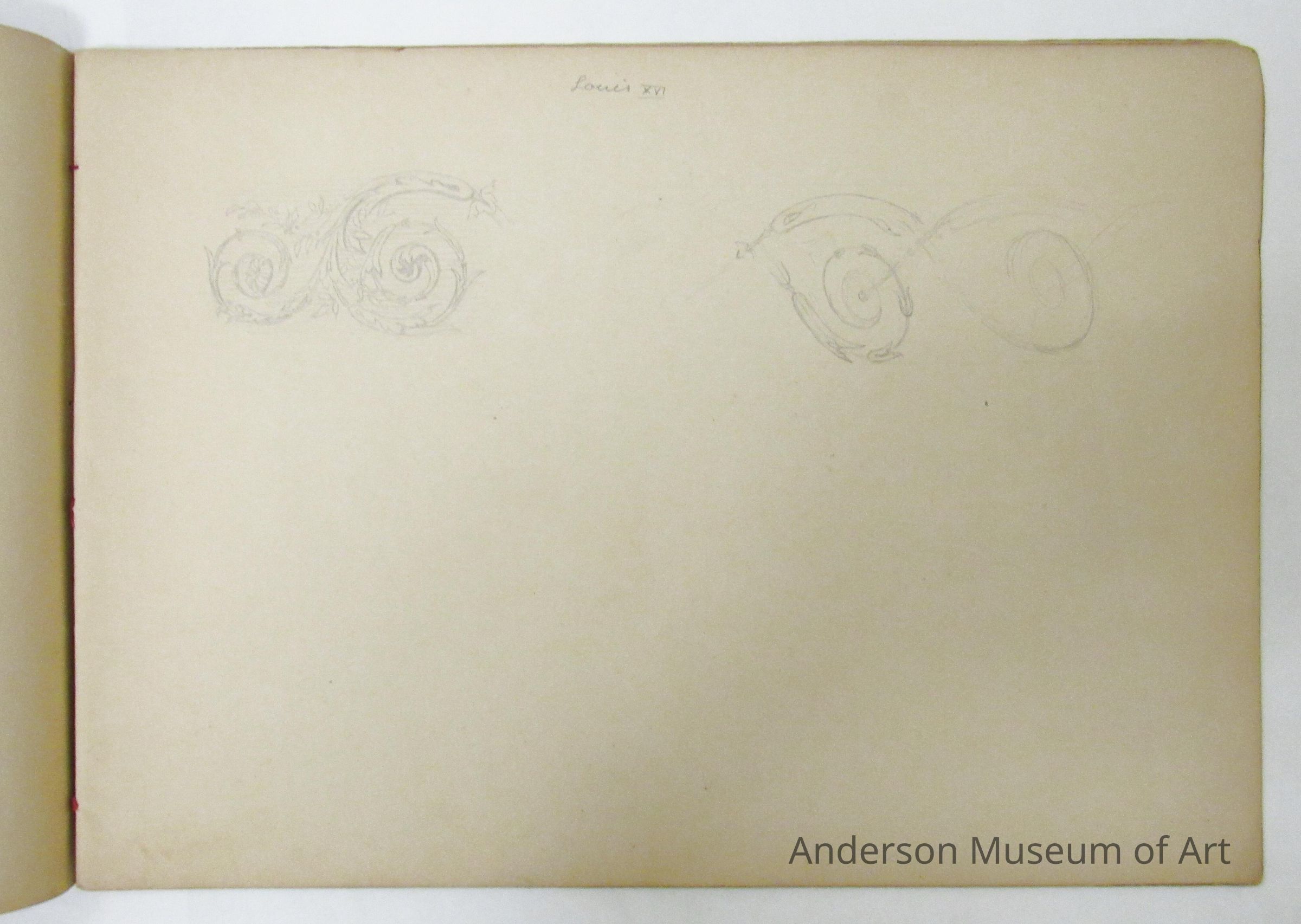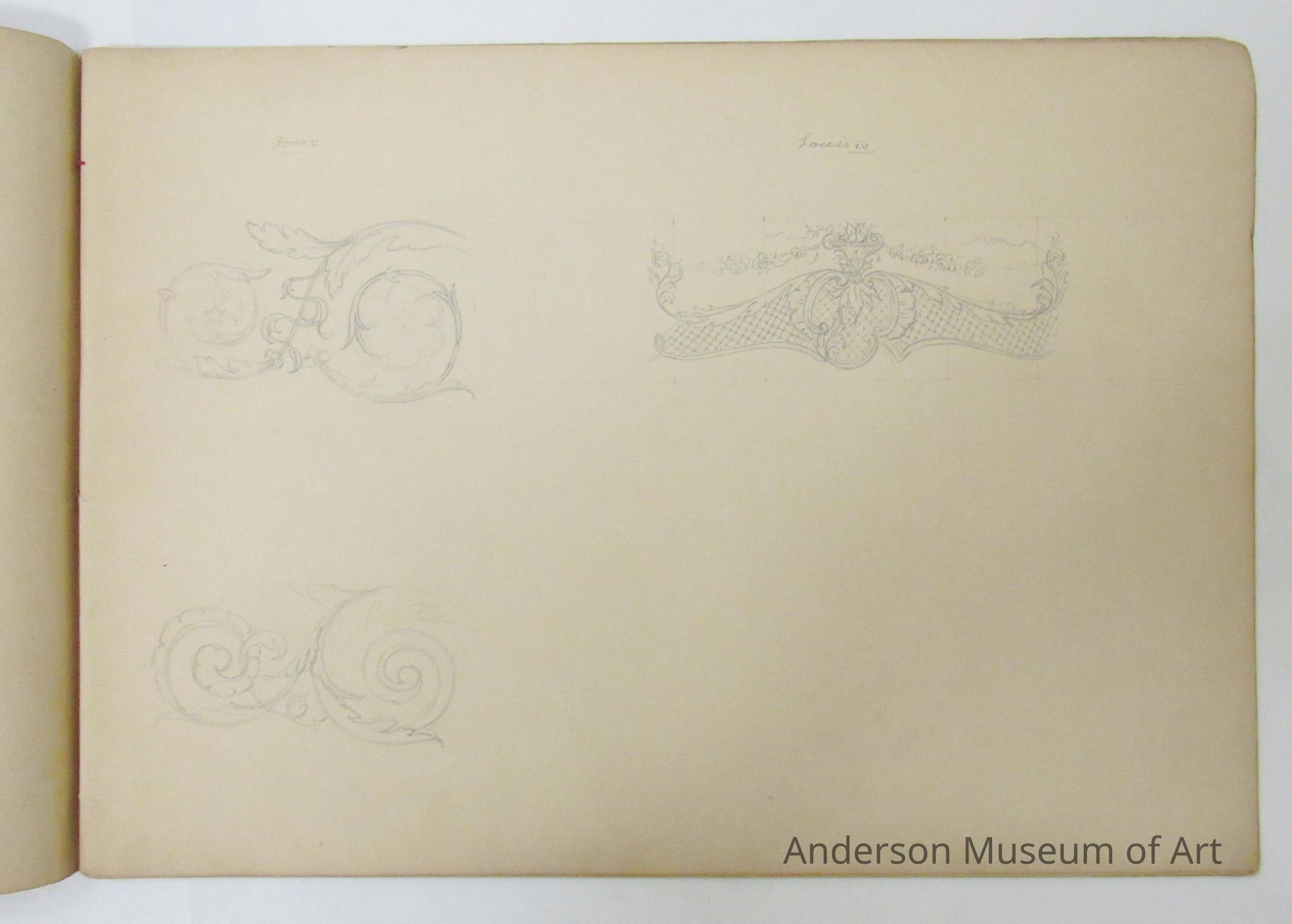 Notebook of drawings on five pages including sketches of angel wings, feathers, decorative designs, and one for a crest.Acquisition