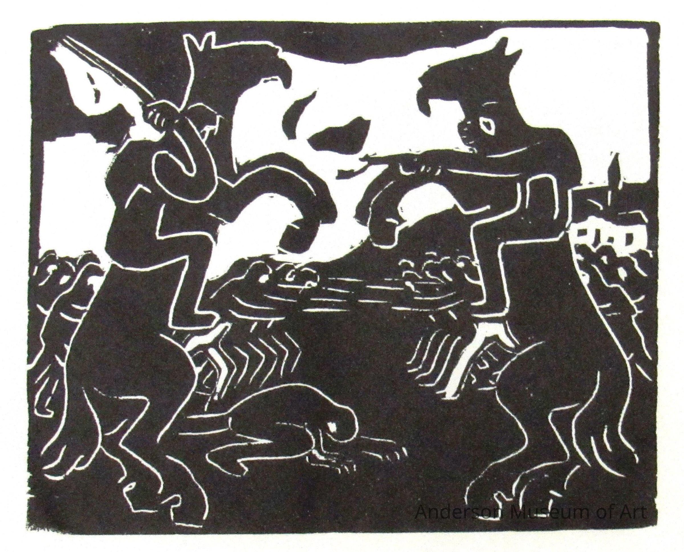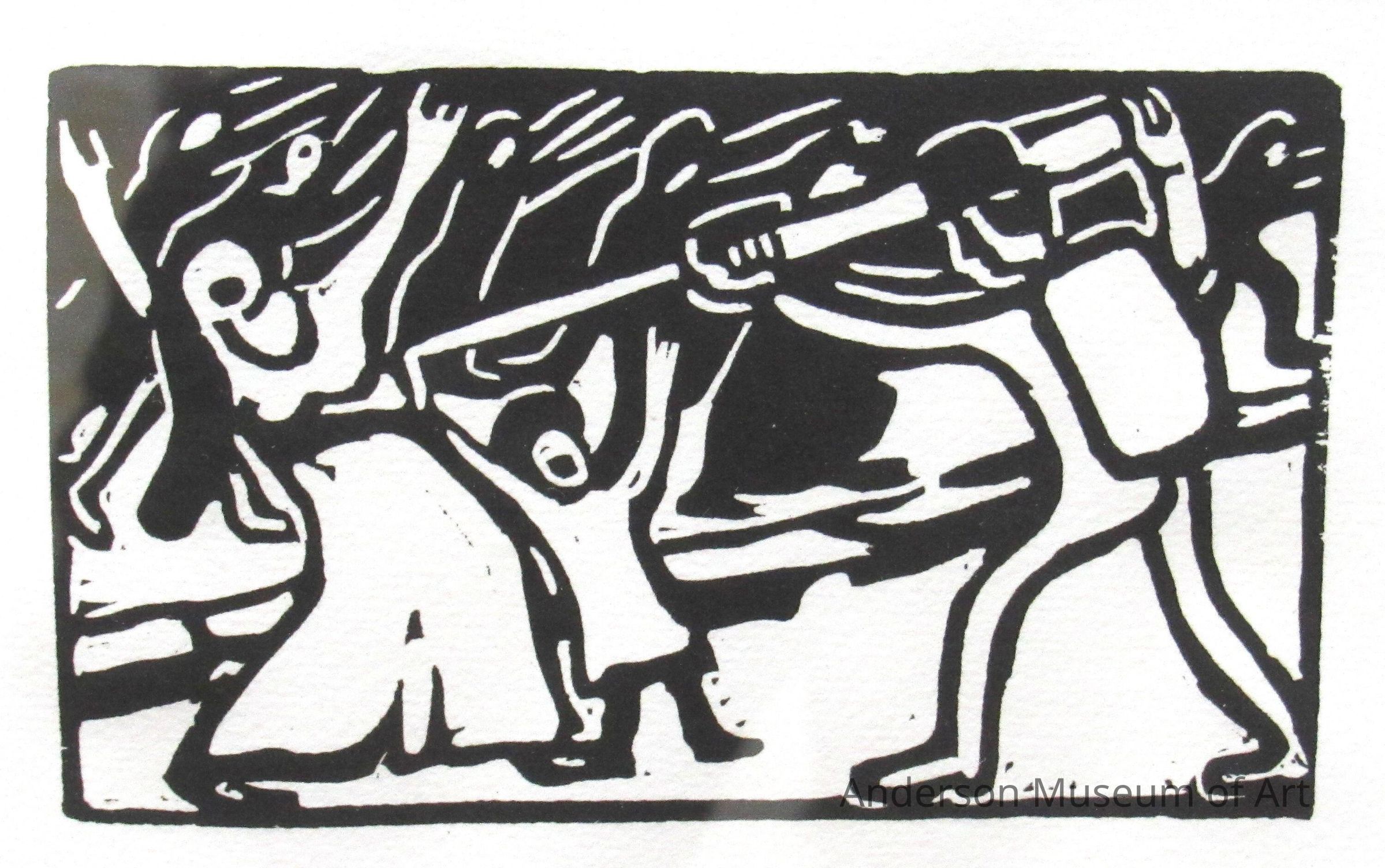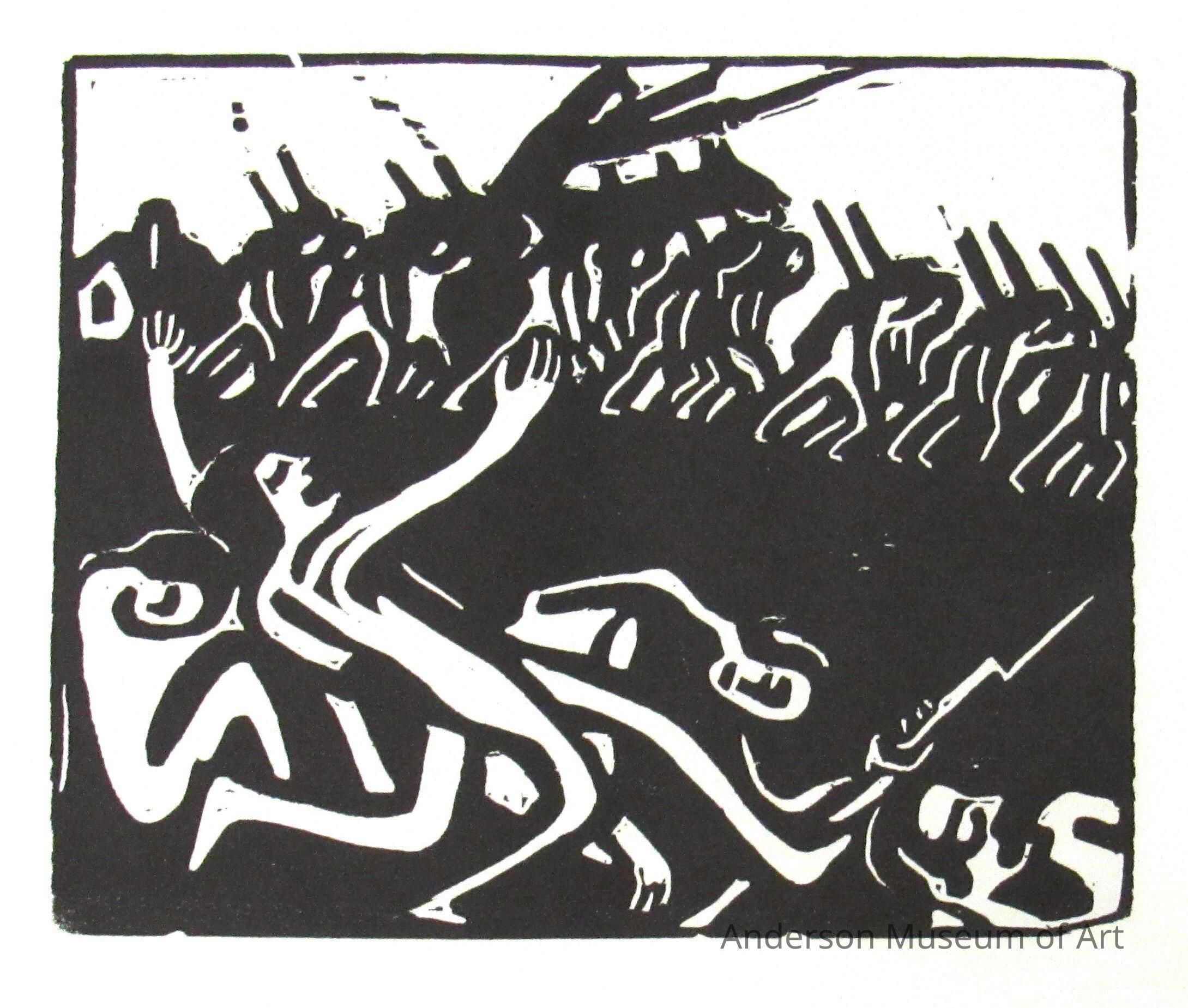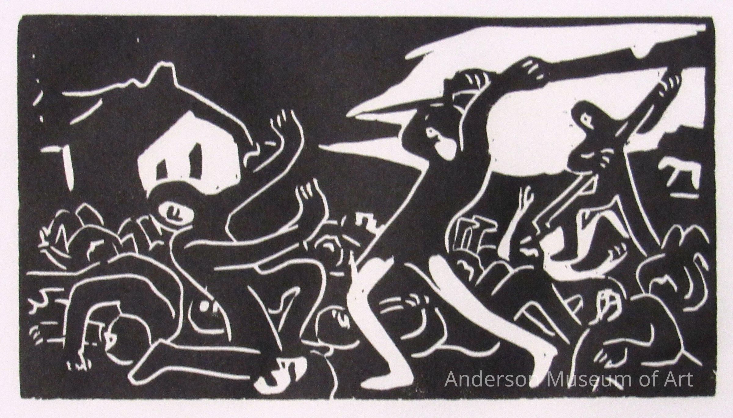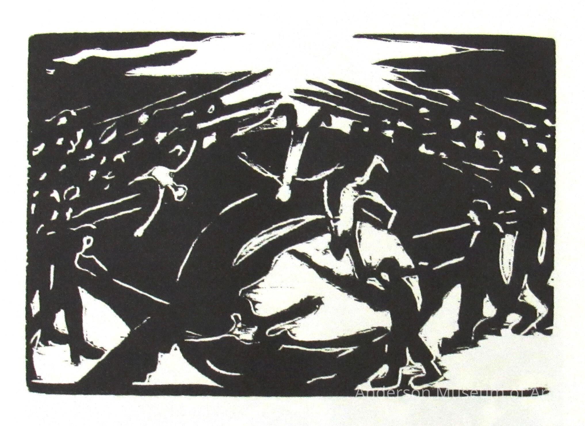 1980.11.5.17 (battlefield scene, soldiers with bayonets on the left, group of people on the right and a curled up figure in the foreground) and 1980.11.5.18 (soldier pointing a bayonet at a woman and child with their arms raised up) are framed in a black wooden frame. They are 19.75" x 17.25". 1980.11.5.17 is located in SST7 and 1980.11.5.18 is located in SST8.Acquisition