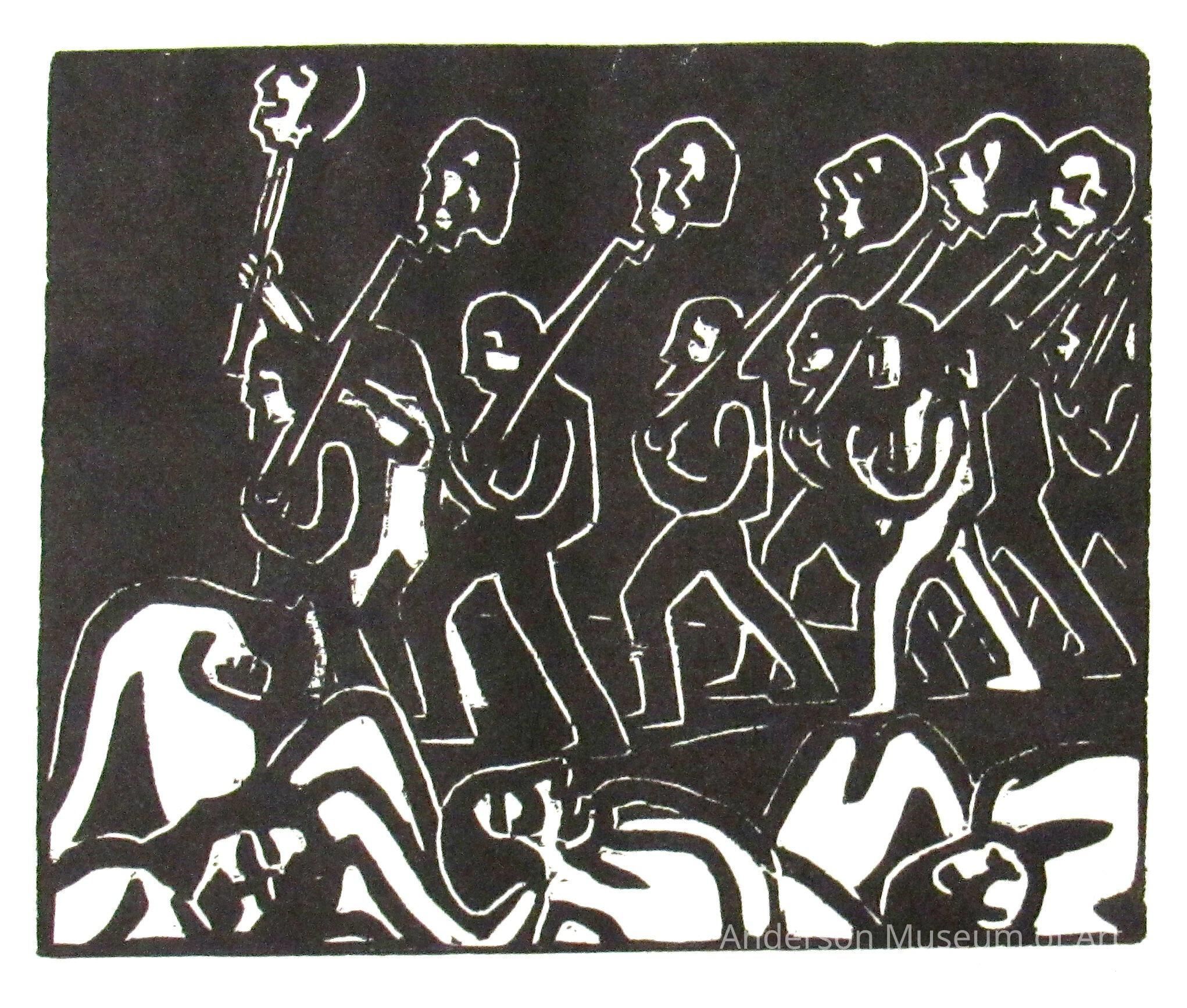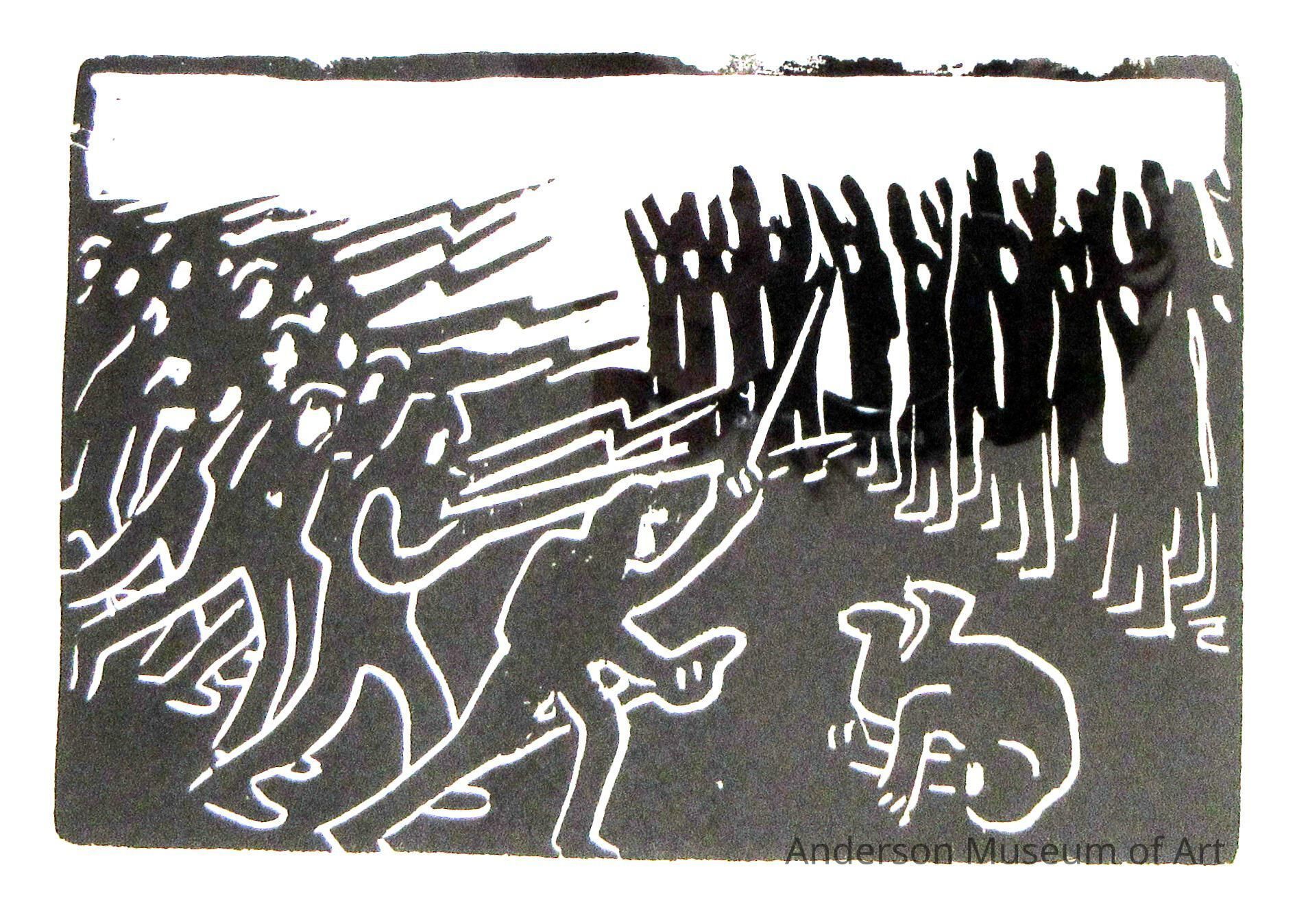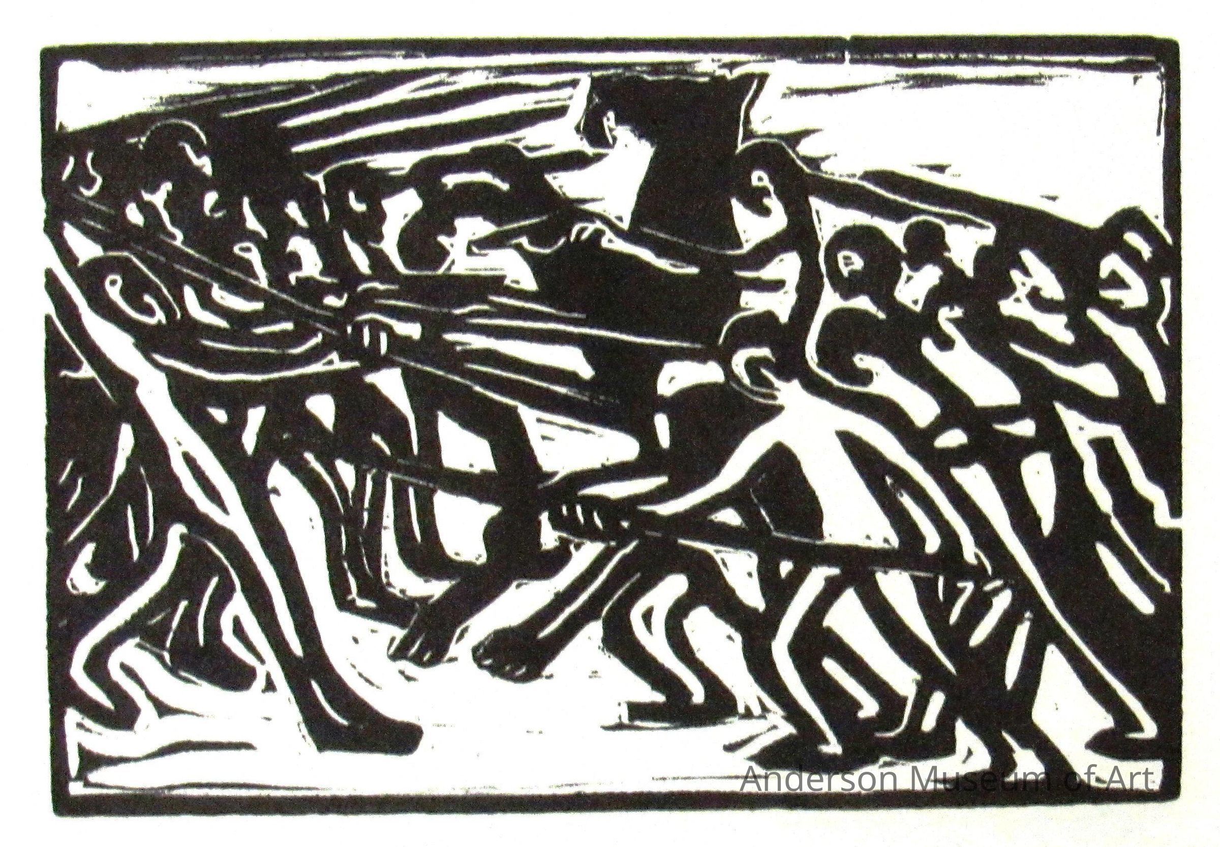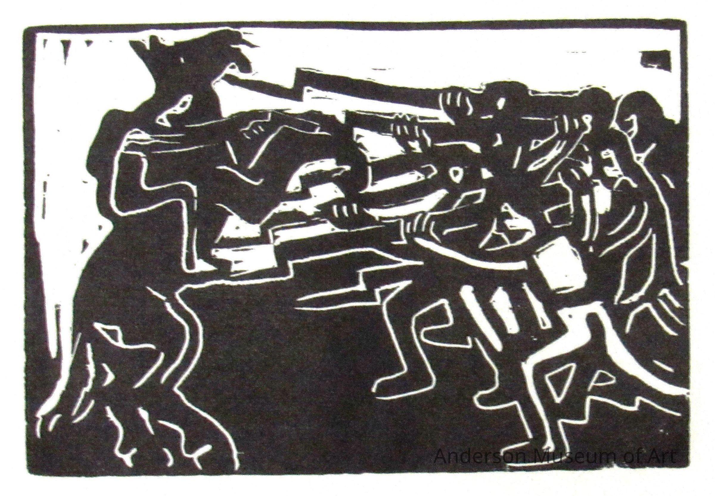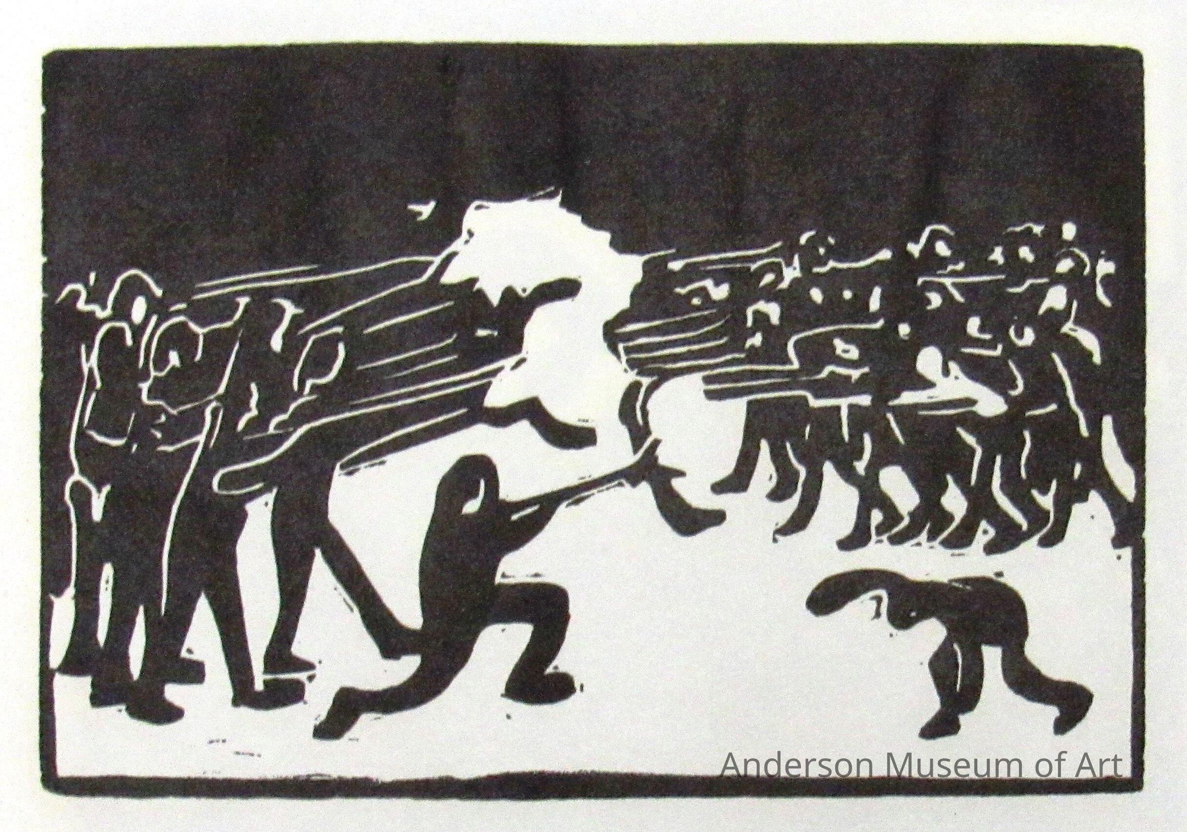 1980.11.5.17 (battlefield scene, soldiers with bayonets on the left, group of people on the right and a curled up figure in the foreground) and 1980.11.5.18 (soldier pointing a bayonet at a woman and child with their arms raised up) are framed in a black wooden frame. They are 19.75" x 17.25". 1980.11.5.17 is located in SST7 and 1980.11.5.18 is located in SST8.Acquisition