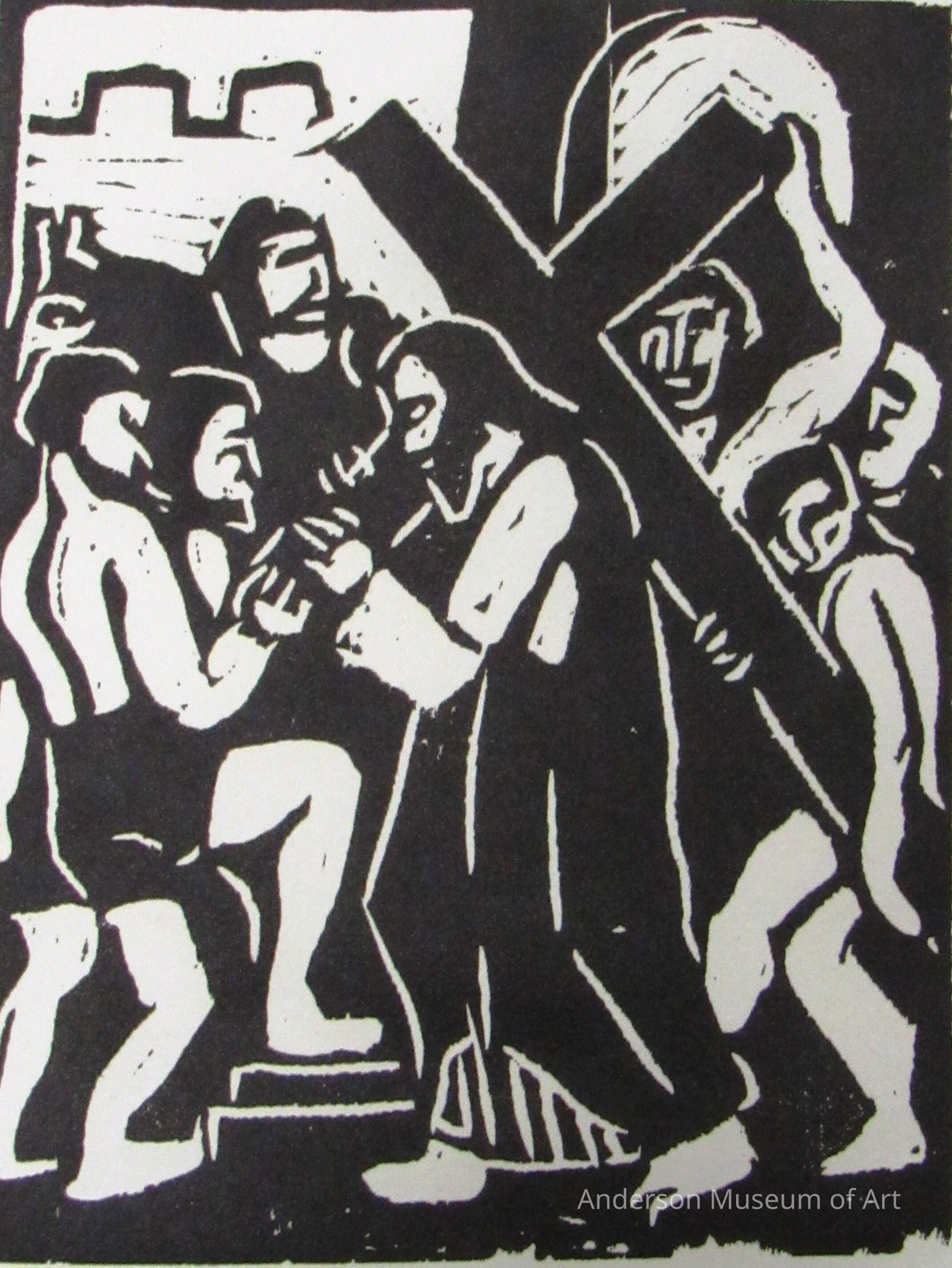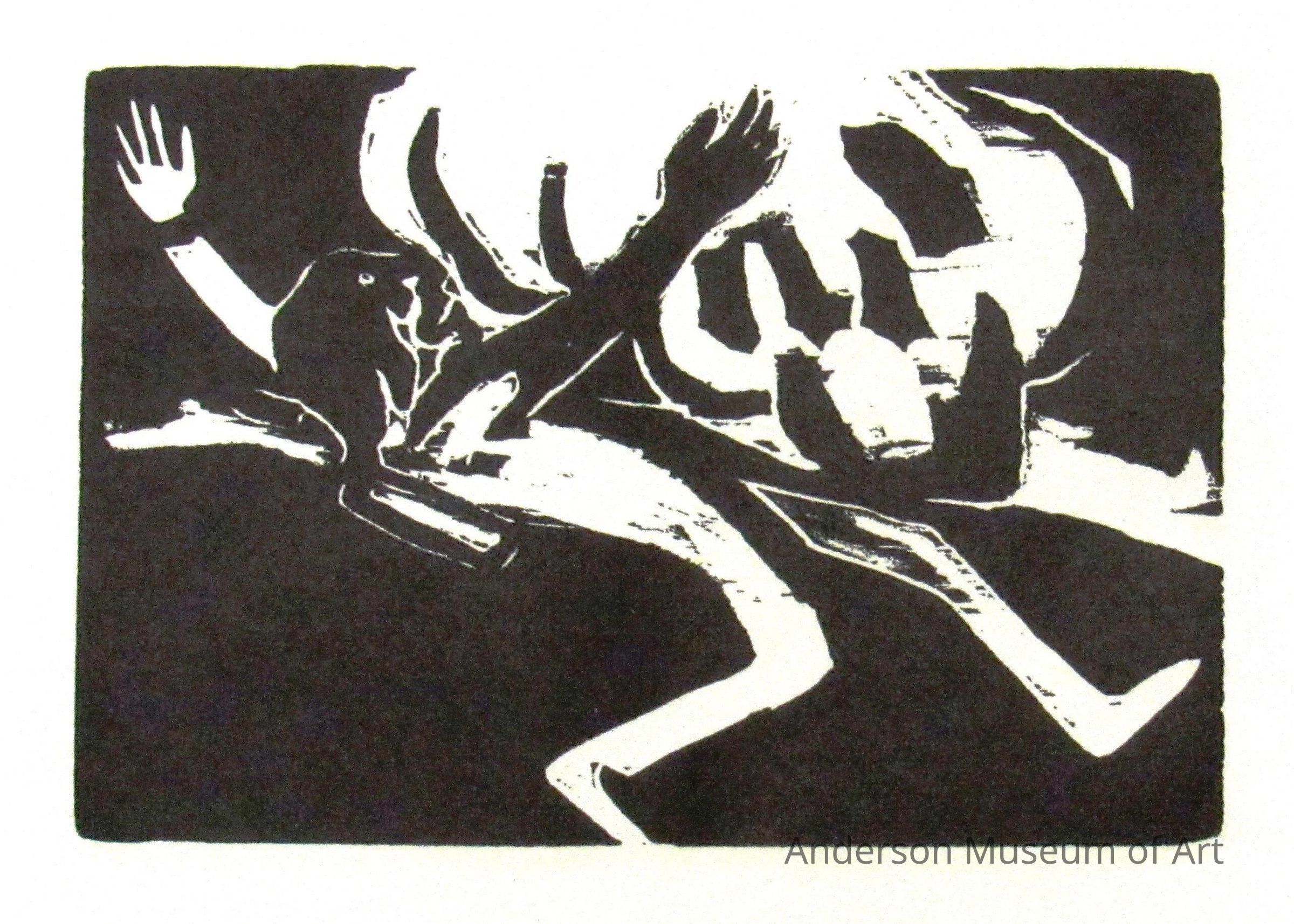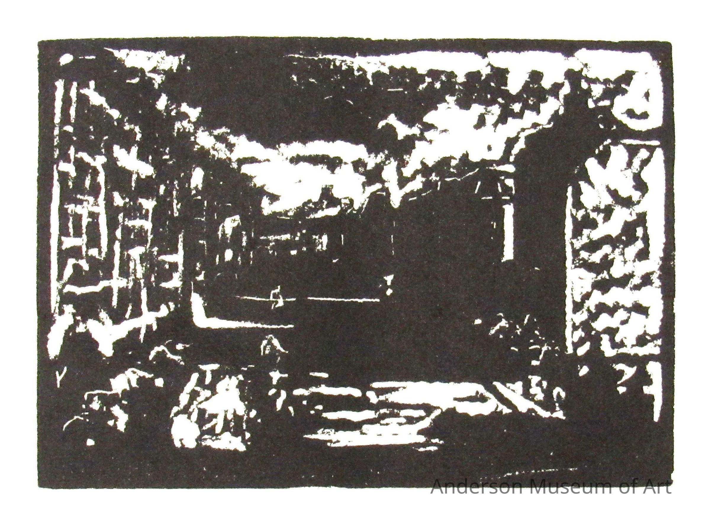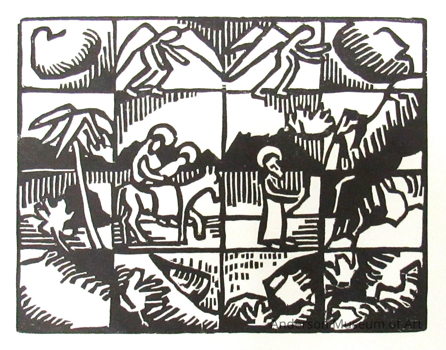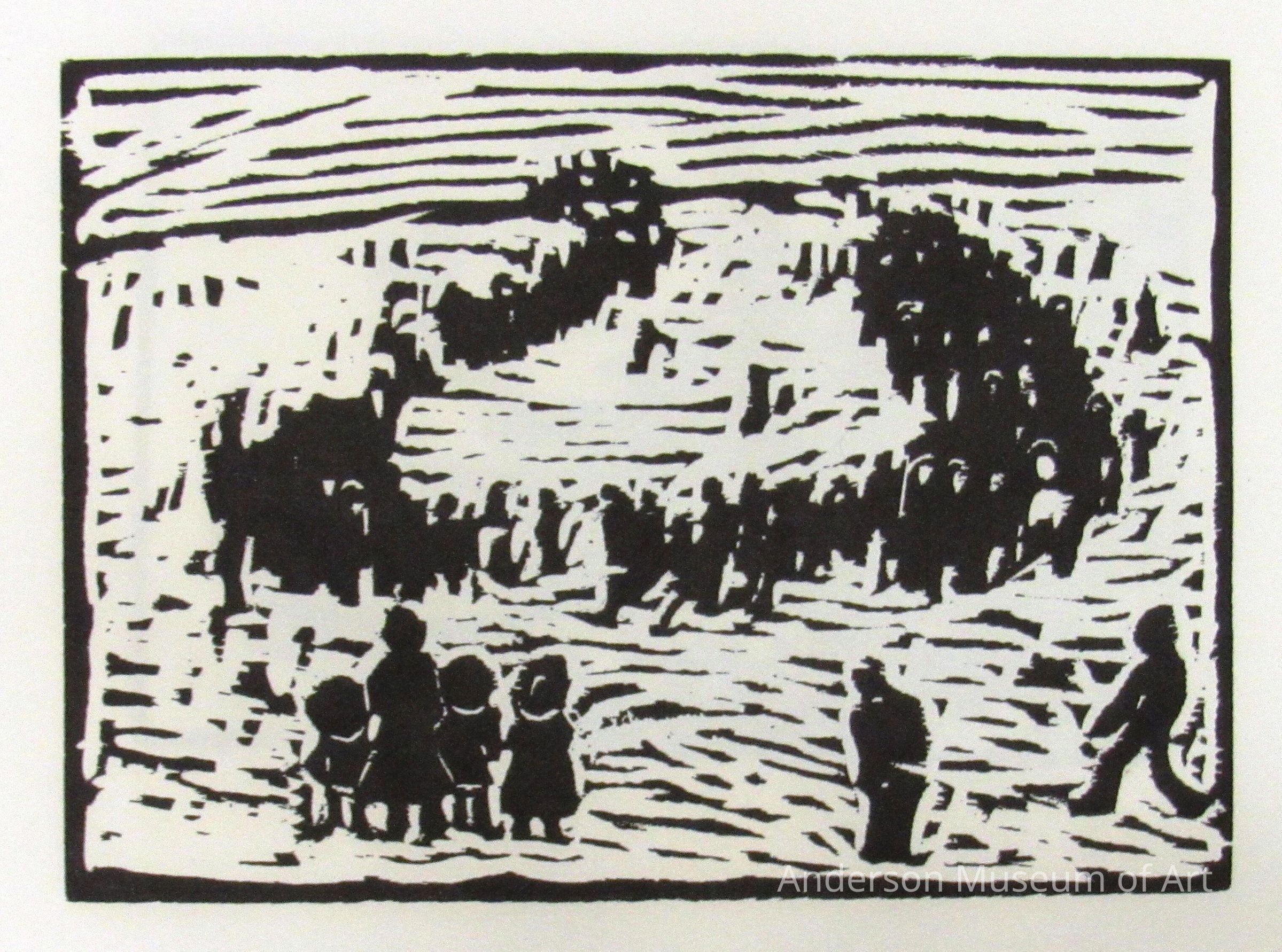 1980.11.5.17 (battlefield scene, soldiers with bayonets on the left, group of people on the right and a curled up figure in the foreground) and 1980.11.5.18 (soldier pointing a bayonet at a woman and child with their arms raised up) are framed in a black wooden frame. They are 19.75" x 17.25". 1980.11.5.17 is located in SST7 and 1980.11.5.18 is located in SST8.Acquisition