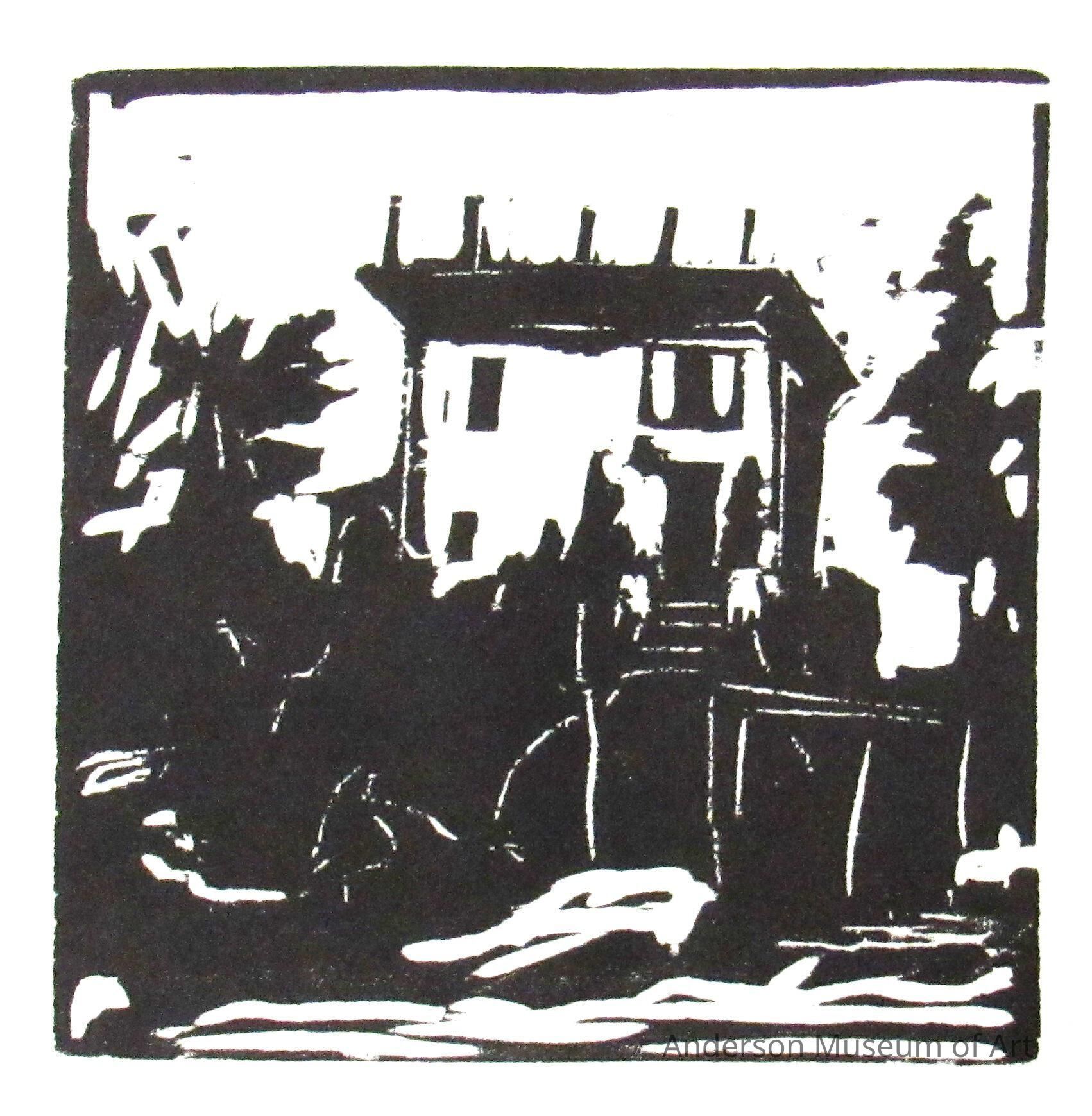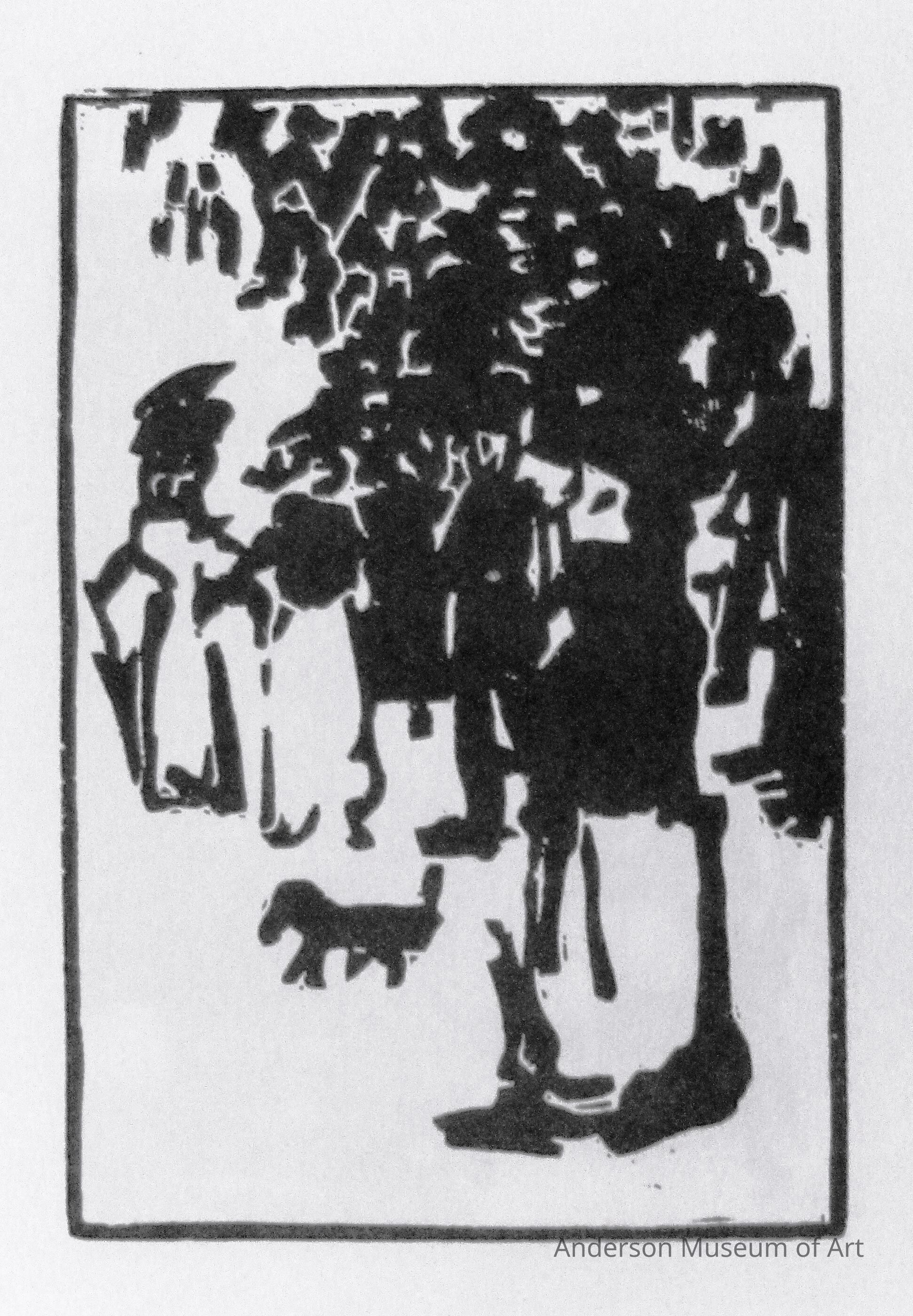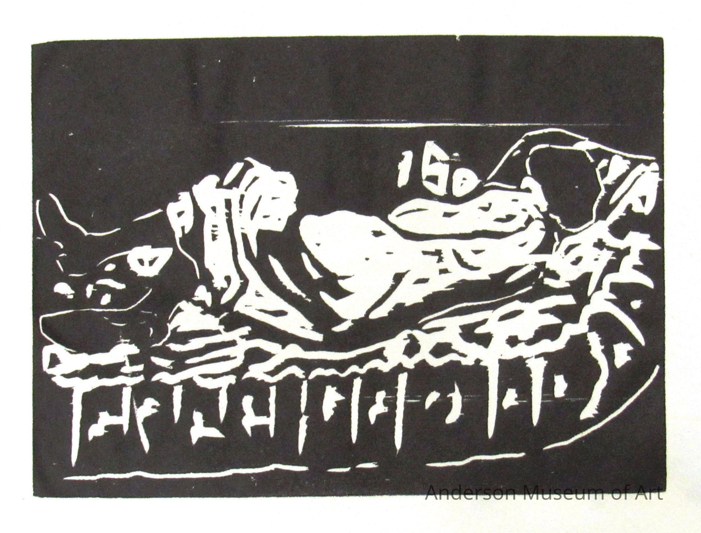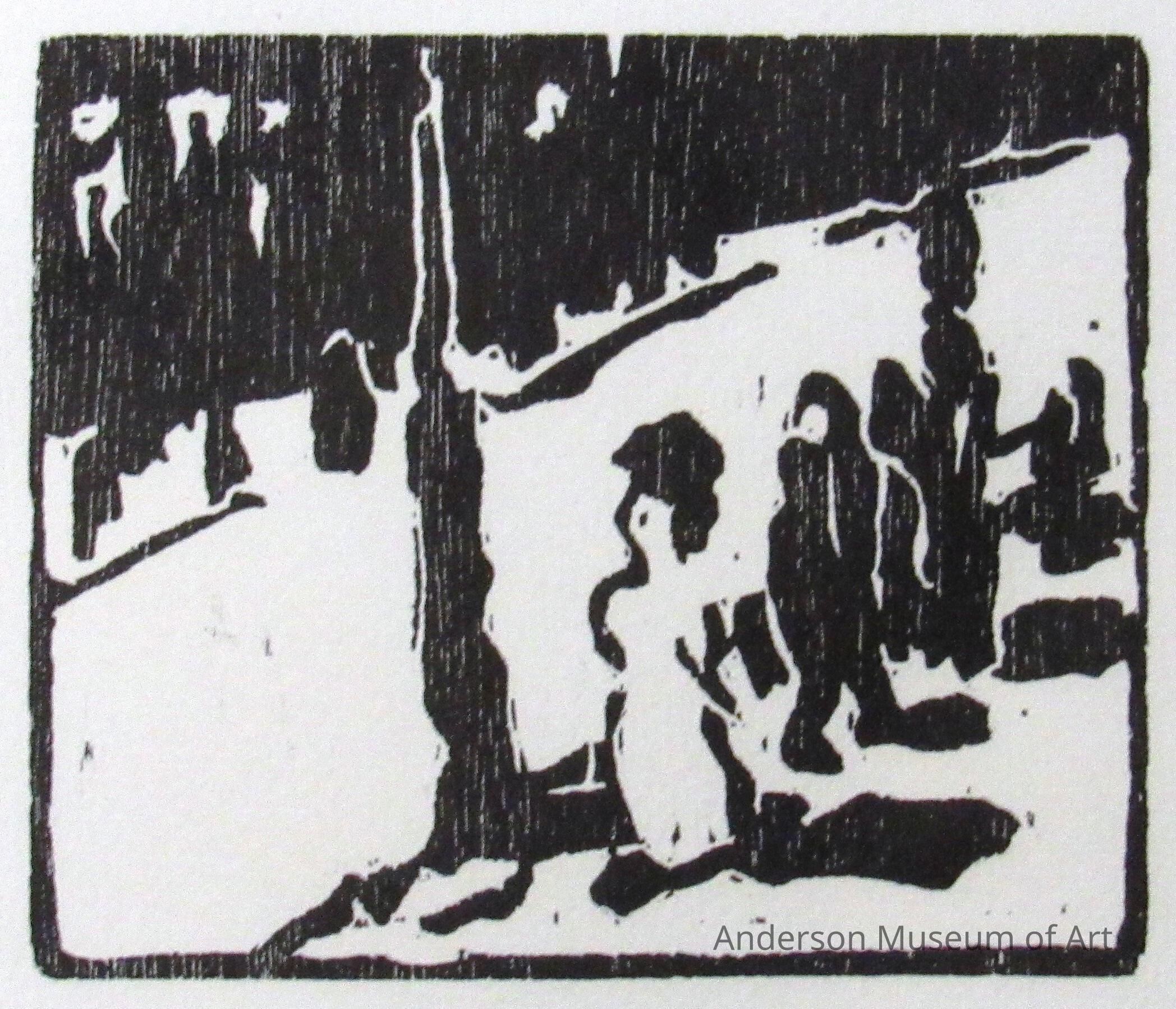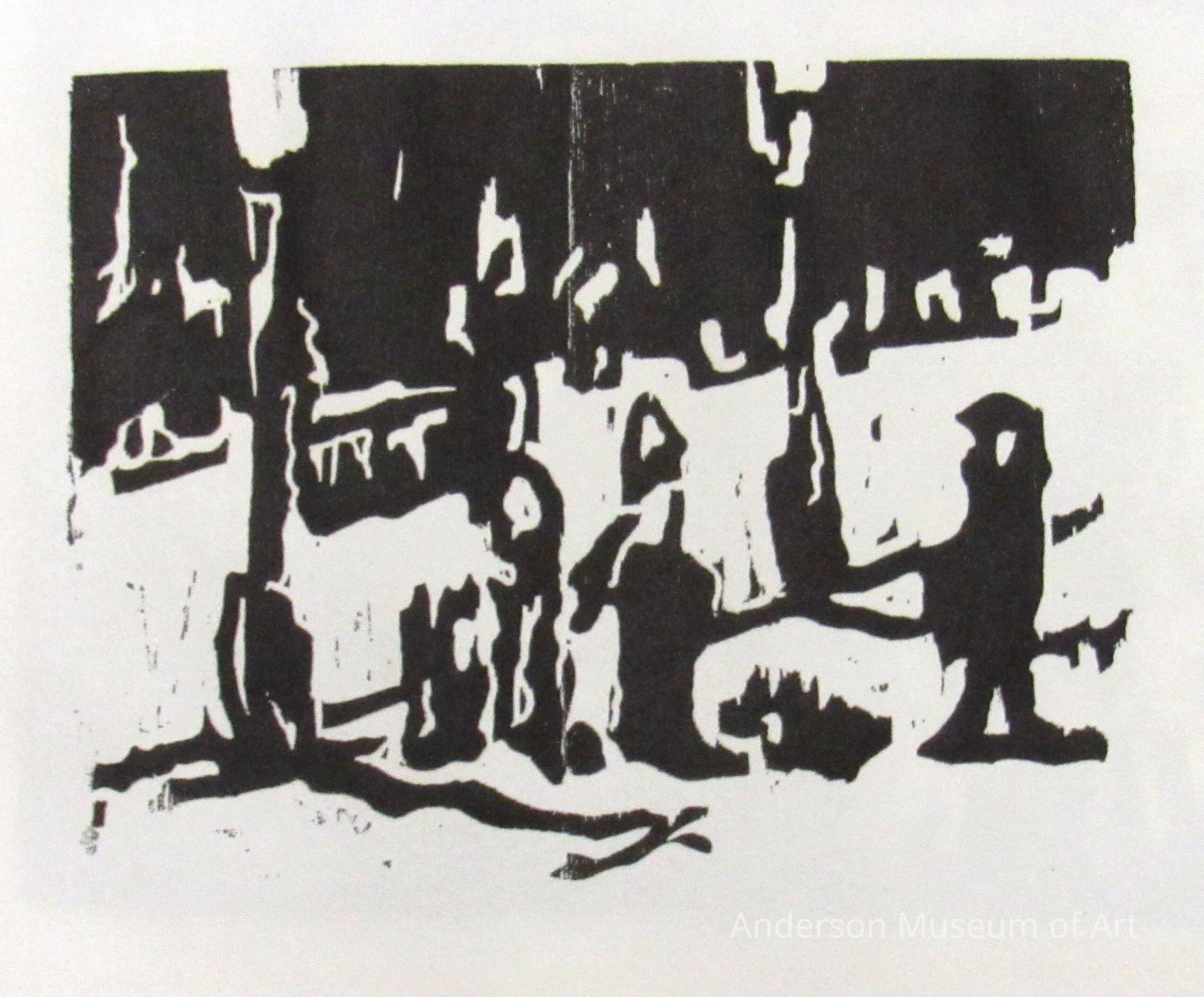 1980.11.5.17 (battlefield scene, soldiers with bayonets on the left, group of people on the right and a curled up figure in the foreground) and 1980.11.5.18 (soldier pointing a bayonet at a woman and child with their arms raised up) are framed in a black wooden frame. They are 19.75" x 17.25". 1980.11.5.17 is located in SST7 and 1980.11.5.18 is located in SST8.Acquisition