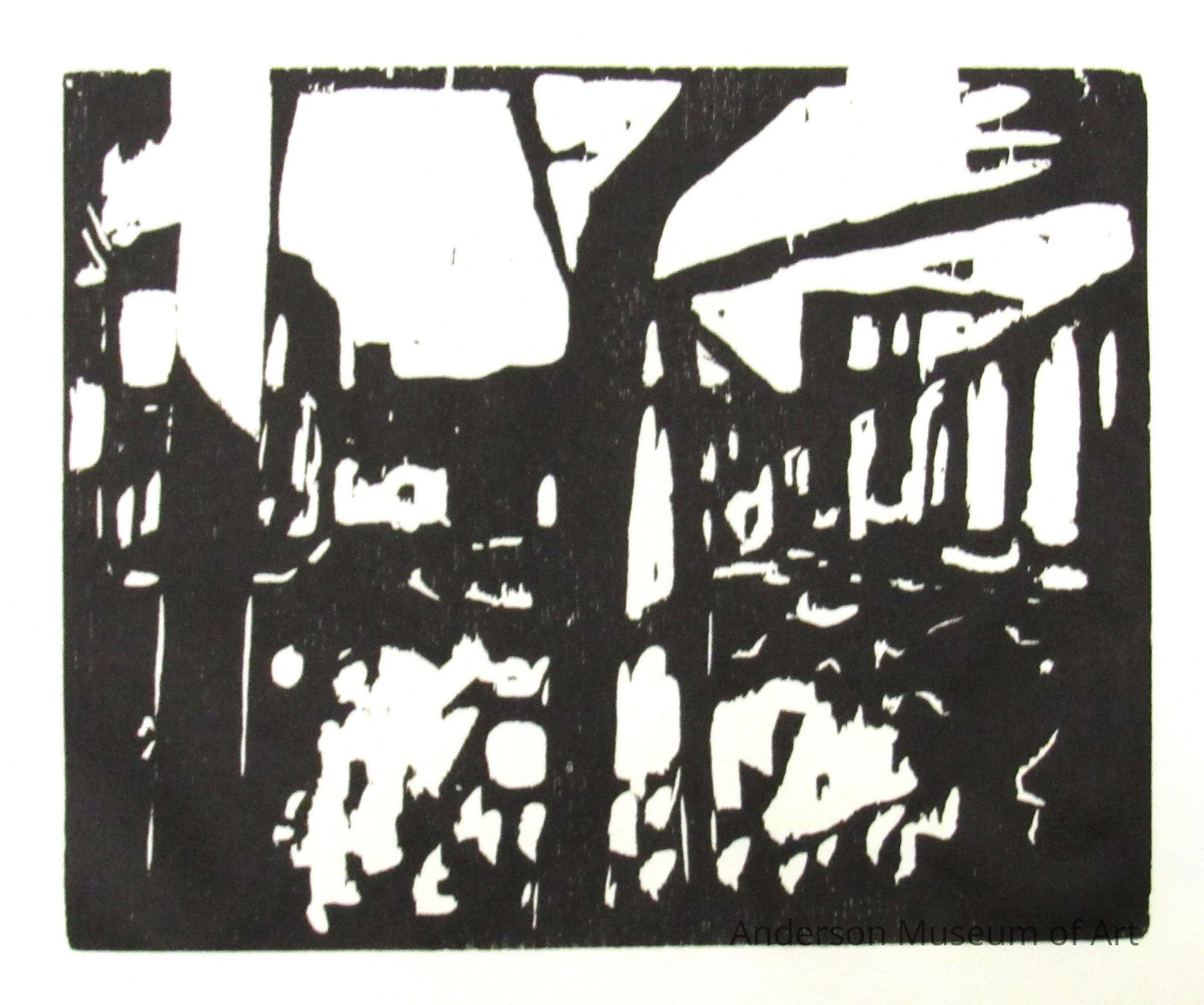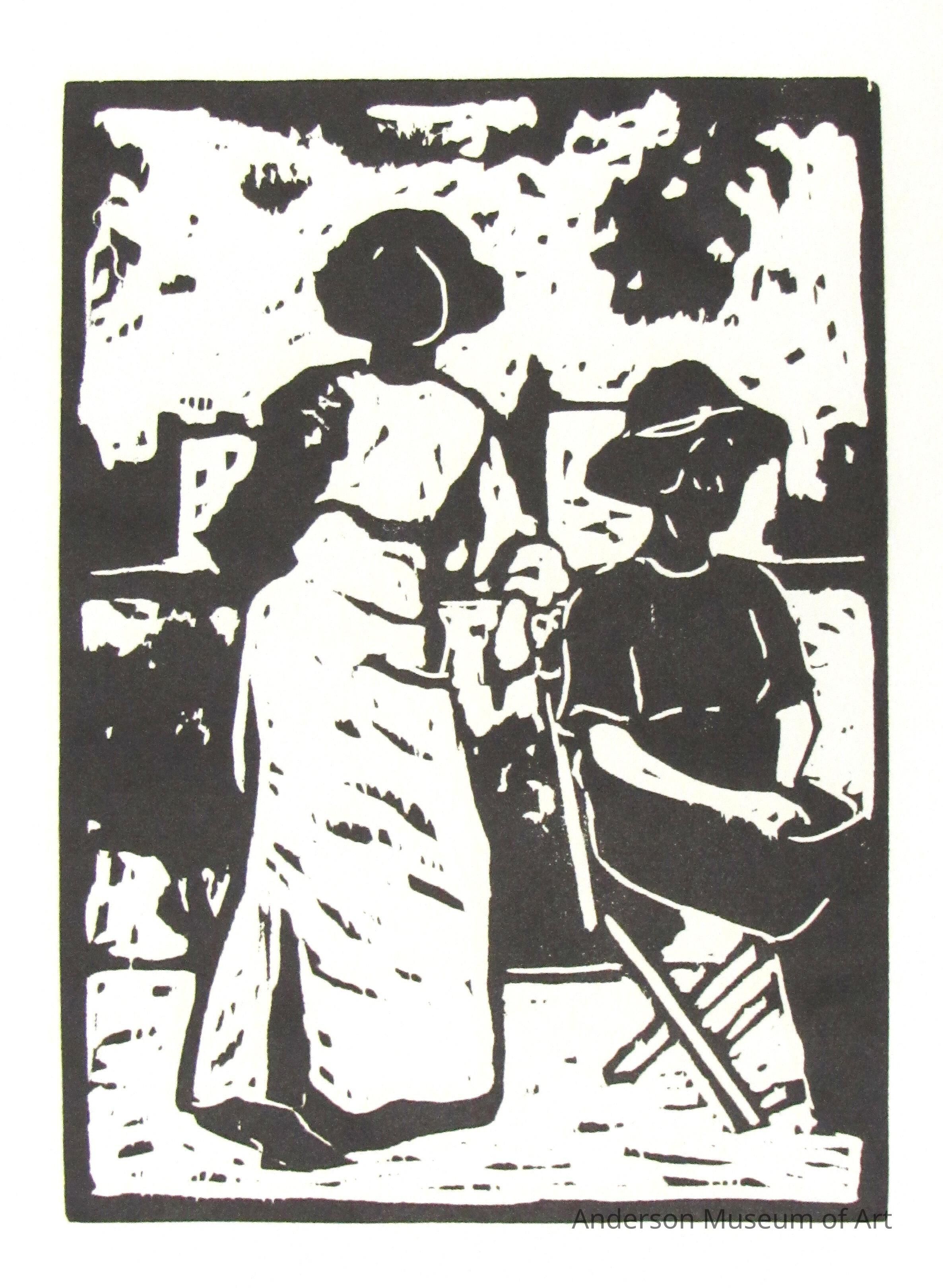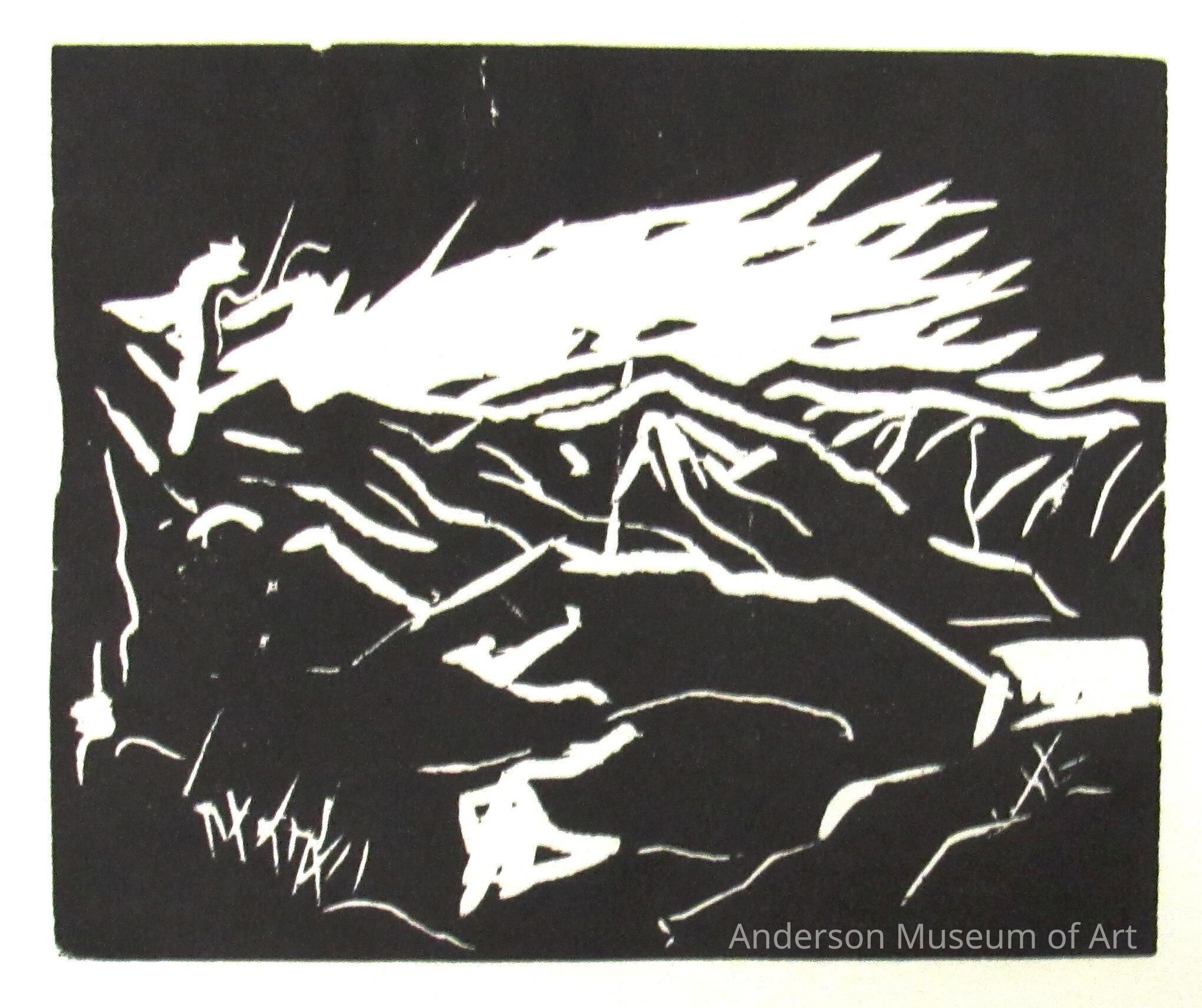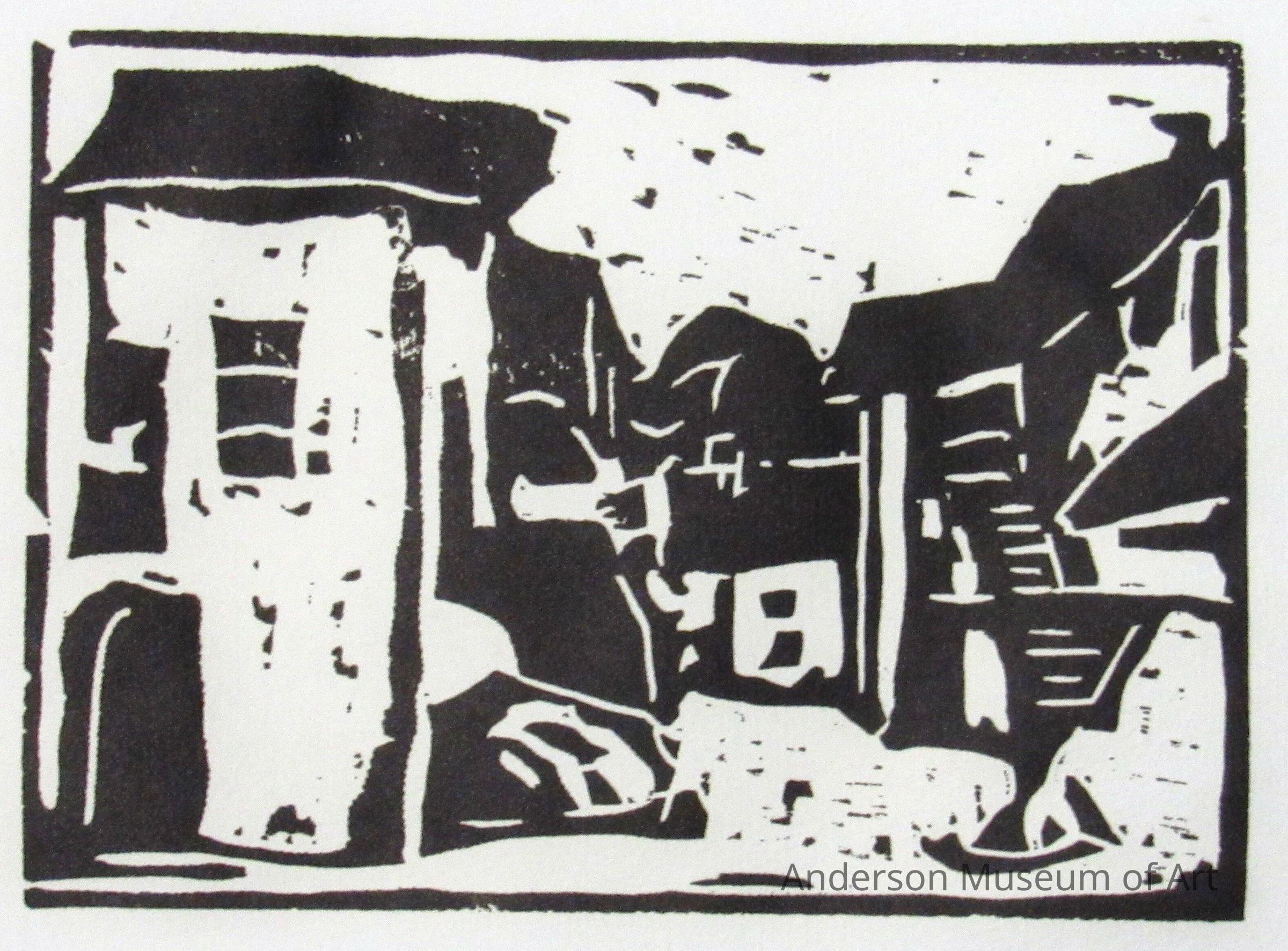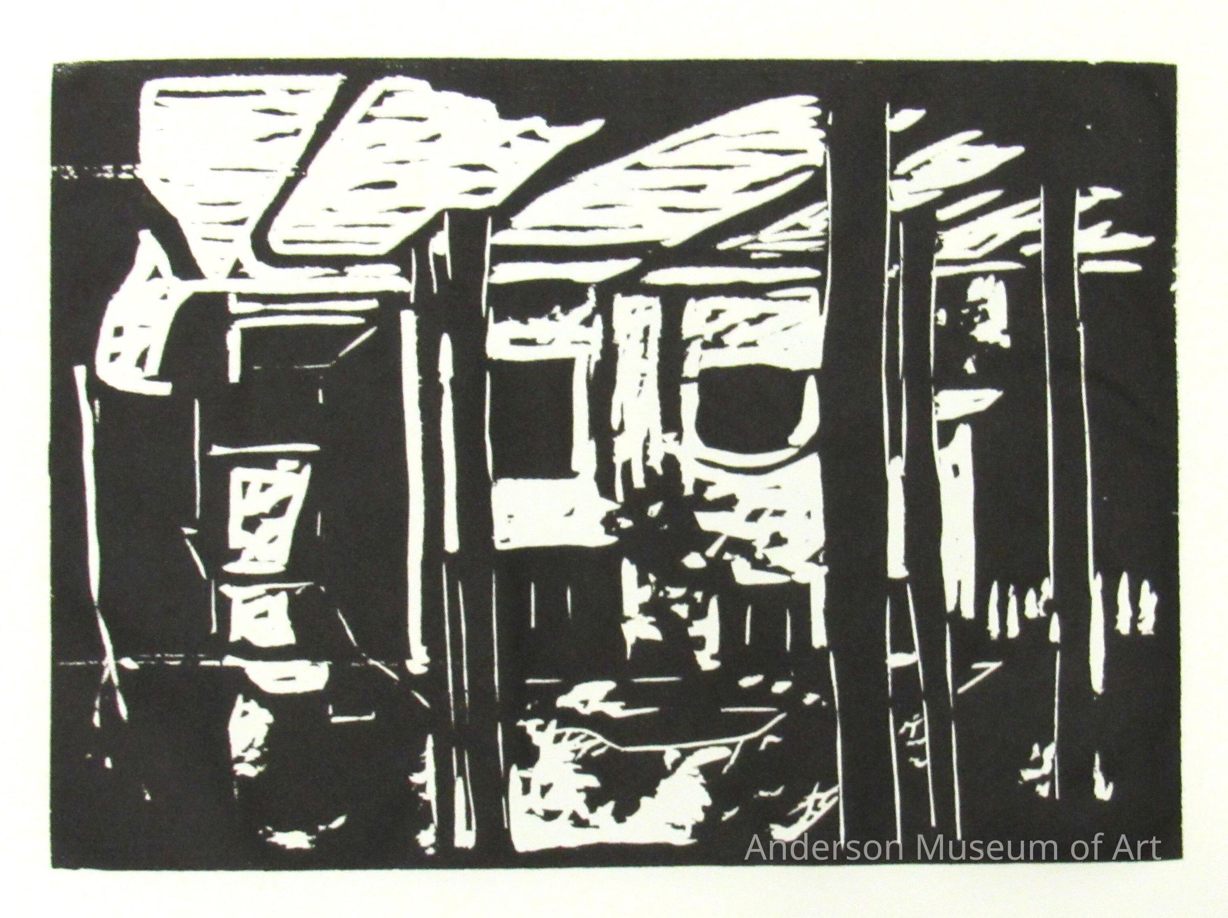 1980.11.5.17 (battlefield scene, soldiers with bayonets on the left, group of people on the right and a curled up figure in the foreground) and 1980.11.5.18 (soldier pointing a bayonet at a woman and child with their arms raised up) are framed in a black wooden frame. They are 19.75" x 17.25". 1980.11.5.17 is located in SST7 and 1980.11.5.18 is located in SST8.Acquisition