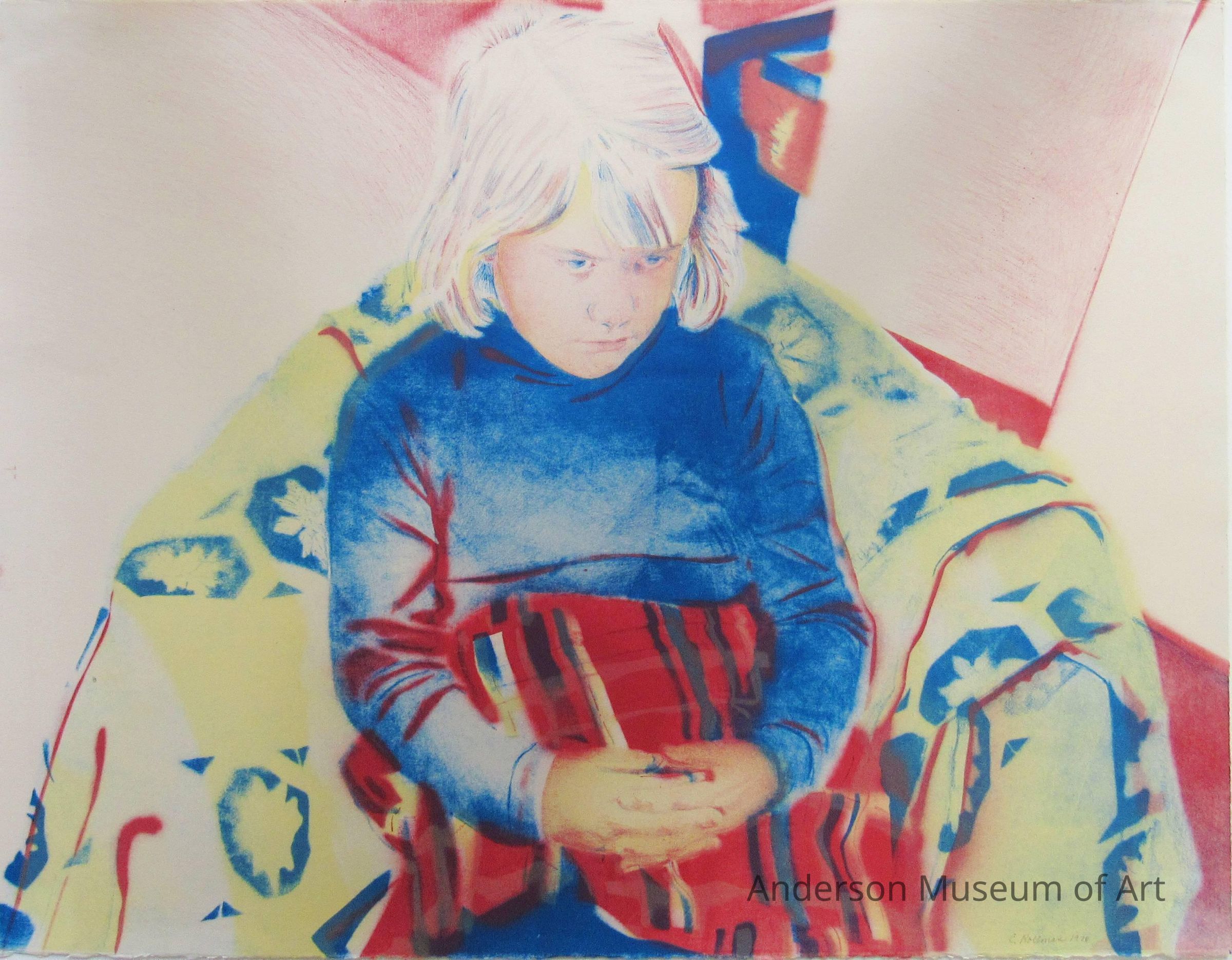 Young girl with very chin length light colored hair wearing a blue long sleeved blouse is sitting with her hands folded on her lap. She is looking toward the right foreground. The rounded seat on which she is sitting is covered with a blanket that is yellow with a series of blue octagon designs.