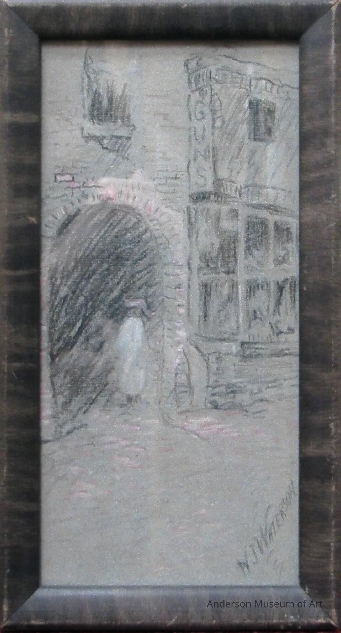 Drawing of a figure whose back is to the viewer, standing in a dark archway. Building/architecture is brick. There is a glass window to the right of the figure. Sign above the window reads "GUNS" vertically. Figure and small areas of brick colored with red or white pastel. Signed bottom right corner.Type of Drawing