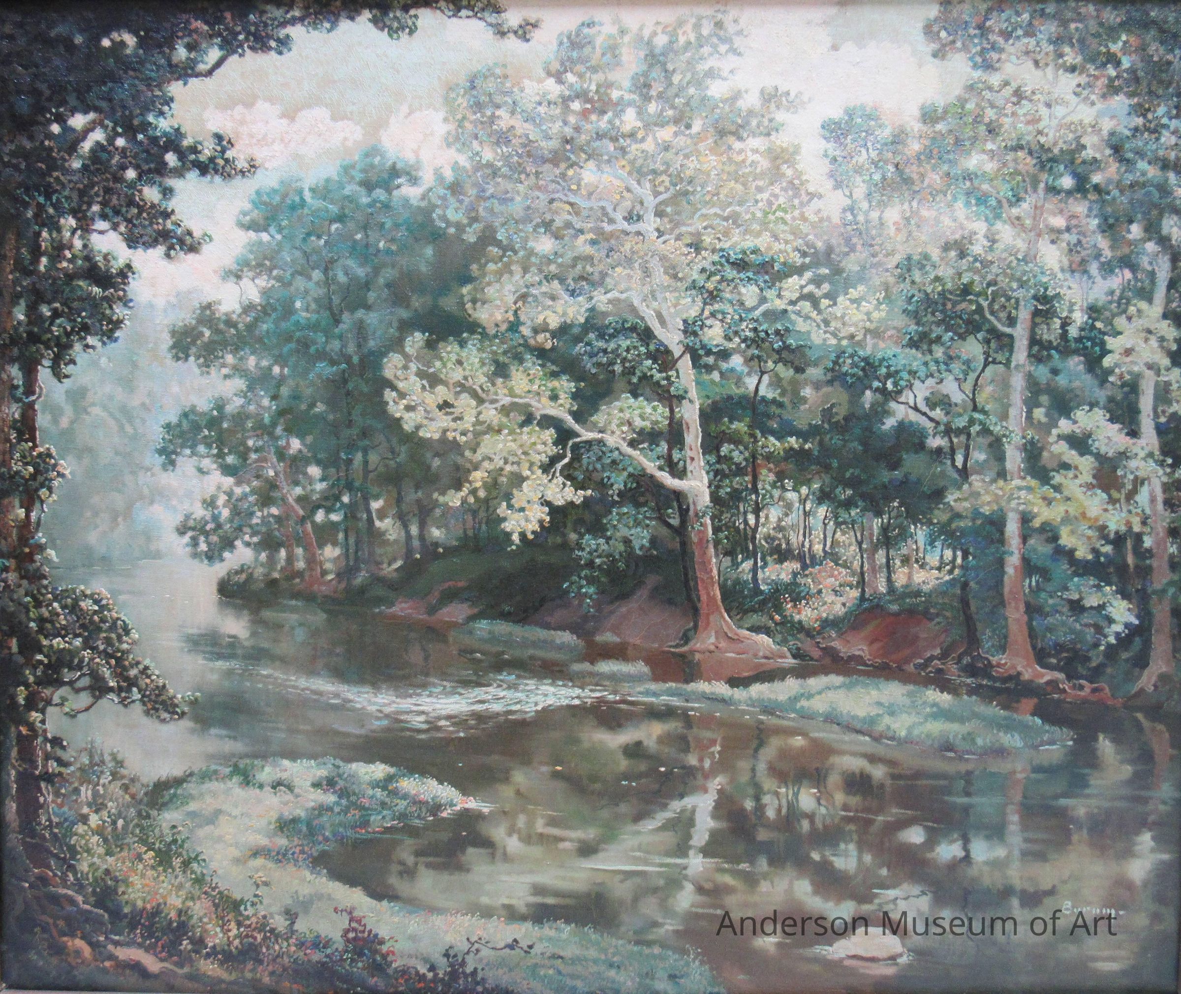 Forest and water scene. There is a river flowing through the painting with trees on both sides of the red banks. A tree in shadow lines the foreground along the left side and reaches across the top. It is a sunny day with the trees from the opposite side reflecting in the water. The painting has a spring feeling and is colored in a mostly green, white, and brown color palette. There are occasional spots and highlights of cobalt blue.Type of Painting