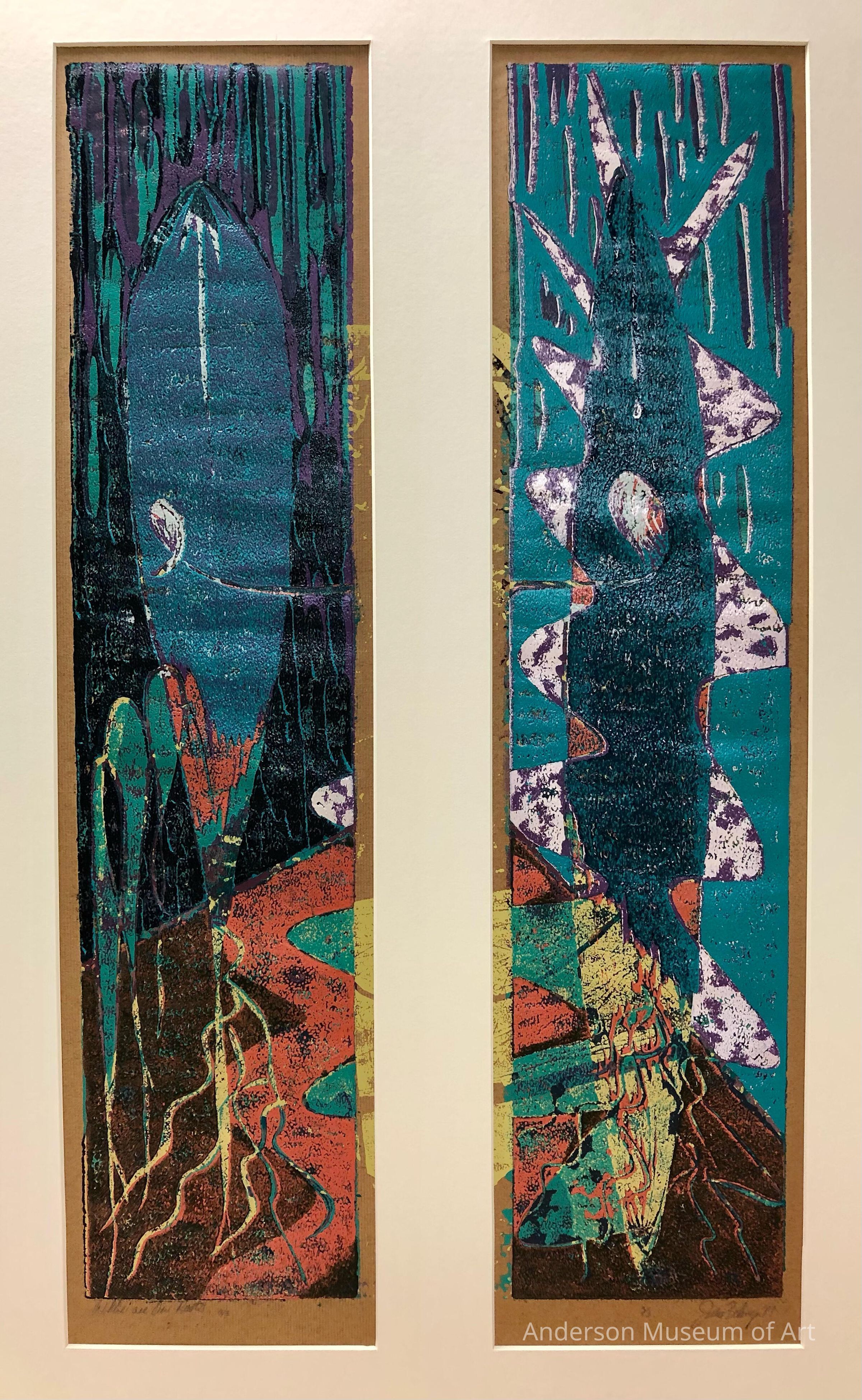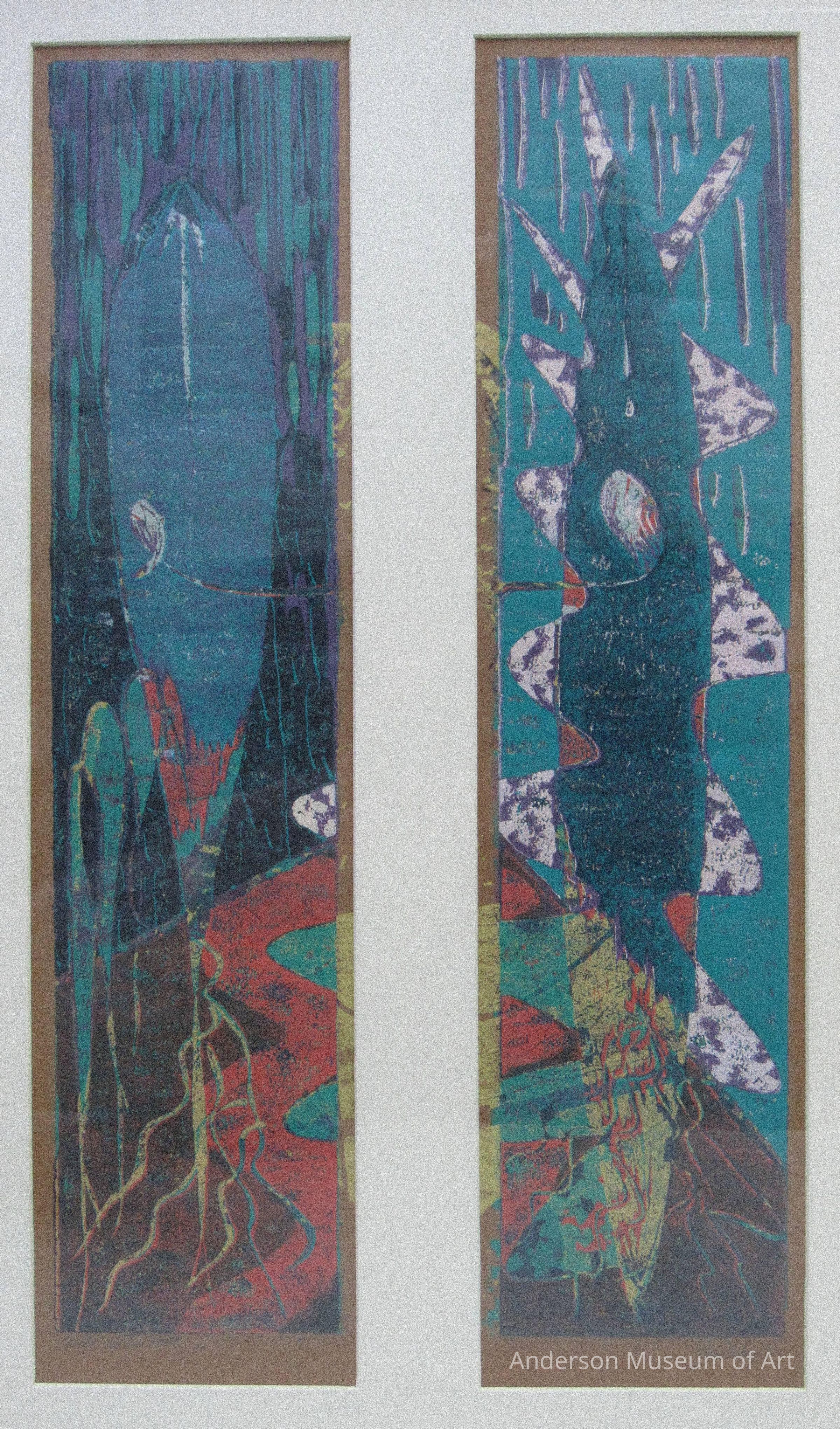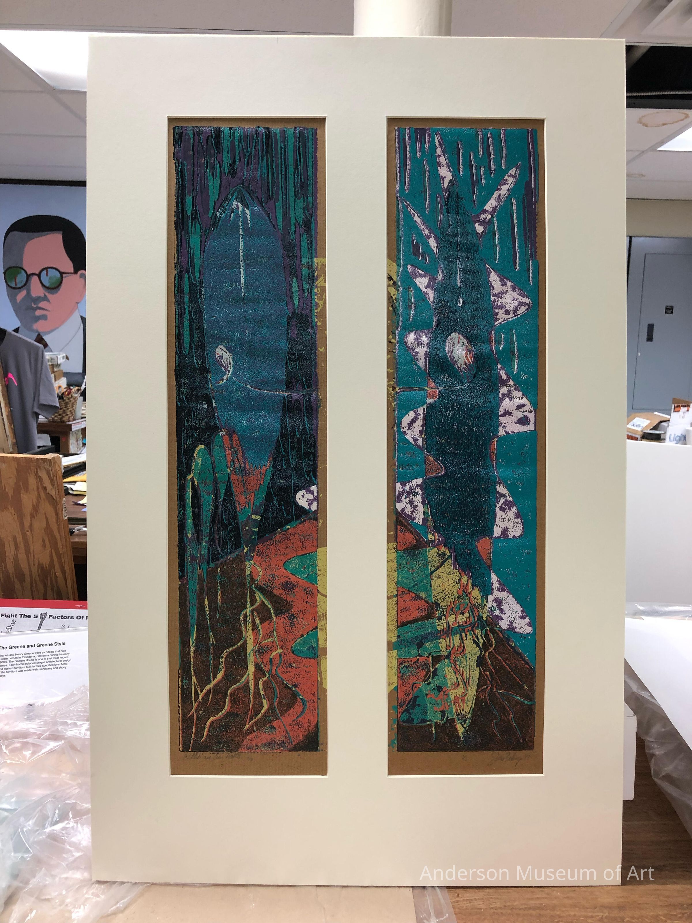 Abstract landscape. The matting separates the piece into two panels. The left side is darker with a black background. There is an oval/teardrop shape that fills up the top half and has roots at the bottom. There is also an orange winding path along the bottom right. The right side is mostly teal with another oval shape that covers the majority of the area. There is a white and purple zig zag behind the oval. The painting is colored in teal, purple, white, orange, yellow, and black.Collection
