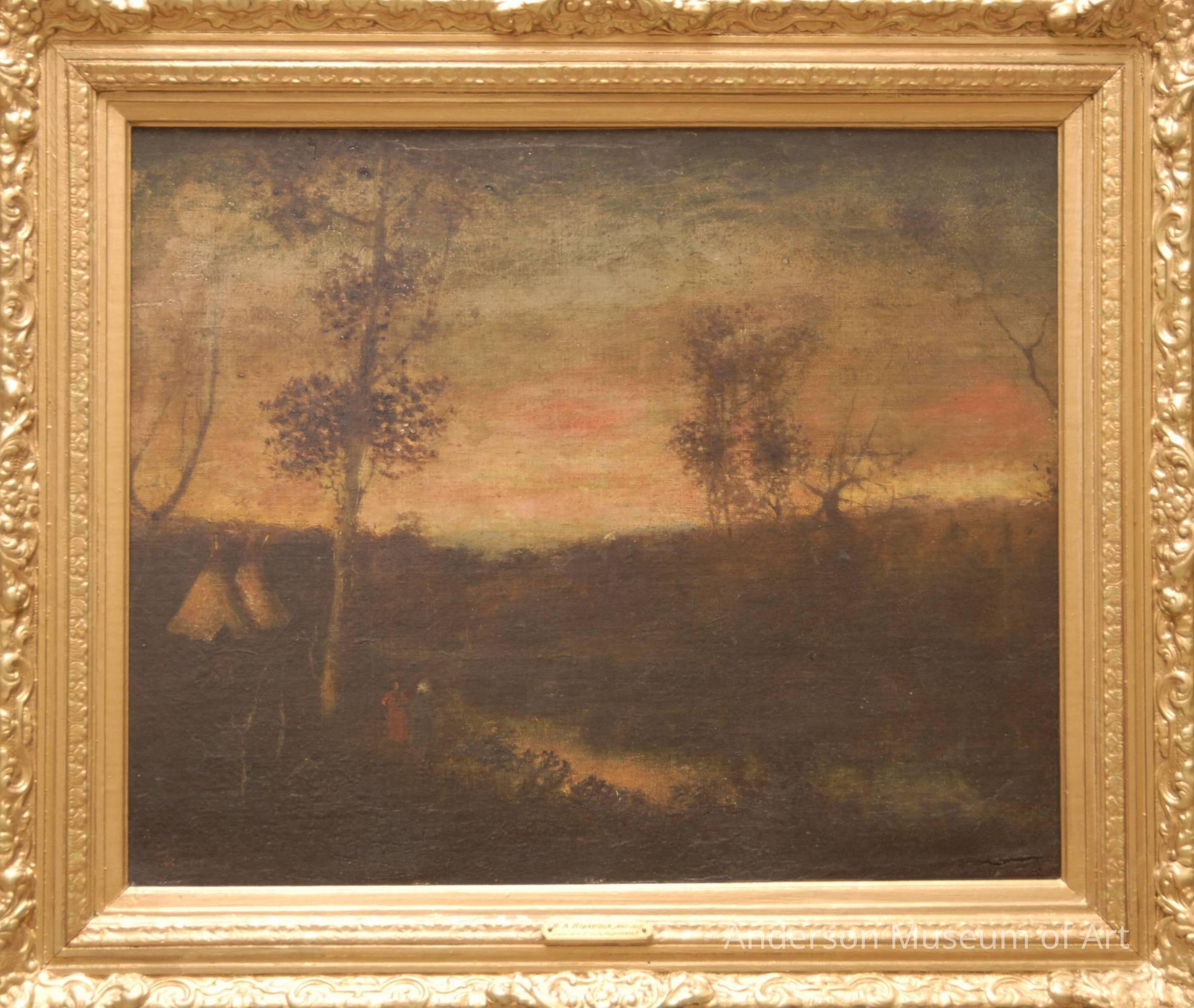 Dark-colored image possibly around sunset. There is a tree line at the horizon line with a river on the right. There is a tree on each side of the river, two figures in the foreground, and two teepees along the left middle. Pinkish sky.Type of Painting