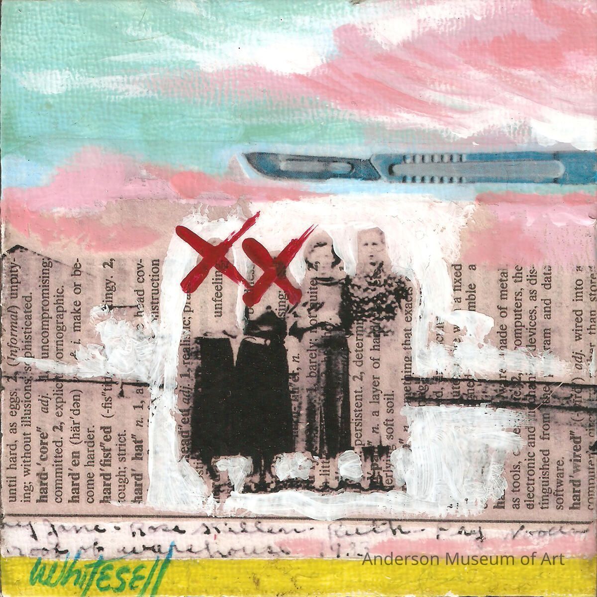 The collage itself is a 4" x 4" x 3/4" square attached to a black background and aligned in the upper half of the framed piece. The collage contains an image of four women, two who have their faces marked out with a red x, layered on top a dictionary page. Above the women is an image of a scalpel coming from the upper right side. The women have been outlined with a white paint. Above them are shades of teal and pink, possibly resembling a sky. The bottom contains a yellow strip with the artists signature in green.Collection