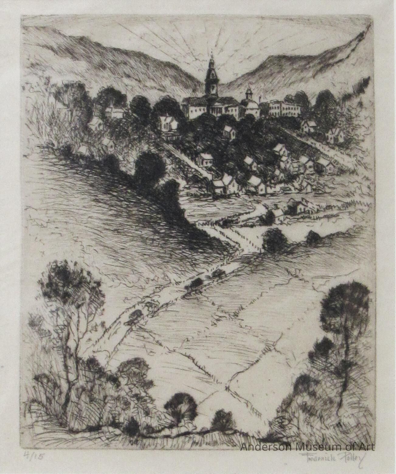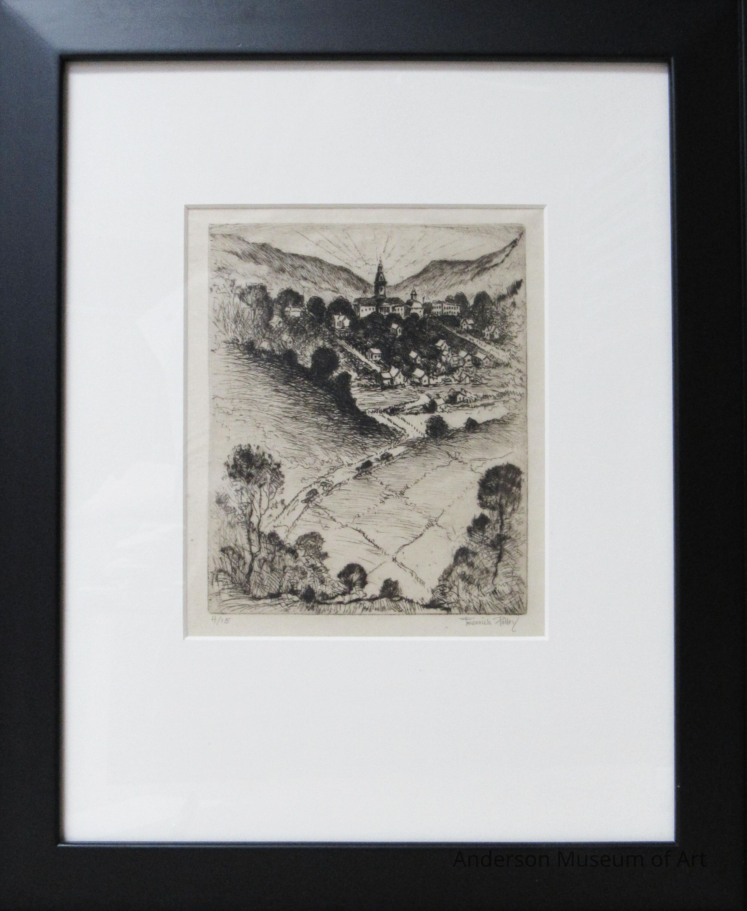 Etching in dark brown in on off-white textured paper depicting a rutted road extending from the immediate foreground into the middle-ground. Several figures upon the road are in the foreground, with some in the distance. To the right of the road in the foreground is a large tree which dominates the composition. Also to the right is a large house with some out buildings; a single telephone pole and wires and a fence running along the road. To the left of the road is a steep hill with a fence running along the crest of the hill, with three telephone poles with wires behind; and two buildings. The middle ground consists of several trees, with a open cloudless sky above. The print is signed in pencil below the image on the right side, "Frederick Polley" and is numbered in pencil below the image on the left side "6/25."
