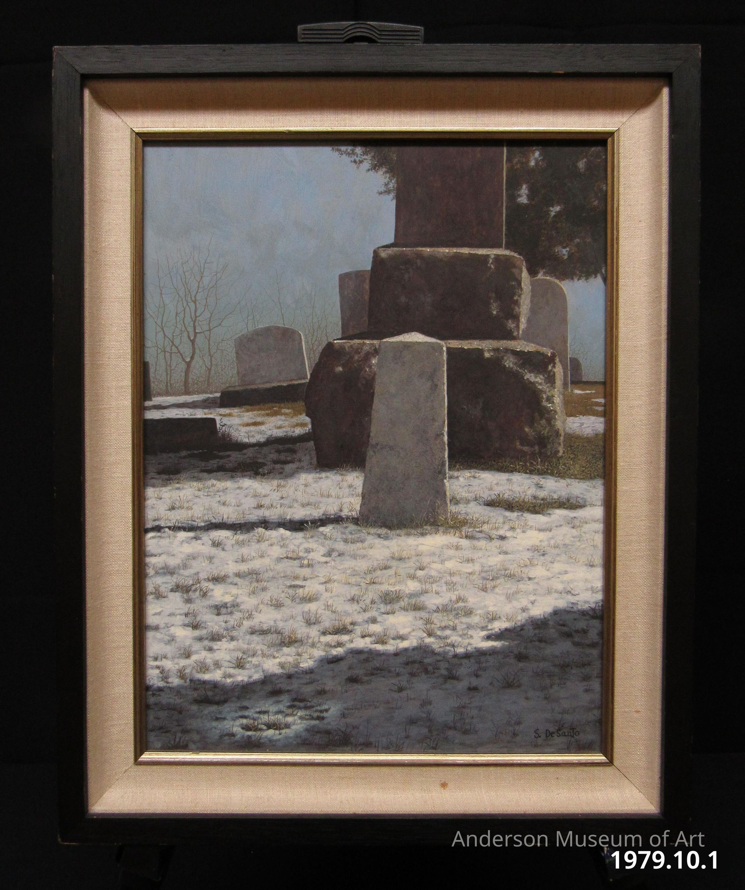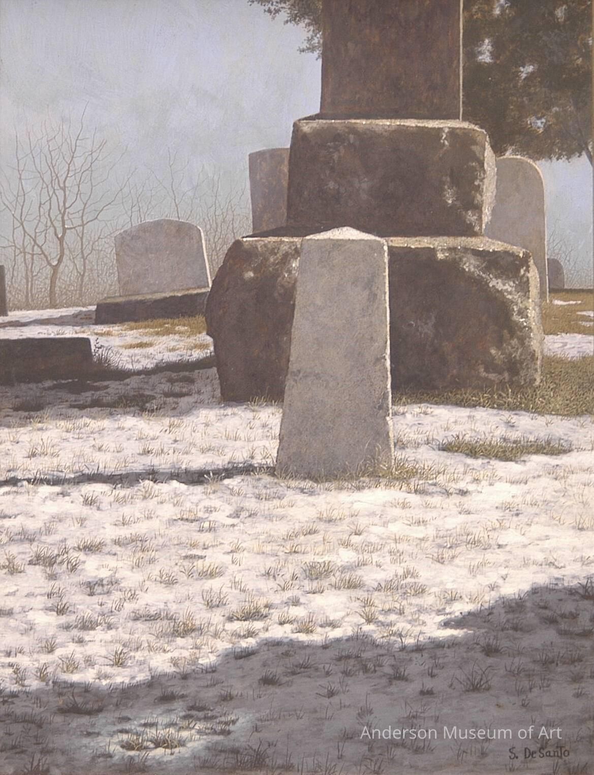 Realistic rendition of snow on gravestones with blades of grass still showing underneath the blanket of snow. There is a small white headstone as the focal point. Behind it and flowing off the top of the image is a larger and darker gravestone. There are several other white headstones in the background. There is a tree in the top right corner and a dark shadow in across the bottom of the painting. There are also bare trees across the background. Signed S. DeSantoType of Painting