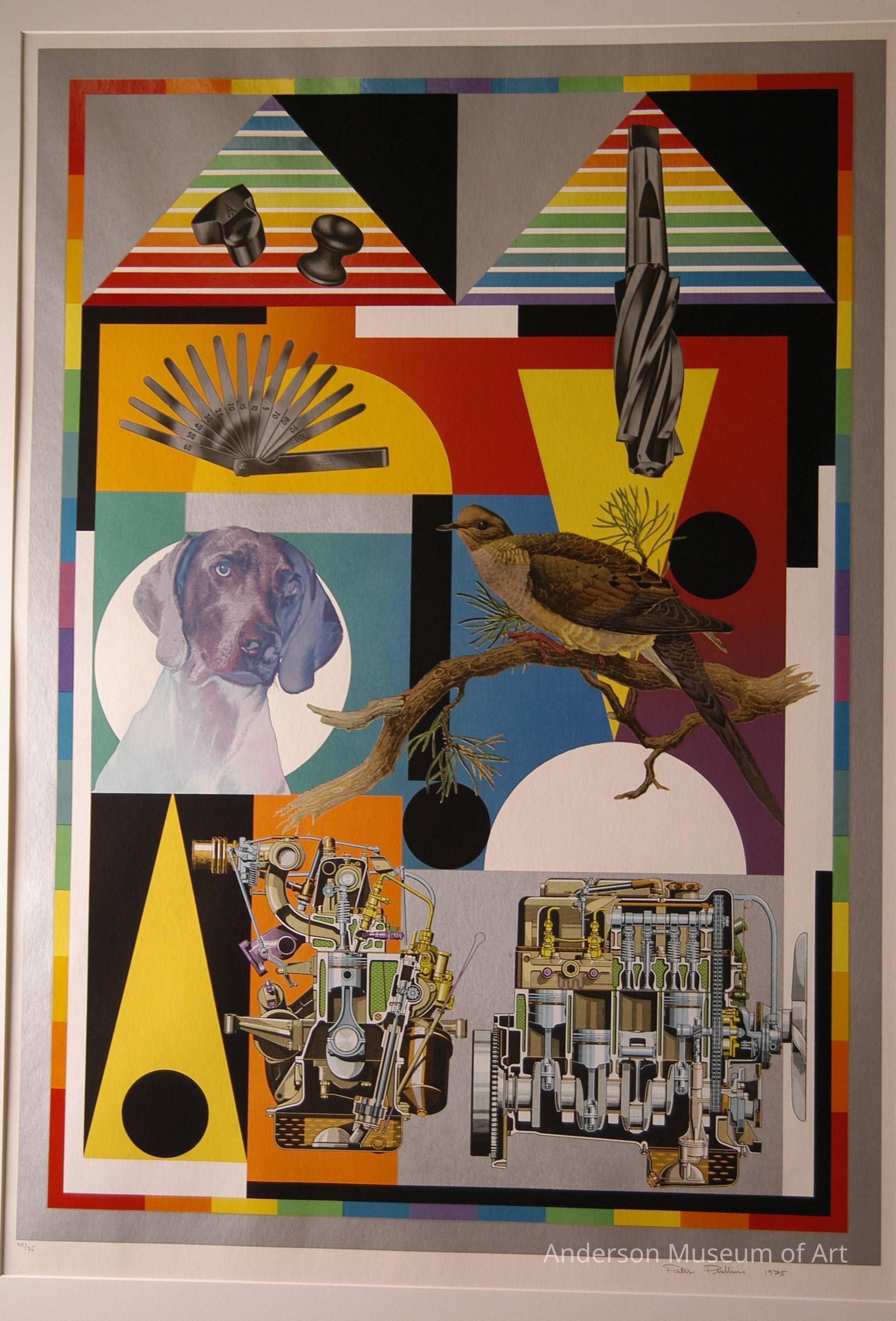 Serigraph and collage on heavyweight white paper with no watermark. The image is comprised of an intricate geometric background serigraph in many intense colors and silver with several photographic and/or reproduced images collaged over the serigraph. These include (starting in the upper right quadrant and moving clockwise) a drill bit, a bird perched upon a pine bough, a side view cross-section of an automobile engine, an end view cross-section of an automobile engine, the head of a hunting dog, a toll and die gage, two machine parts. The print is numbered in pencil below the image to the left "40/75" and is signed and dated in pencil below the image to the right, "Peter Phillips 1975"