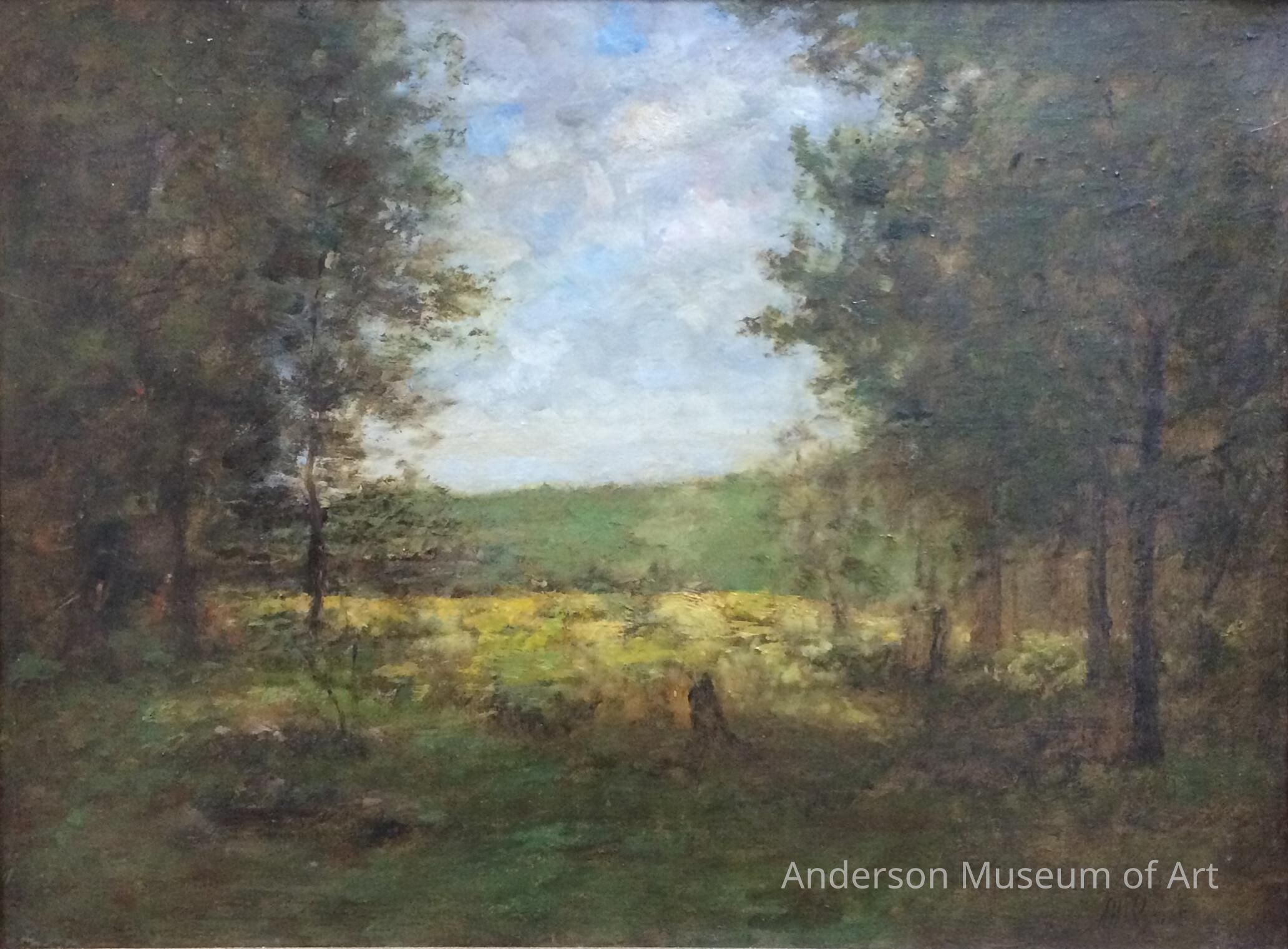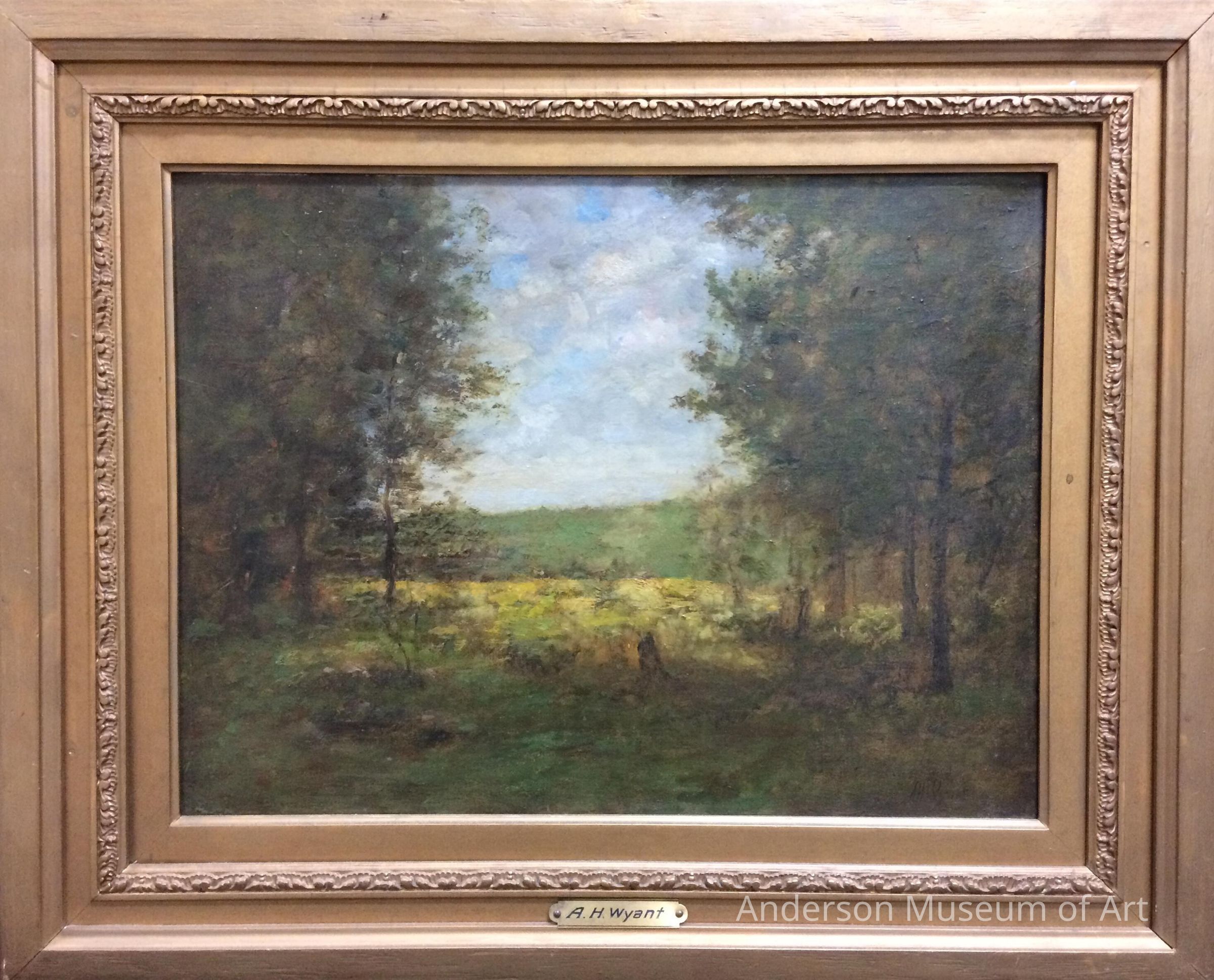 Path with trees along each side leading to a valley. The valley is a light green with the sun illuminating it. There is a blue sky with clouds. Frame has a gold name plate "A.H. Wyant"