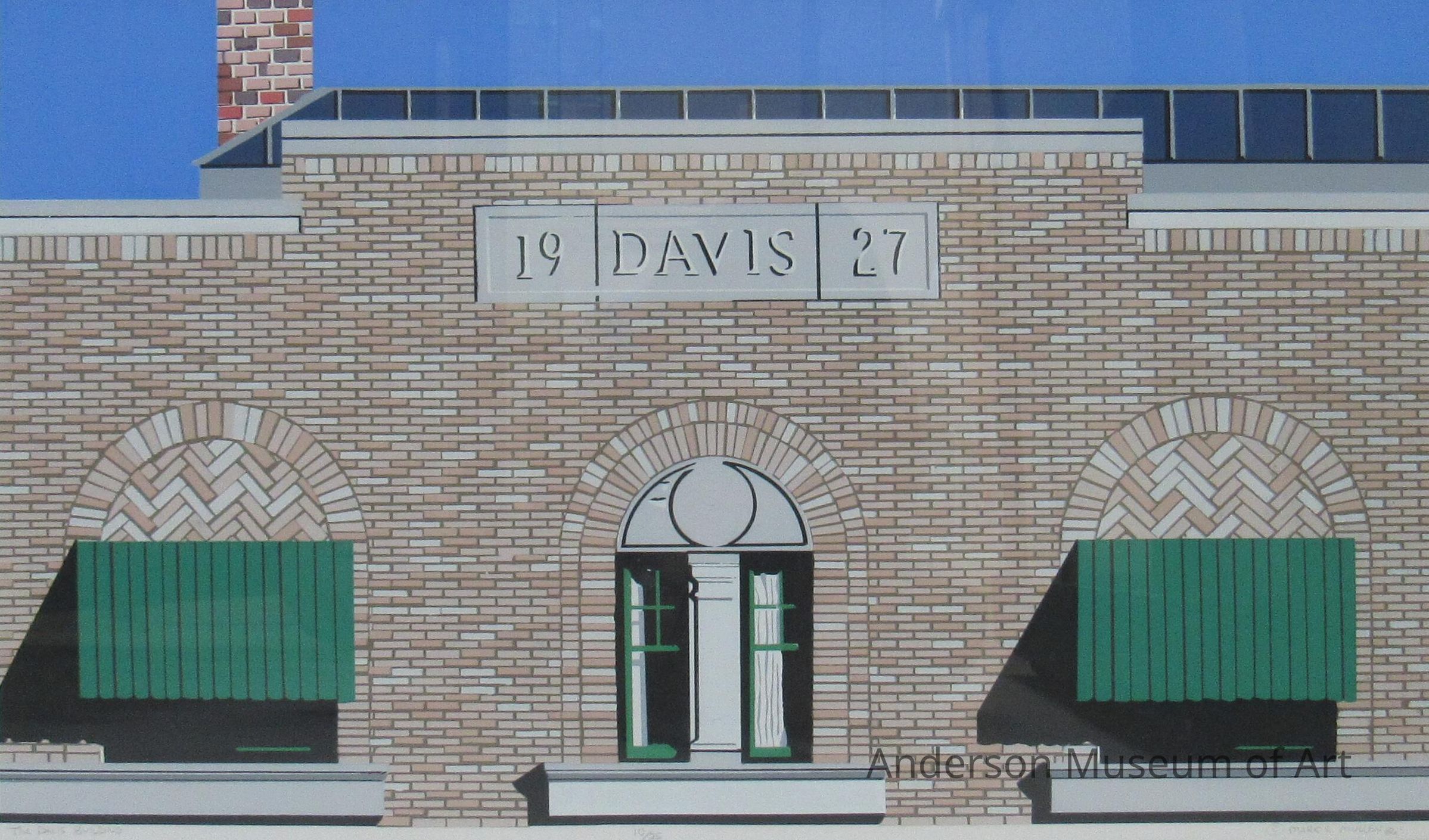 This print is a simplified image of the Davis Building. It is a close-up of a higher floor, possibly the second. There are two windows with green awnings on each side of a centered, open window. The bricks above the windows are arranged in a Romanesque arch. Above the open window, it reads "19 Davis 27". The building is colored in pink and white bricks with a bright blue sky. Everything is colored with a solid color. In pencil below the image is written "The Davis Building, 10/25, Copyright Mark A. Mullen '86."Collection