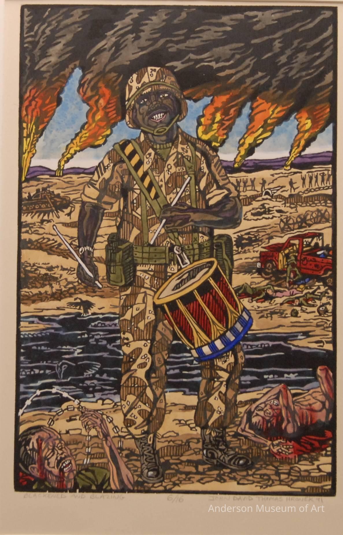 Image of a soldier on a battlefield. The soldier is dressed in a combat uniform and is smiling. He is also playing the drum that is strapped around his shoulder. Behind him are five orange and black smoke clouds, figures both alive and dead, a tank, and a red pickup truck. Directly behind the soldier is a black puddle. Next to his left foot is a bloody body, and next to his right is a bloody body with barbed wire around him. Print 6/16Collection