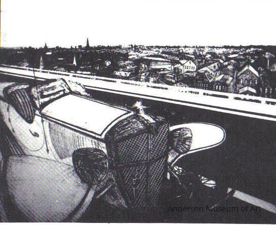 Vintage car with top down driving towards the viewers right on the freeway. The car and freeway are overlooking a large city to its left. Colors are black and white. Signed "Freeway 8/50 B. McCombs '72" in the lower right corner.Collection