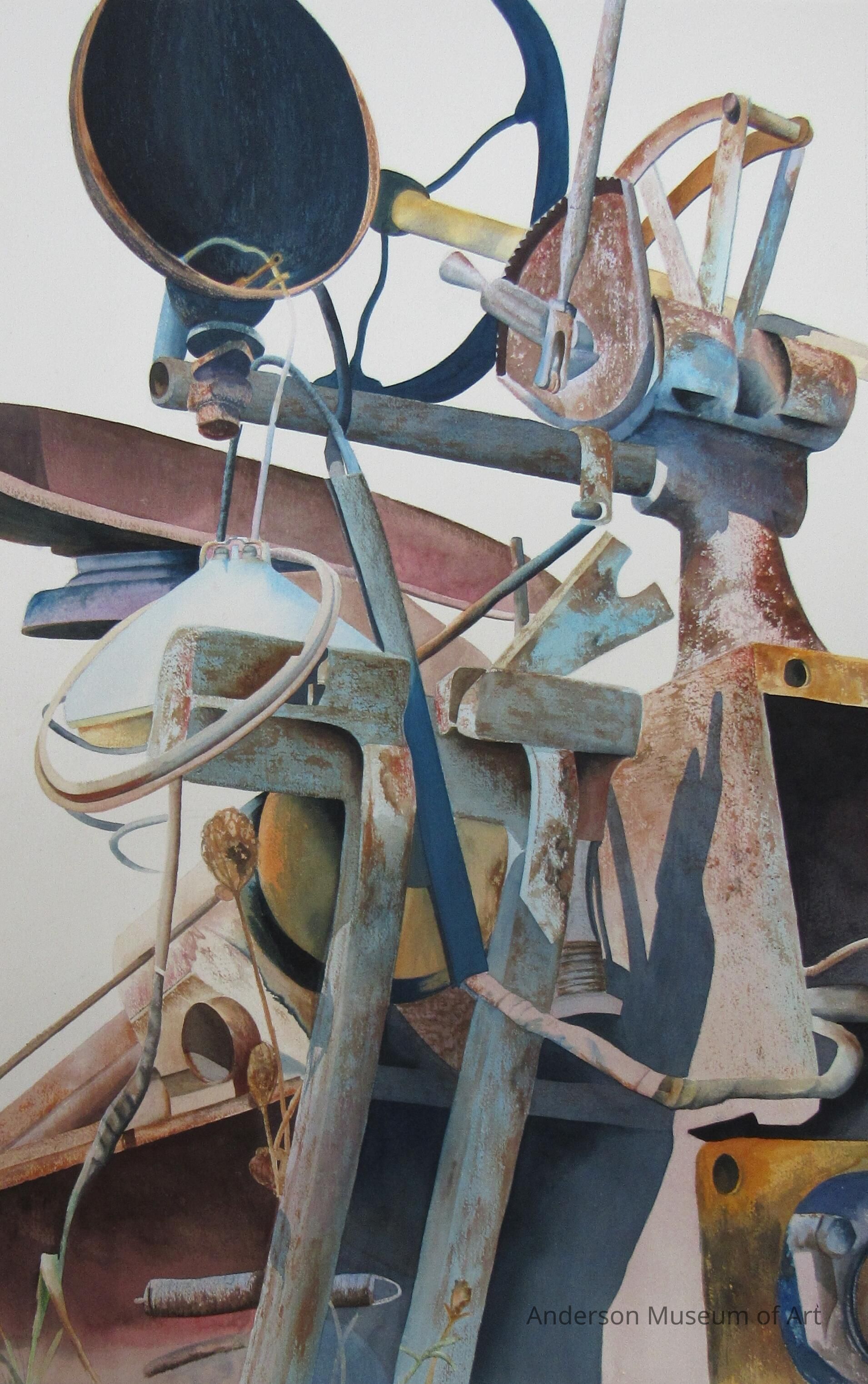 The image appears to be of a rusting piece of machinery, probably a tractor. UL, there is a headlight cowling with the sealed beam light dangling by two wires below it. There appears to be a set of gears and levers; above this, there is a steering wheel. Below the steering wheel, LC is a metal seat. Foreground LL to LC is two large foot levers with what appears to be rusting Queen Anne's lace flowers growing nearby. The piece is signed by artist LL, on the horizontal object that looks like a burning cigar, "J. Anna Roberts." Watermark UL: can clearly read "FRANCE." There is another word, but not readable. Verso is written LL in pencil "Carlson Landscape painting by Henry Bell applications."Type of Painting