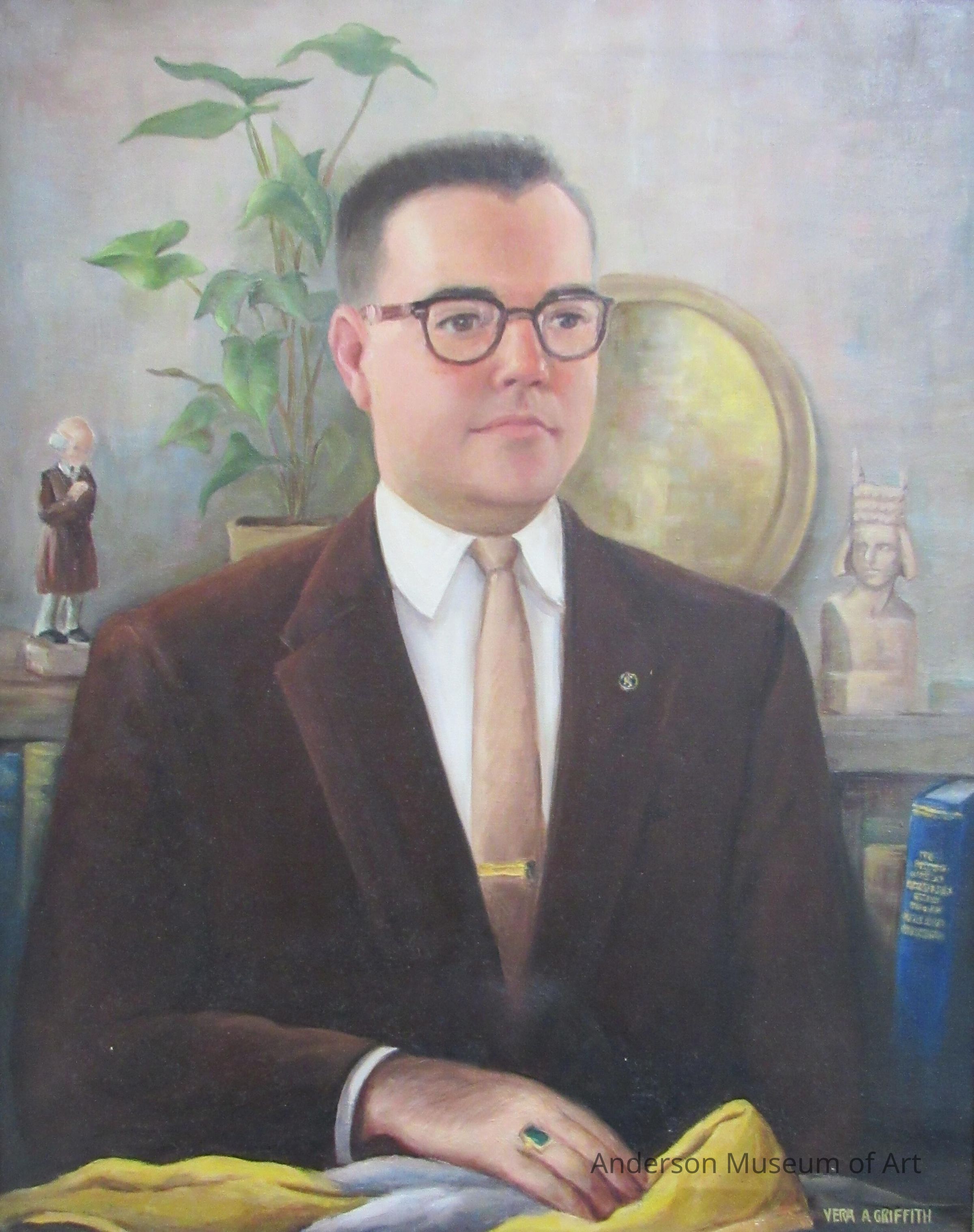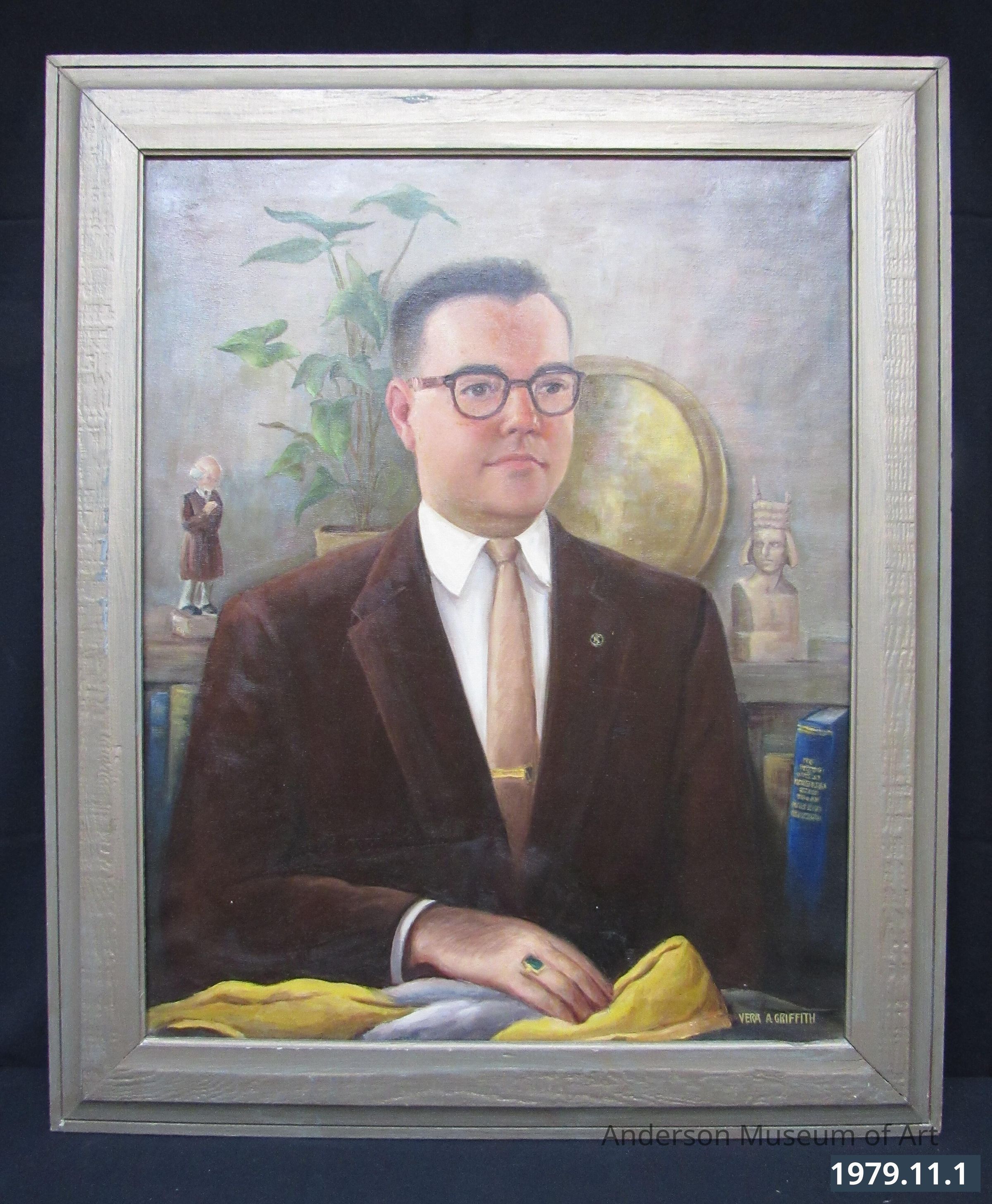 Portrait of a seated gentleman--Jack Nicholson. He is wearing a dark suit jacket, white shirt, and a brown tie. He has thick, dark glasses, a green ring on his right hand, and he wears a club pin on his lapel. Under his right hand is a yellow and white cloth. Behind him is a book shelf and on top of the bookshelf is an old man statue, a potted plant, a gold plate, and a white Egyptian bust.Type of Painting