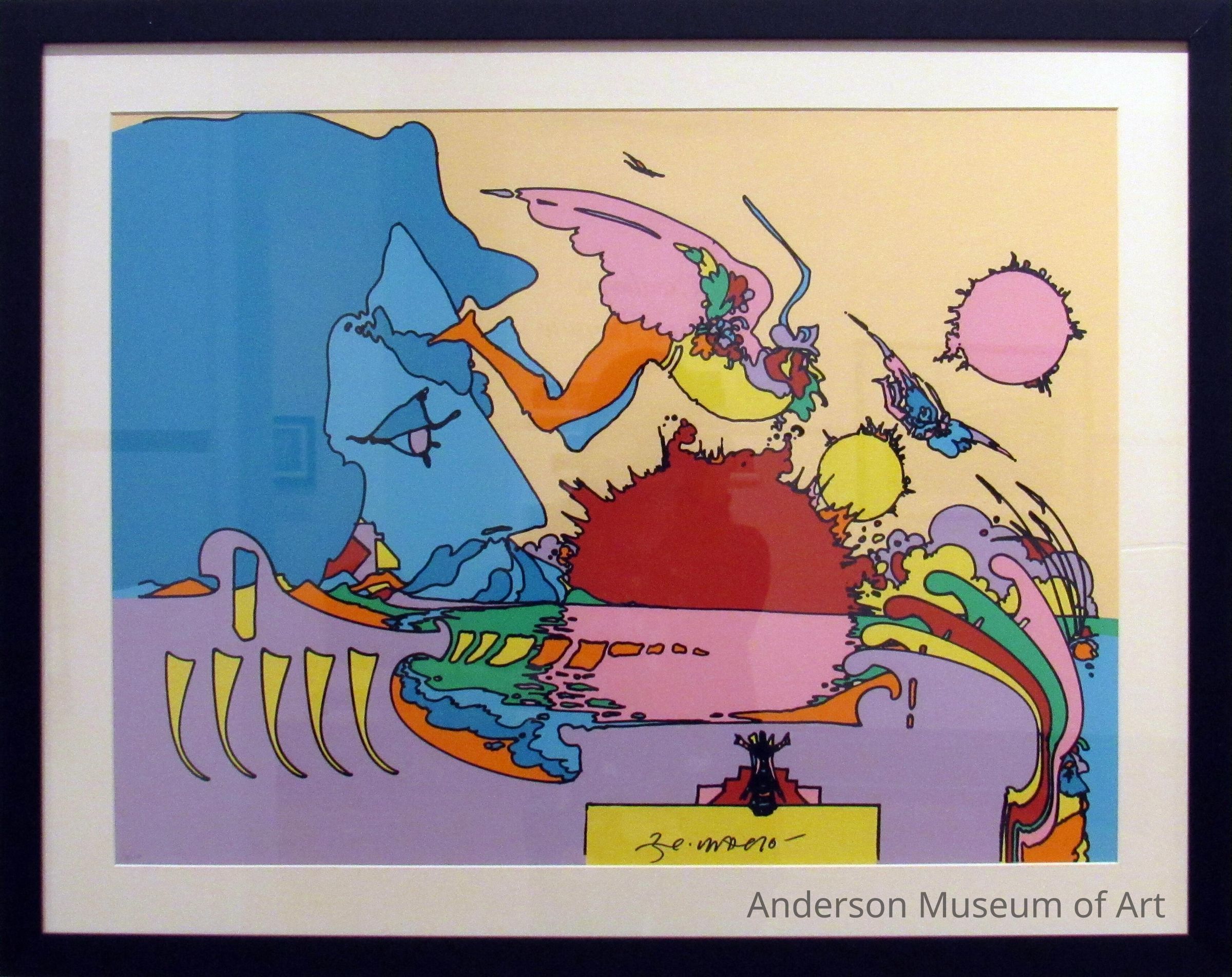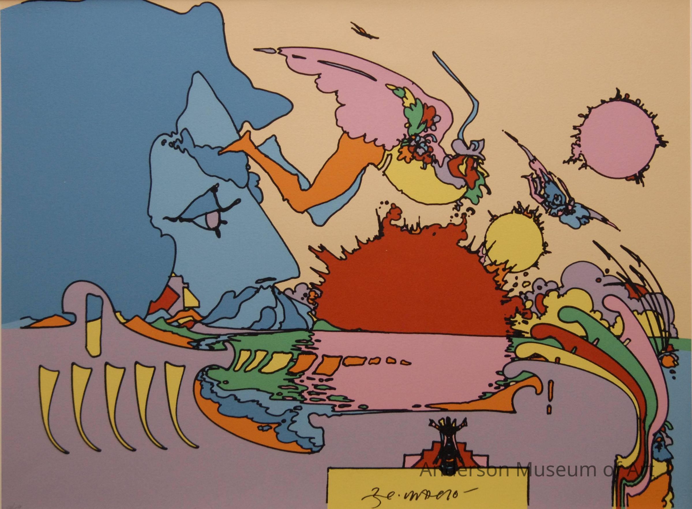 A giant red sun sits on the horizon reflecting in the water while the top of a huge man's head is facing the central sun, to the left of the sun. Two other forms are in the sky as well as some humanesque forms with wings. A protractor inspired barrier is in front of the lower picture, as well as some cryptic writing. Signed in the lower right corner and dated 1970. Print 58/100.