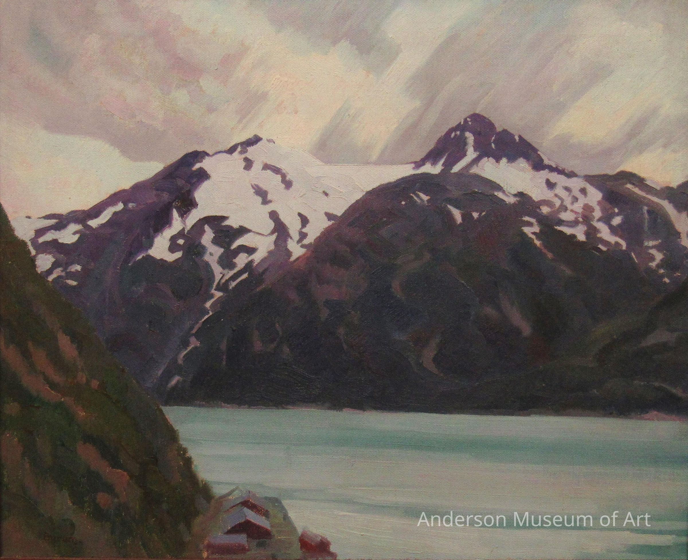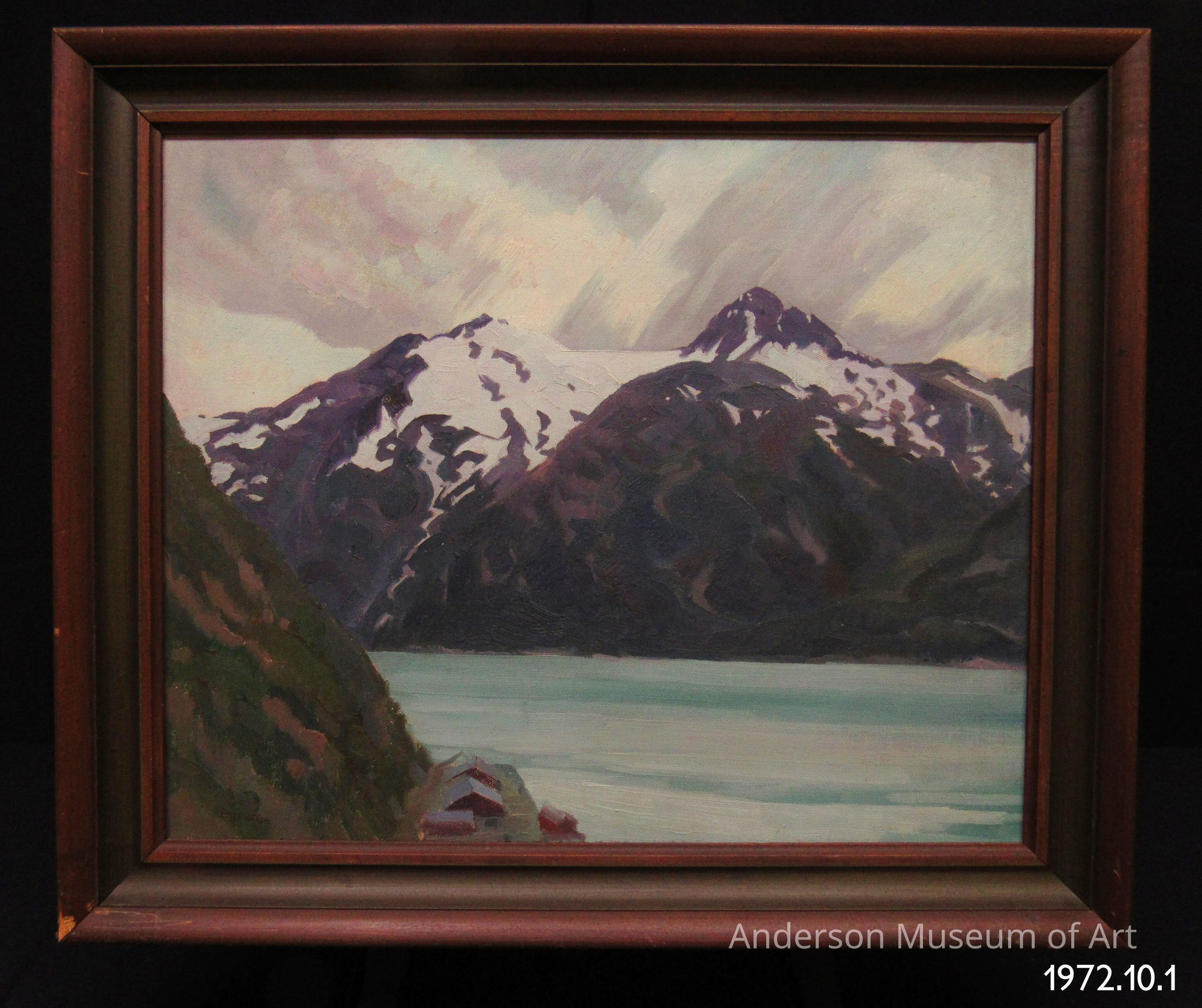 Scene depicting snow capped mountains on the far side of an expanse of water from a partial view of another mountain. The closest mountain is painted in greens and browns, and the distant mountains are purples, browns, and white in color. The sky is cloudy, light coming from the upper right. It is signed "Byrum" om the lower left corner. This is the preliminary painting sketch for Skagway, Alaska (1967.1.14 ).Type of Painting