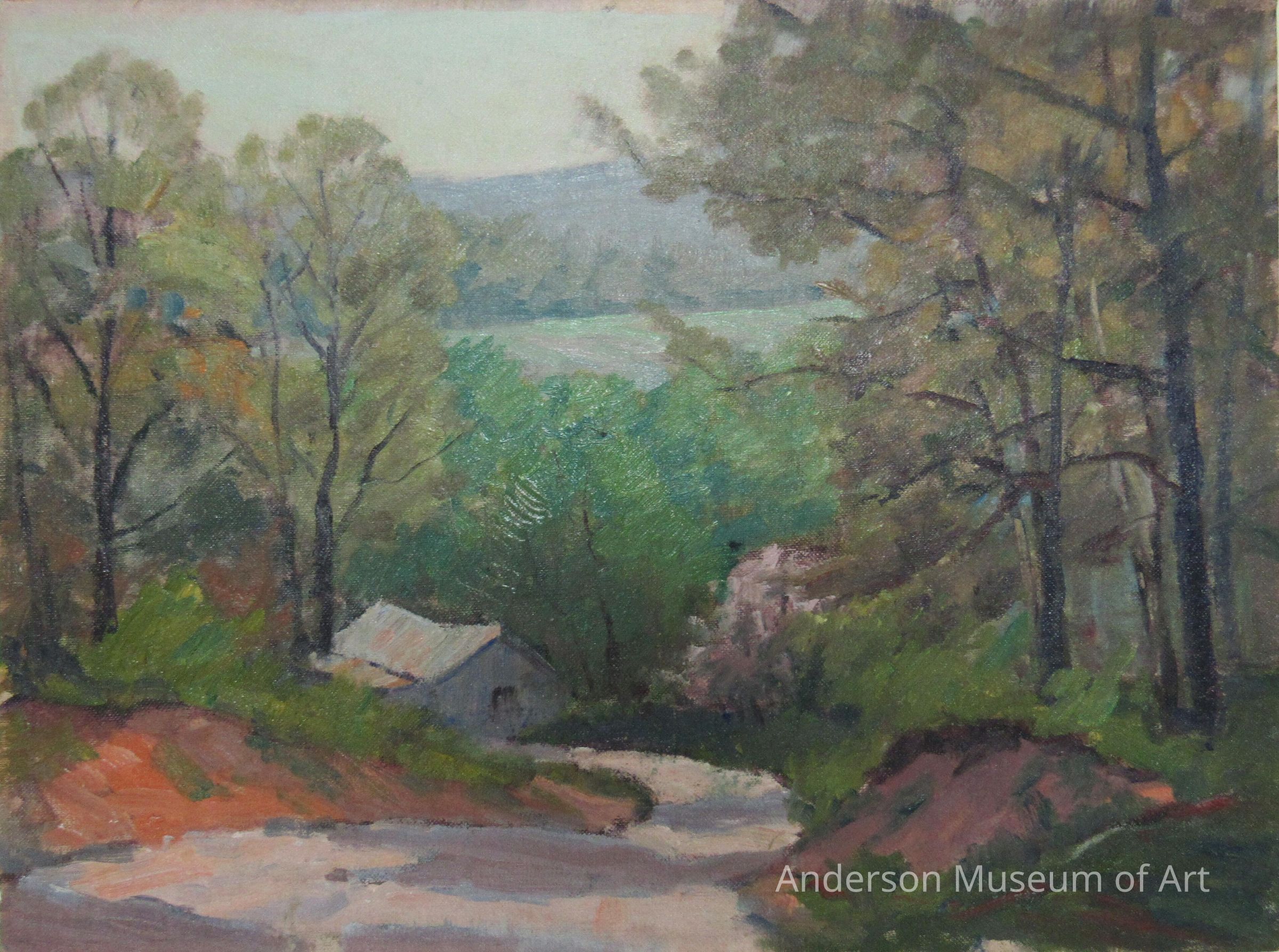 Painting of a wooded and hilly landscape. There is a white and purple path that begins at the bottom left corner and winds to a grey barn. There are many trees in the foreground. The trees along the horizon line are a bight green while the trees in the foreground are more olive green and multicolored. Behind the trees is an open field and then more trees and hills.