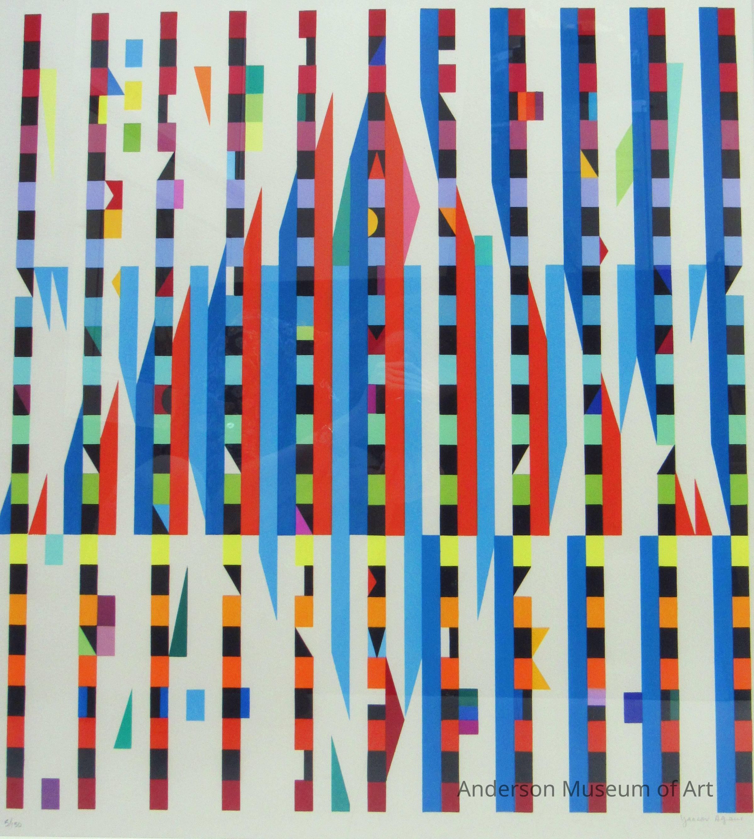 Hard edged multi-color print made of bands of color. A Star of David image is evident in the center of the composition. There are 11 vertical lines that follow the rainbow from a red-violet at the top down to red. Where the lines transition from green to yellow the vertical lines change. From the green up there are also red, white, and blue lines going up of various lengths and only white and blue going down. "5/150" is written in the lower left corner, and it is signed "Yaccov Agam" in the lower right corner.