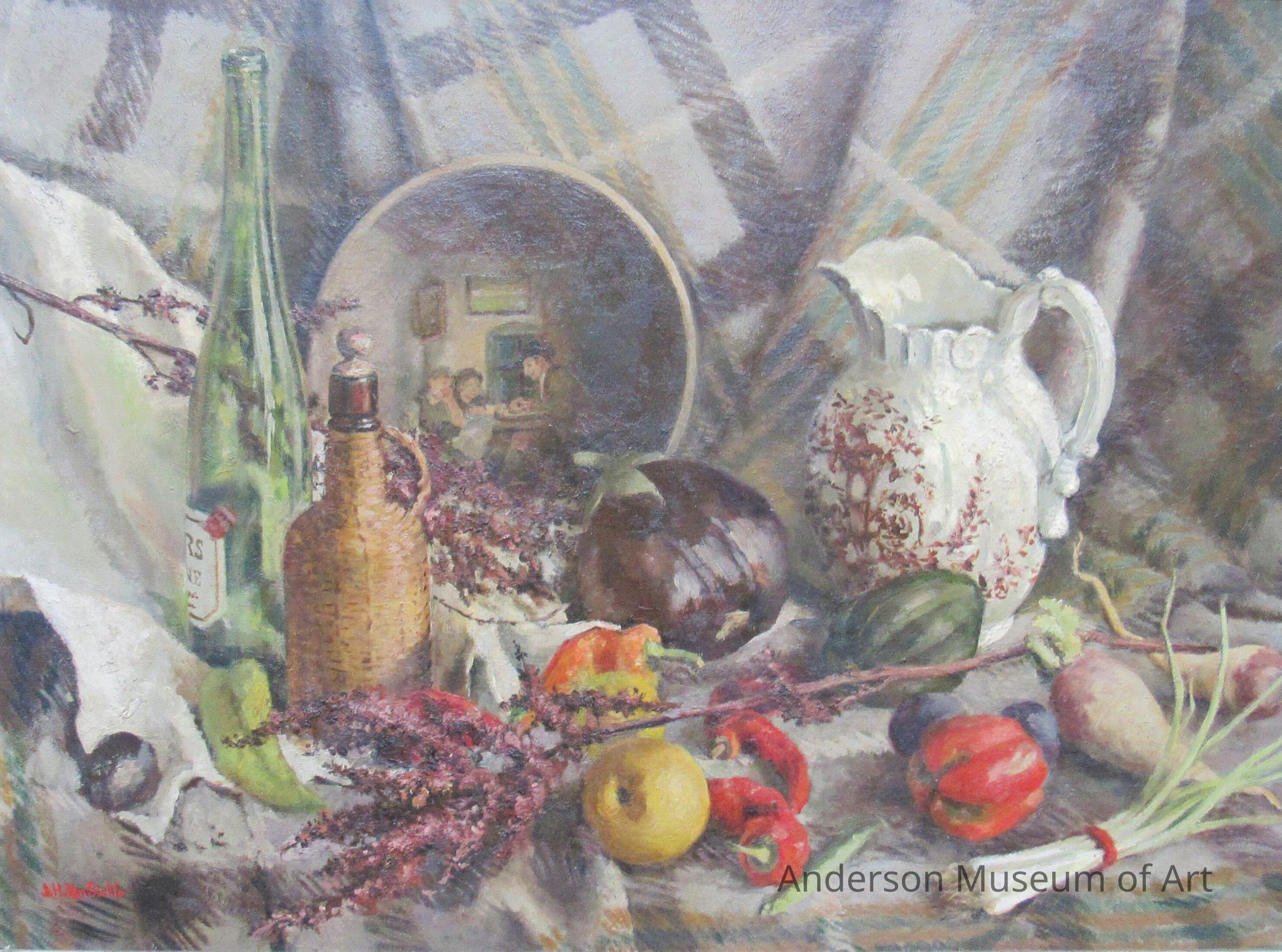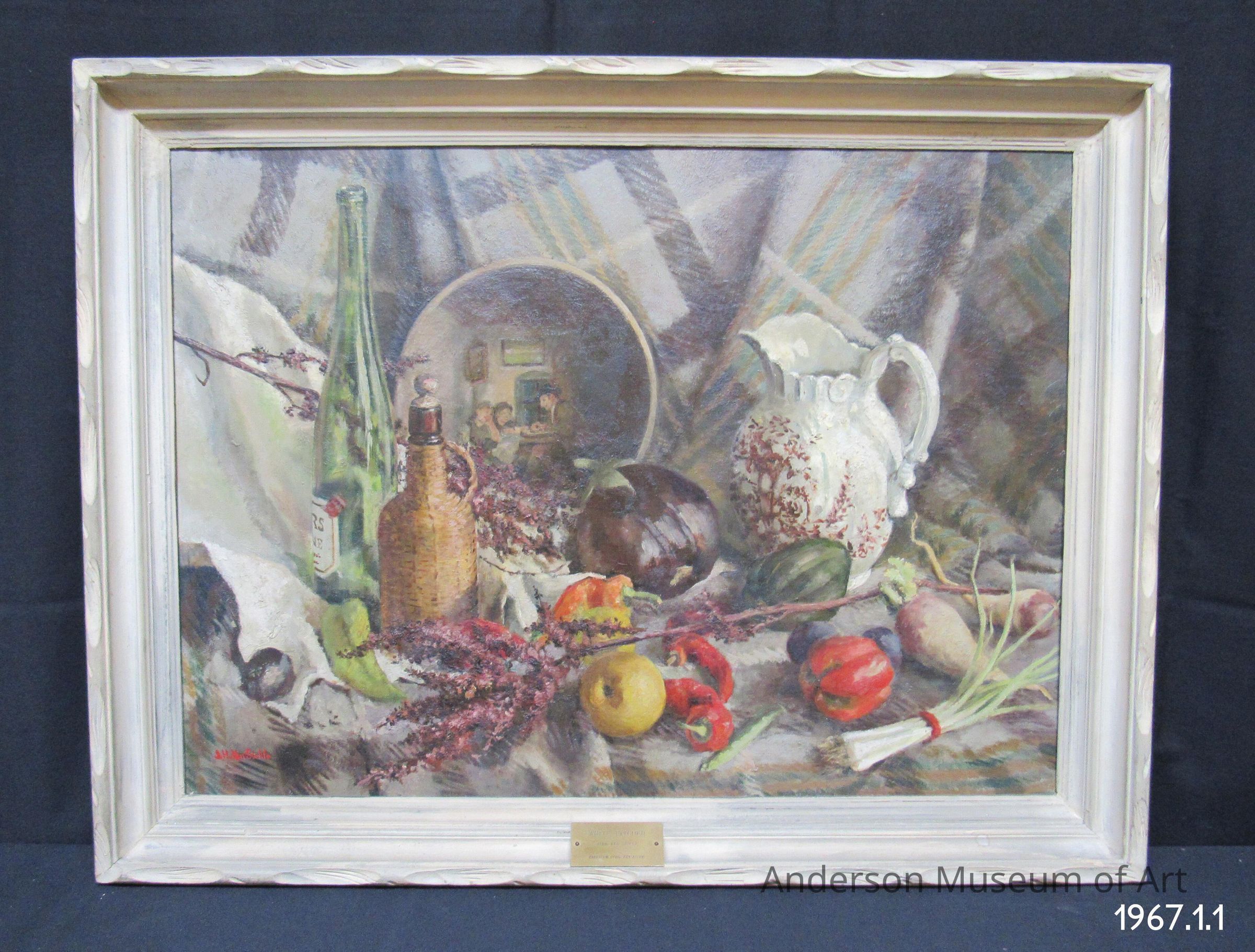 Oil on canvas of a still life depicting peppers, onions, turnips, an apple, eggplant, dried herbs, a tall green wine bottle on the left, corked brown bottle beside it, an illustrated plate of an interior scene of three figures at a table, and a white pitcher on the right with a brown floral pattern. The objects rest on a plaid blanket or cloth which also serves as the background. A white cloth also extends into the space from the left side. The painting is signed in red on the lower left side "J. H. Van Sickle".Type of Painting