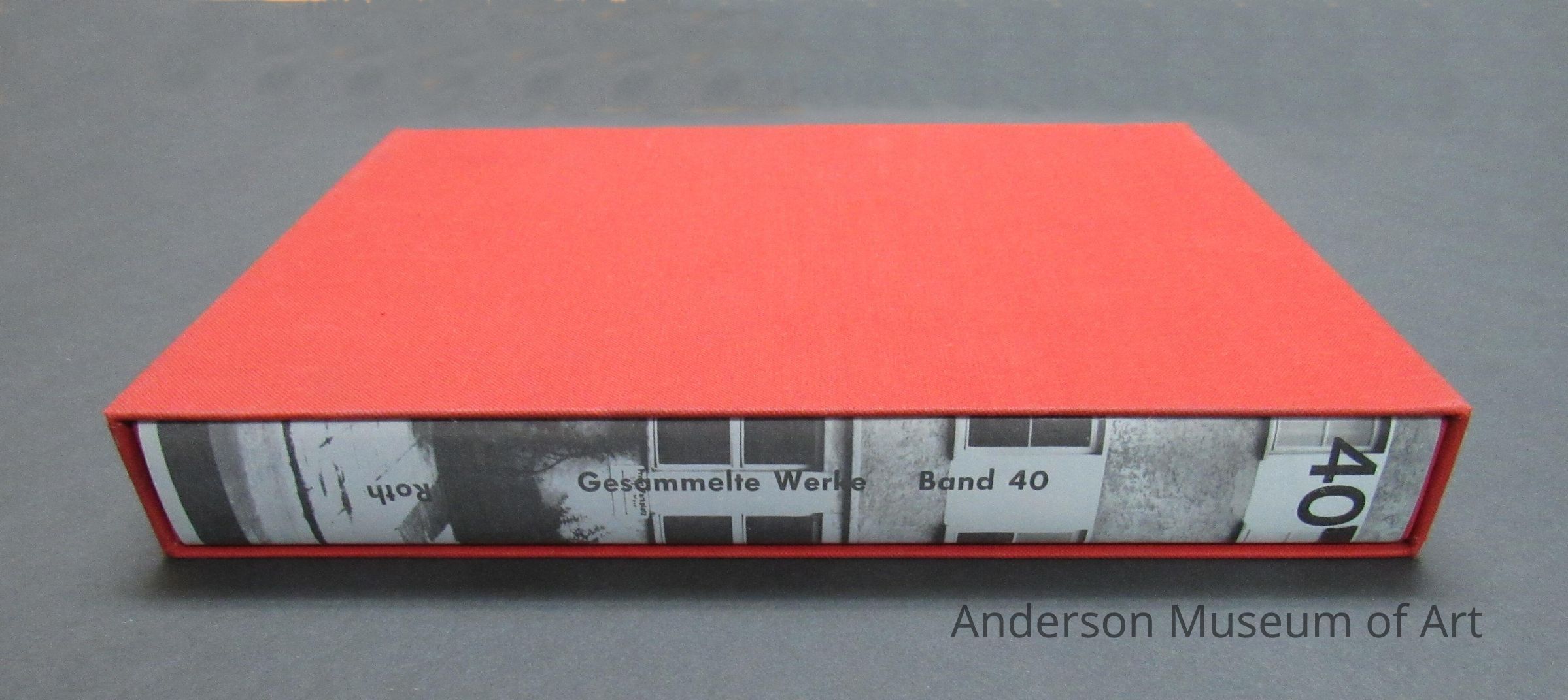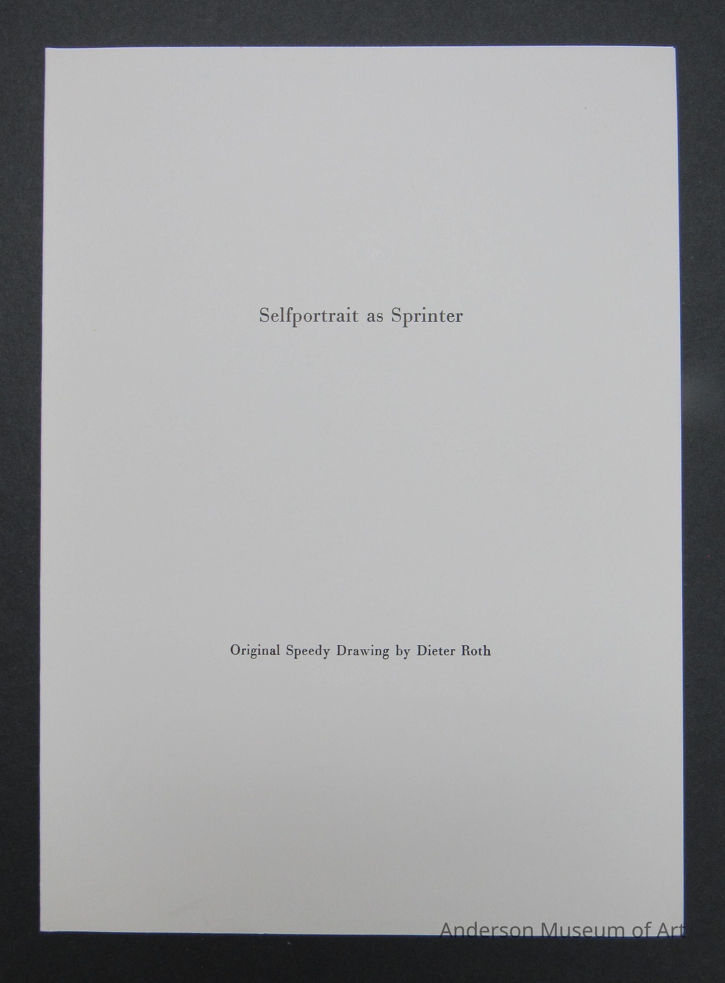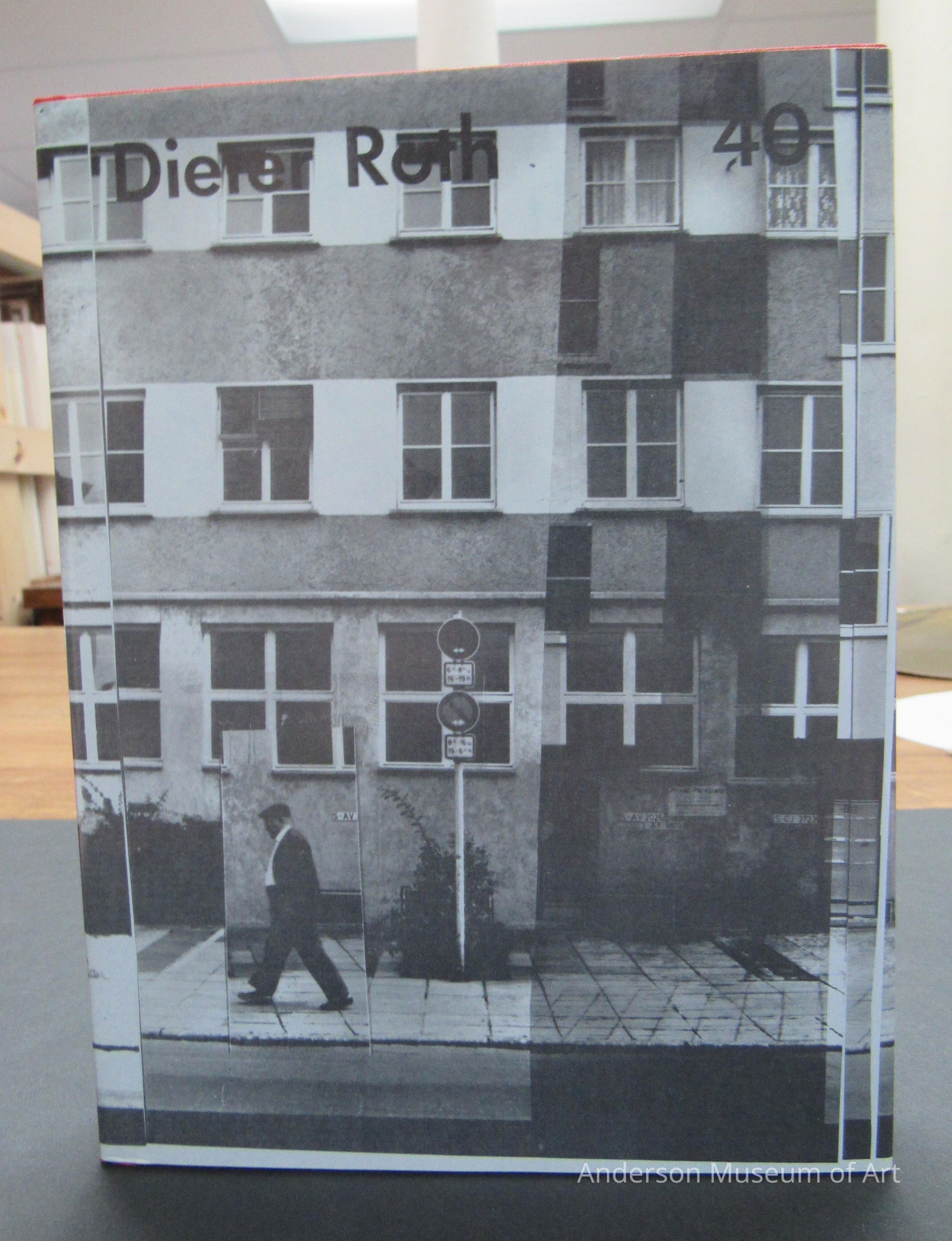 "Dieter Roth / Collected Works / volume 40 / Book and Graphics (part 2) and other stuff / from 1971 until 1979 / (including supplement to part 1)" Book with a blue and white image of a man walking on front of a building on the jacket. The book itself is red and fits into a red slipcover. There is a original drawing included titled "Selfportrait as Sprinter / Original Speedy Drawing by Dieter Roth". The drawing is an abstract image of someone running with some red and blue coloring. It is signed and dated '80. Edition Hansjorg Mayer. Published September 1979. Printed in Germany.Collection