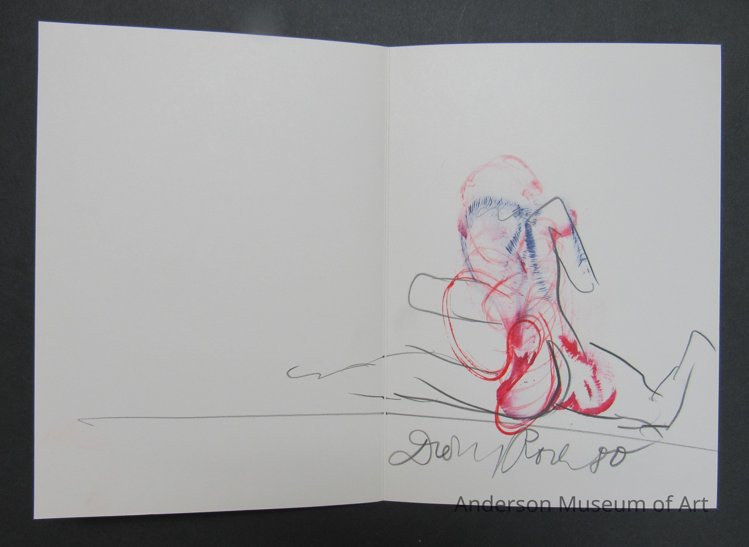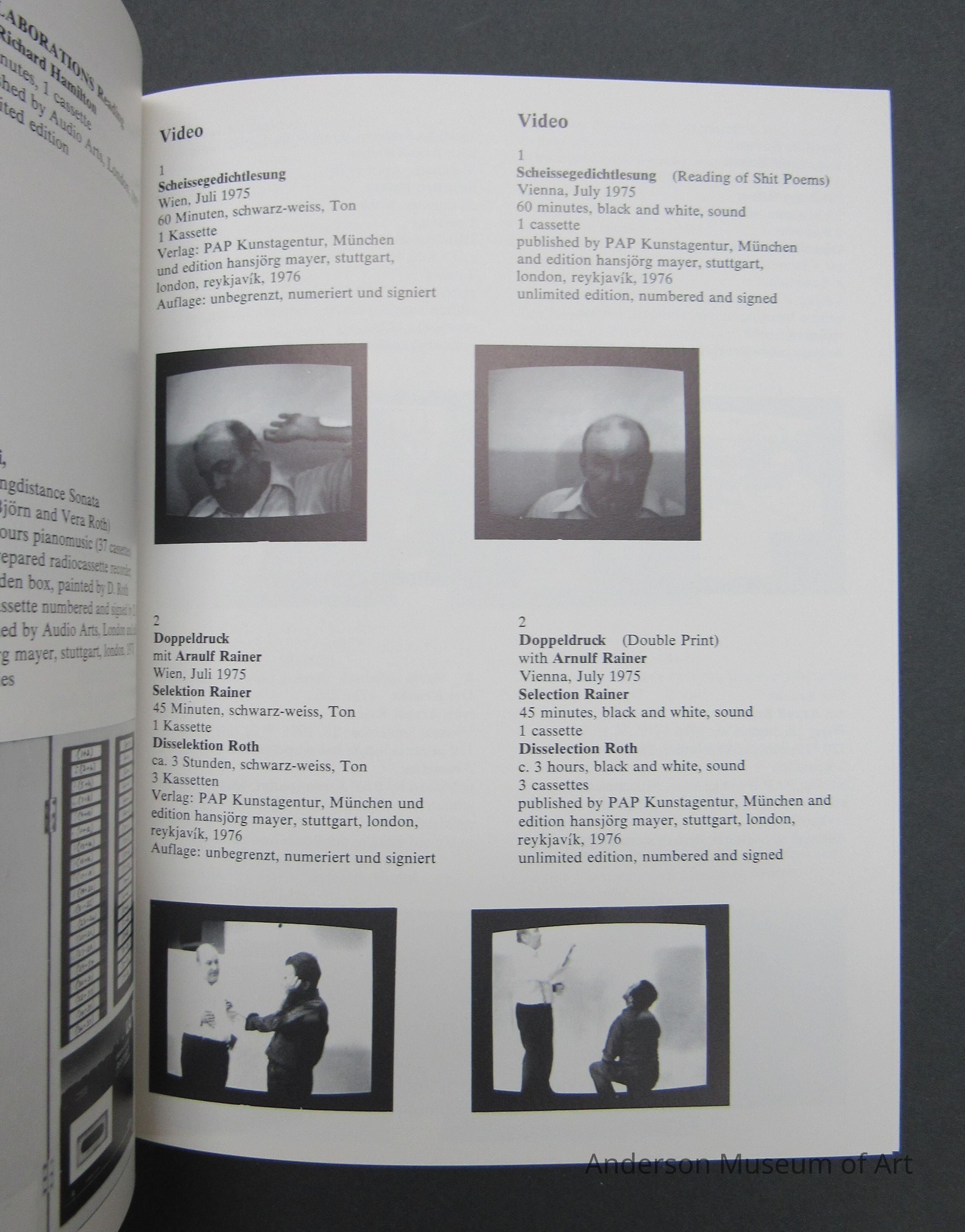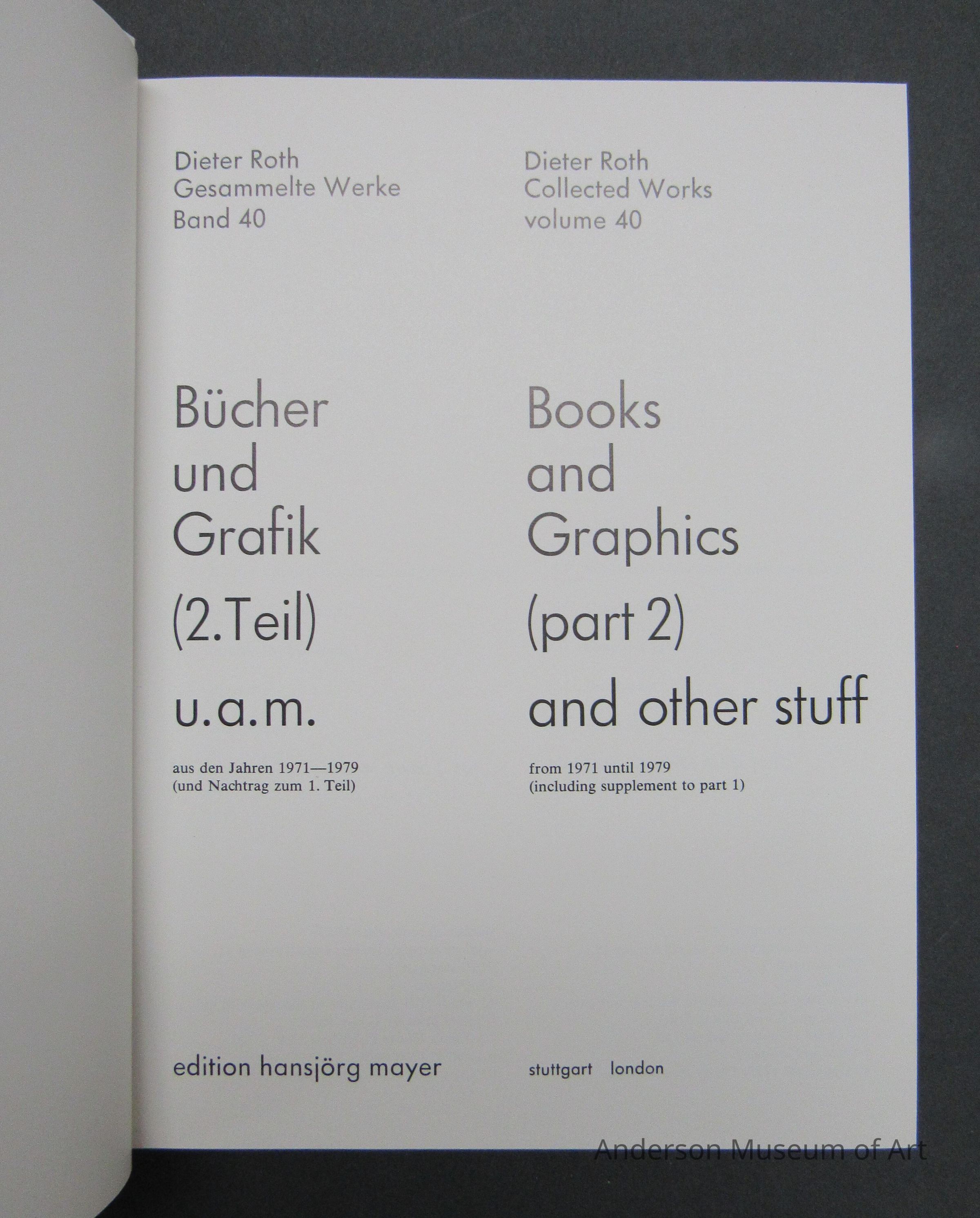"Dieter Roth / Collected Works / volume 40 / Book and Graphics (part 2) and other stuff / from 1971 until 1979 / (including supplement to part 1)" Book with a blue and white image of a man walking on front of a building on the jacket. The book itself is red and fits into a red slipcover. There is a original drawing included titled "Selfportrait as Sprinter / Original Speedy Drawing by Dieter Roth". The drawing is an abstract image of someone running with some red and blue coloring. It is signed and dated '80. Edition Hansjorg Mayer. Published September 1979. Printed in Germany.Collection